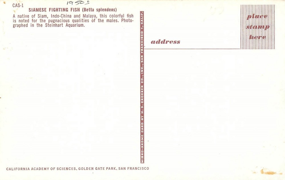 1950s Betta Splendens Siamese Fighting Fish Crocker Postcard 25-231 CAS-1