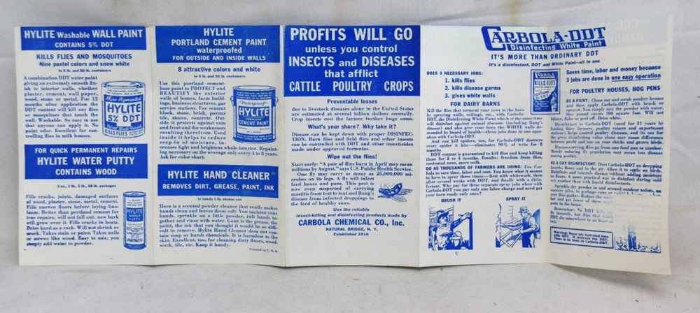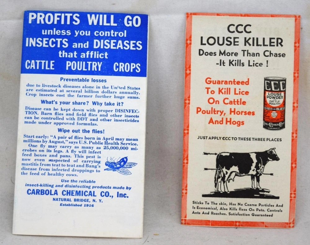 1950s Carbola Chemcial Co Natural Bridge NY Insecticide & Cattle Louse Killer Ad 1950s Carbola Chemcial Co Natural Bridge NY Insecticide & Cattle Louse Killer Ad Click images to enlarge Description In NM (9) condition NOS. Louse killer sheet - 6" x 3 1/8" Profits Will Go pamphlet - 6" x 3 1/2" Attention International bidders, we only accept international sales through the Global Shipping Program. Please visit my About M e Page! For items bid over $100.00 shipping insurance will be included at no extra cost. This only applies to items purchased within the United States and not to international sales. My Policies: Combine with other auctions I have listed and save on shipping charges. You won't be disappointed. Satisfaction guaranteed. Bid with confidence (check my feedback). Any questions, please email me. You can be assured that we pack very carefully for safe shipment. - Most of the items we sell on Ebay are from estates. We do not repair, repaint or heavy clean our estate finds. Many good antiques and collectibles get damaged by over zealous cleaning, and poor or improper repair attempts. We will describe any flaws and provide adequate photo details to accurately show what we are selling. Condition score: Mint (M)=10 Near Mint (NM)=9 Excellent (E)=8 Very Good (VG)=7 Better that G but below VG=6 Good (G)=5 Fair (F)=4 Poor (P)=3 Really Trashed=2 Hurts to think about it=1 Insurance should also be included if desired. Thank you and good luck! Payment I accept Paypal, the preferred method for Ebay. Shipping I safely ship within 2 business days of payment received, unless otherwise stated upon notification. For International shipments please email me for rates. Terms of Sale We guarantee everything we sell to be accurately described. We take special care in packing but cannot be responsible for mishandling or damage in shipment caused by carrier error. Items lost in shipment will not be refunded unless insurance is purchased. About Us From the Heartland of America we search for unique finds at garage/estate sales from some of the long established older estates in North Central Indiana. From collectibles, pottery, glass, sports memorabilia, postcards, railroad, advertising, and more we offer diverse finds weekly Contact Us Please email us if you have any questions. Images sell! Get Supersized Images & Free Image Hosting Create your brand with Auctiva's Customizable Templates. Attention Sellers - Get Templates Image Hosting, Scheduling at Auctiva.com. Track Page Views With Auctiva's Counter
