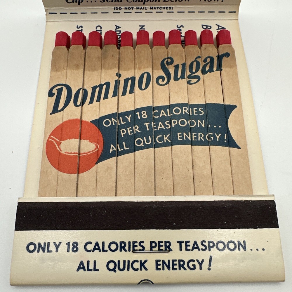 This vintage Domino Sugar Giant matchbook advertising Domino Sugar is a rare find for collectors. Measuring approximately 3 1/4" x 4", it features a full matchbook design with the iconic Domino Sugar logo. Made in the United States, this matchbook is a unique piece of American history that would make a great addition to any collection. The matchbook is in excellent shape and has been well-preserved over the years. It would make a great gift for anyone who loves vintage advertising or is a fan of Domino Sugar. Don't miss out on the opportunity to own this piece of American history. New old stock. See photos,