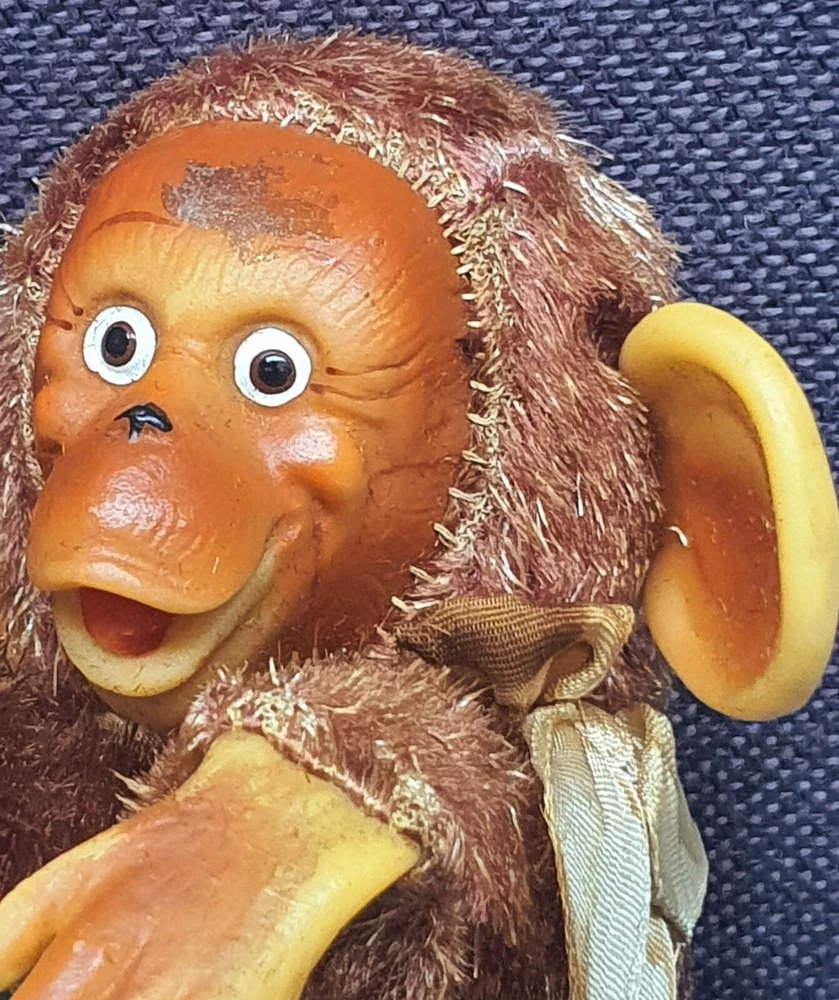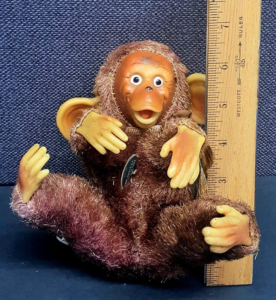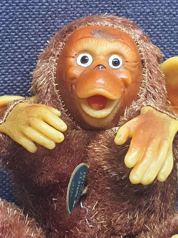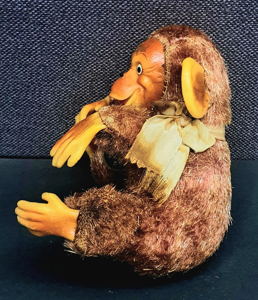 This Chimp doll is approx 6.5 in tall (sitting) with a rubber face and ears, and rubber hands/feet (its feet are literally hands). It is stuffed with a straw-like material, with a covering of some type of coarse material (not soft to the touch). The stitchings are in a somewhat delicate state and appear to have loosened slightly. It has a sewn-in “Made In Japan” cloth tag, as well as a paper tag with the name of the import company, “J.T. Blume”. This item is most likely from the 1950s.