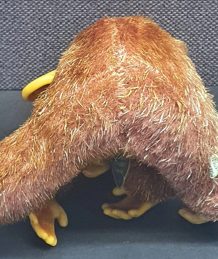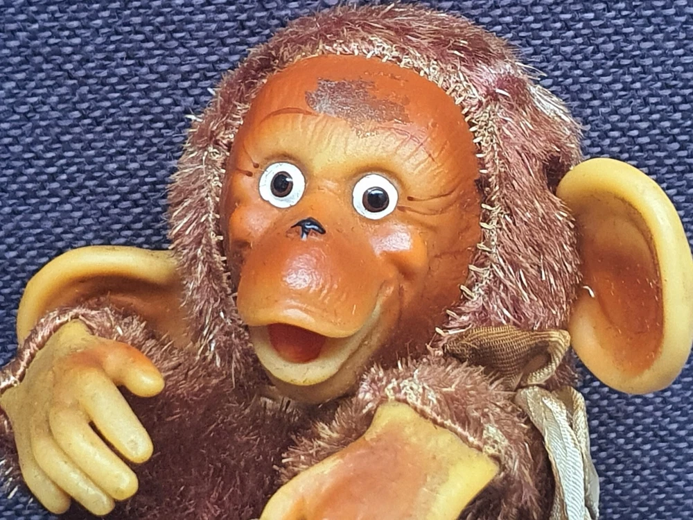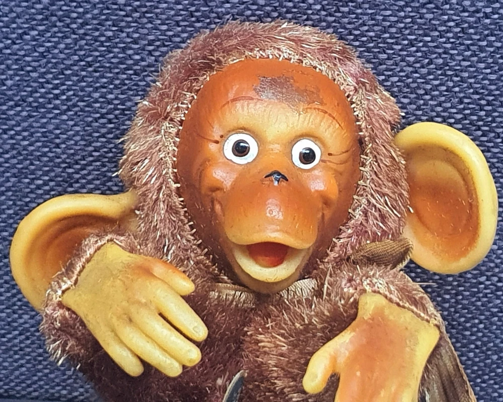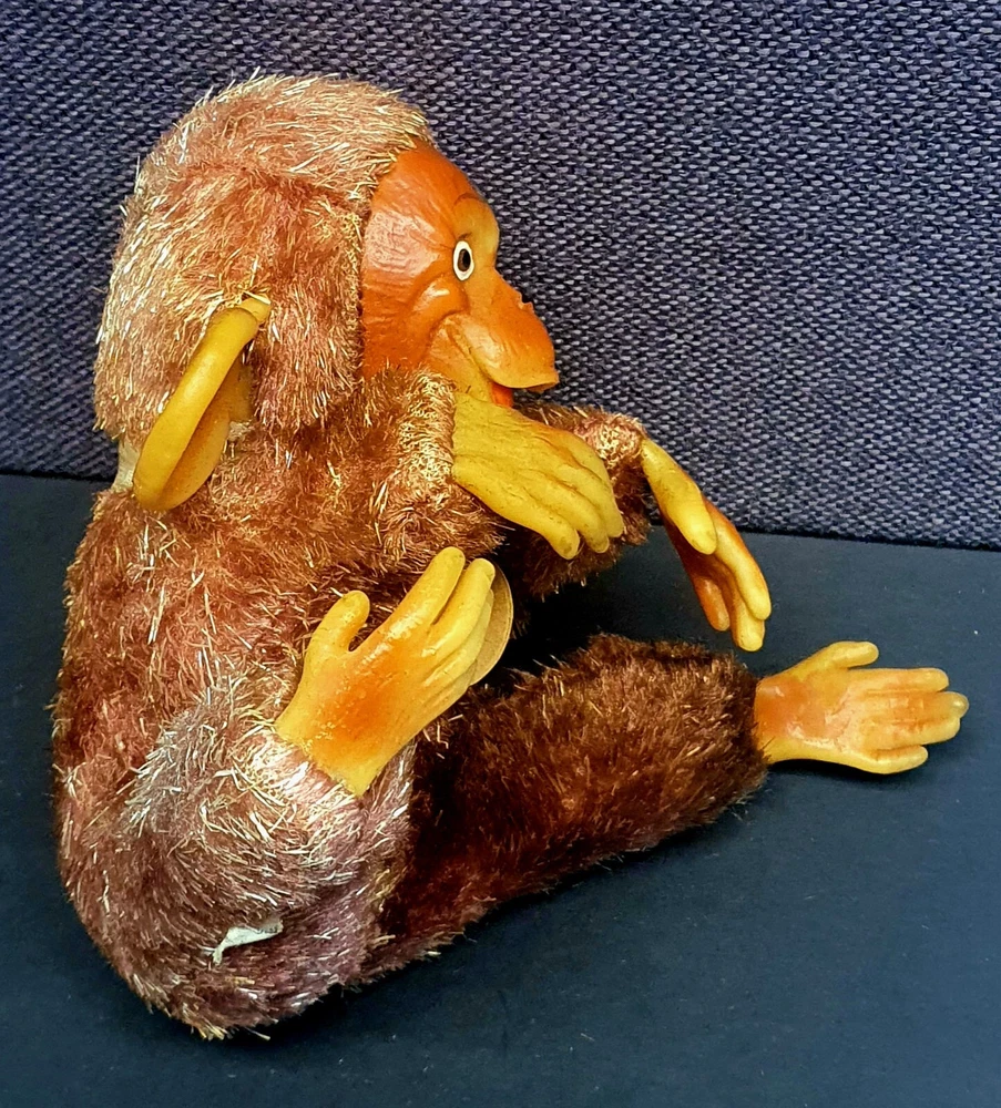 This Chimp doll is approx 6.5 in tall (sitting) with a rubber face and ears, and rubber hands/feet (its feet are literally hands). It is stuffed with a straw-like material, with a covering of some type of coarse material (not soft to the touch). The stitchings are in a somewhat delicate state and appear to have loosened slightly. It has a sewn-in “Made In Japan” cloth tag, as well as a paper tag with the name of the import company, “J.T. Blume”. This item is most likely from the 1950s.