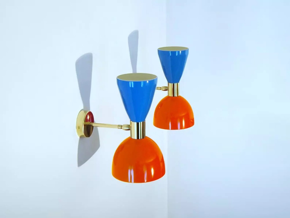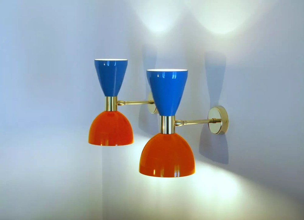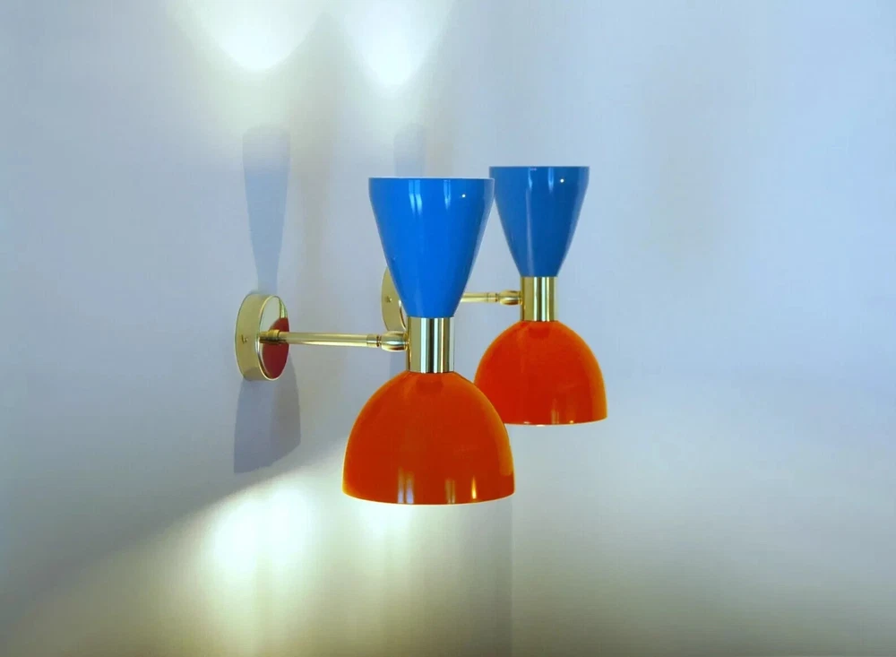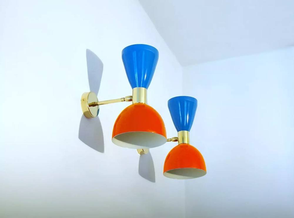 PRODUCTS DESCRIPTION 1950's Mid Century Brass Italian Diabolo Wall Sconce Light -Fixture 2 Bulb Pair We recommend 15W to 40W max. Light bulbs are not included. We hand craft all of our light fixtures. Wall Scones Table Light and chandelier has been made with brass & Metal minor variations in finish are an inherent characteristic of such material and add to the beauty and uniqueness of the product. - Measurements is : Height 10.4" inches - Diameter 5.6'' inches - Road Space From Wall 6" Inches Wall Canopy Dia 4.5Inches Color:AS Show Material: brass & Metal Size: Height 26 Cm - Diameter 14 Cm - Note : All color are available in this light at request if you want to change color please contact US -Wall Fixture used standard candelabra E-12 light bulbs. For USA and E-14 Bulb Holder For Europe