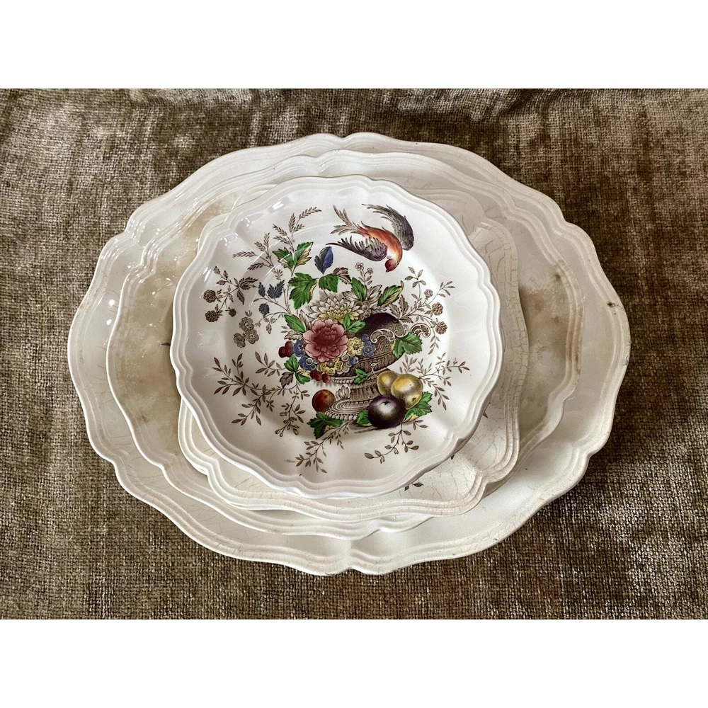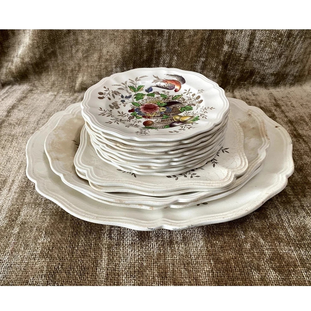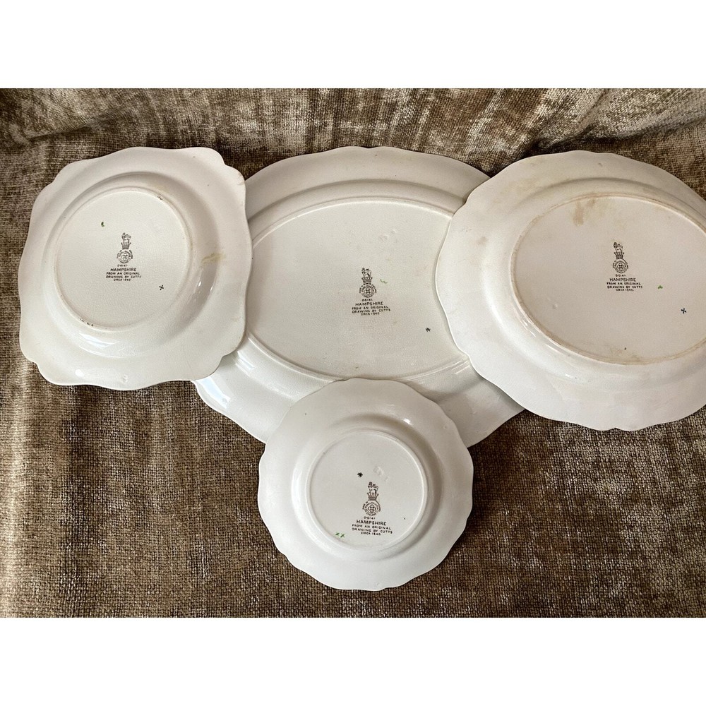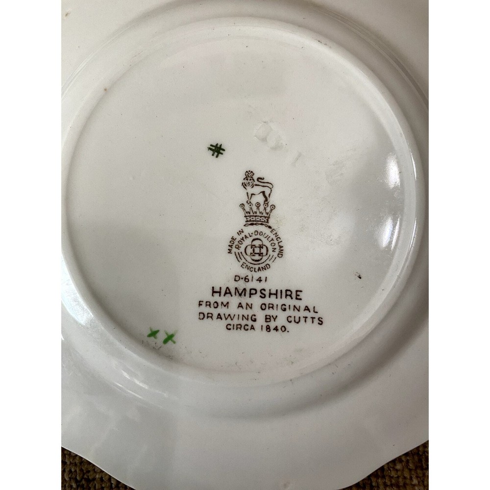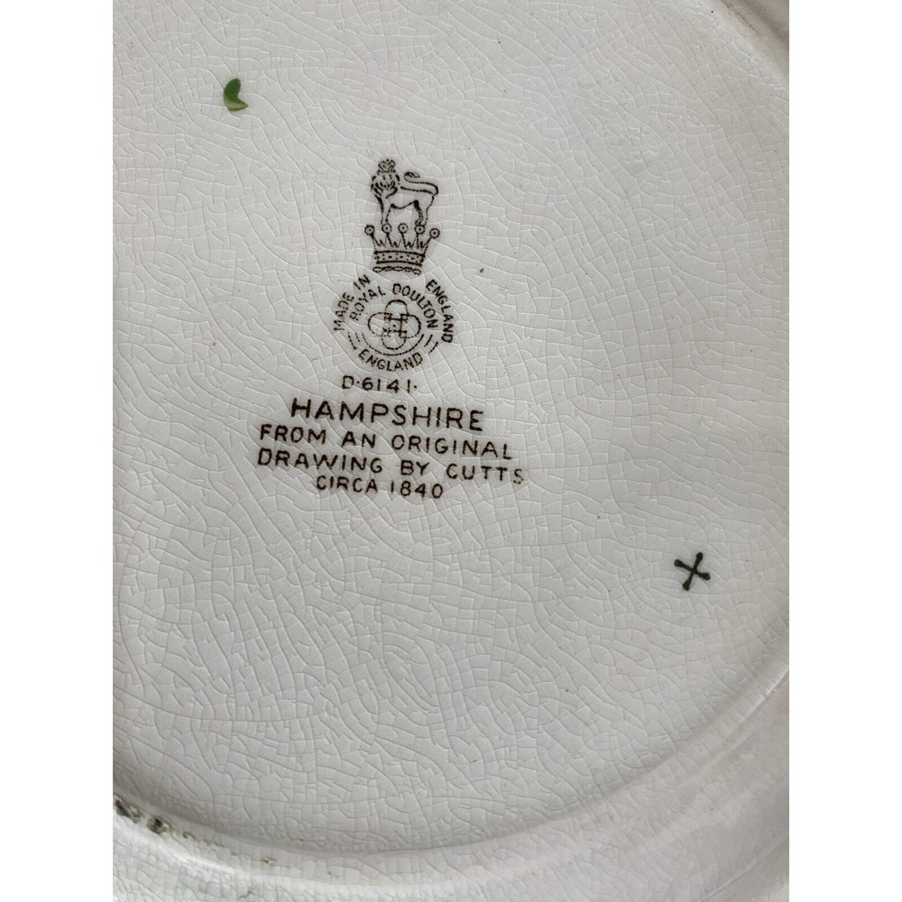 - **Vintage Charm**: Authentic 1950s Royal Doulton Hampshire Ceramic Dinnerware Set. - **Artistic Heritage**: Features an original Spode-inspired design with a red bird flying over a lush tureen of flowers and fruit. - **Collector's Detail**: Each piece marked with "Royal Doulton Hampshire, Made in England, D-6141" from drawings by Cutts circa 1840, including a distinctive crowned lion emblem. - **Set Composition**: Includes a 13.5x10.5” oval scalloped-edge platter, an 11"x9" smaller oval platter, two 8"x8" square salad plates, and ten 6” dessert plates. - **Graceful Aging**: Items show slight crackling and signs of use, contributing to their antique appeal while suggesting a storied past. - **Free Shipping**: Delivered straight to your door at no extra cost, ready to add historical elegance to your table setting or collection. Enhance your dining experience or display setup with this timeless Royal Doulton set, blending durability with classic artwork. Condition: Pre-owned; used; plates have a slight crackled look in places that look natural and could use some cleaning, and some look like they may have spent too much time in an oven; still beautiful in all its antique glory.