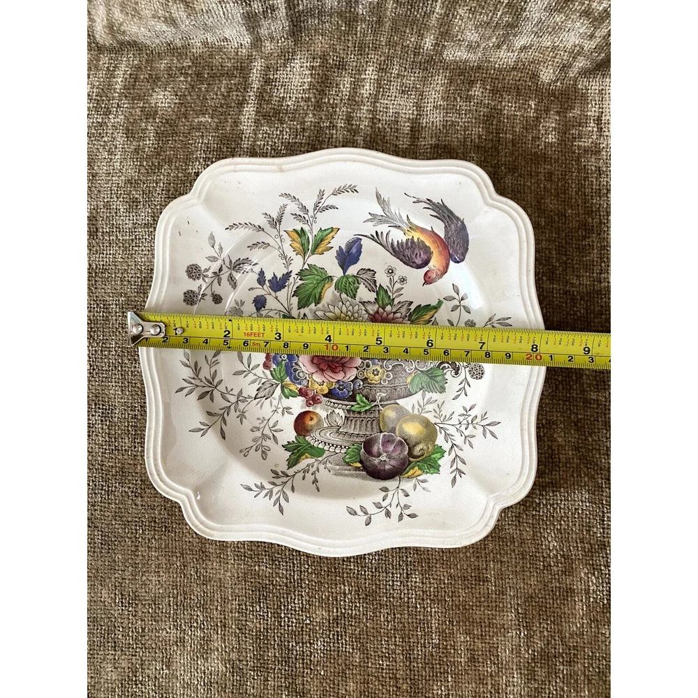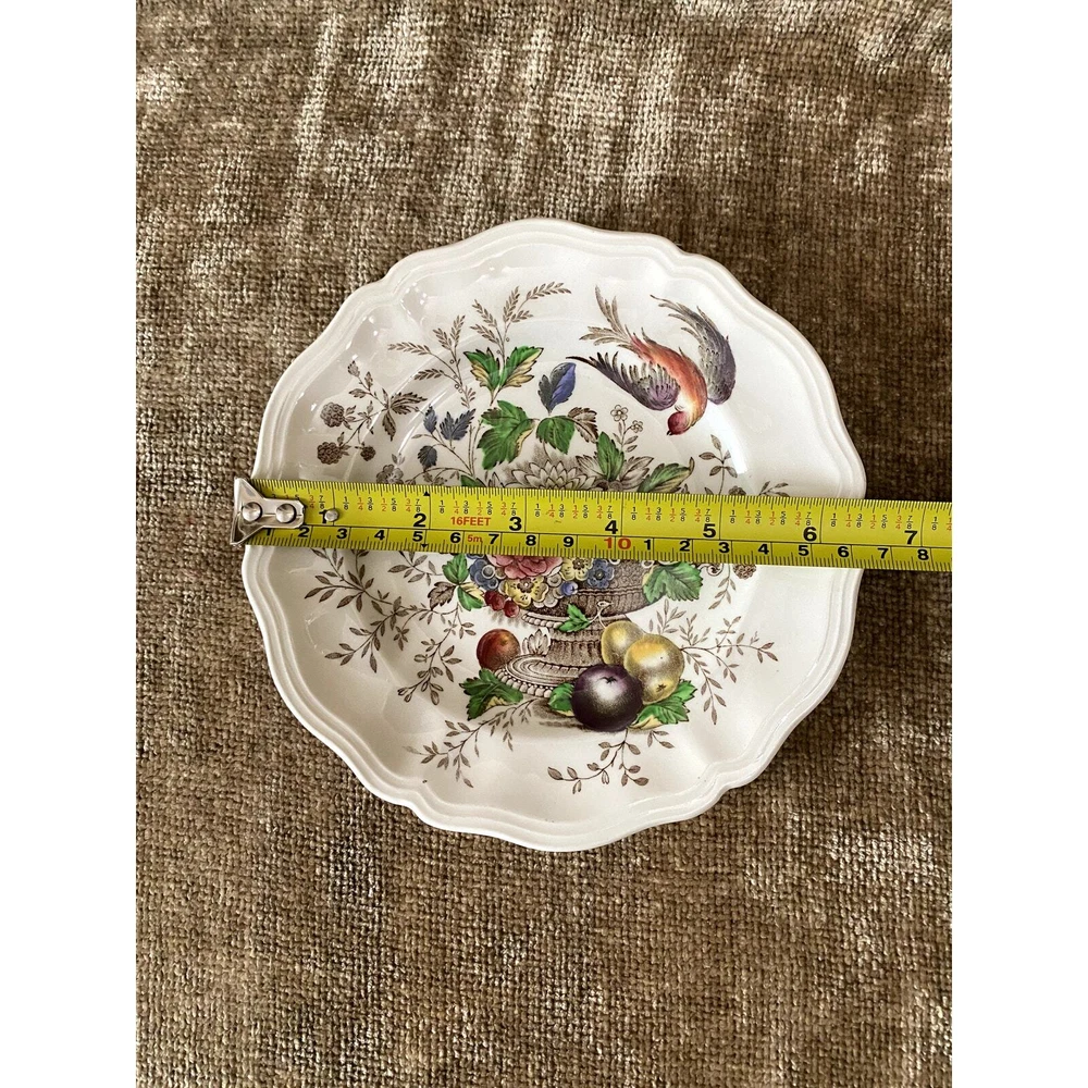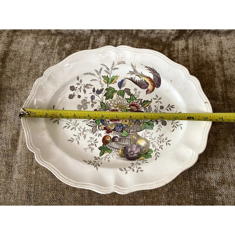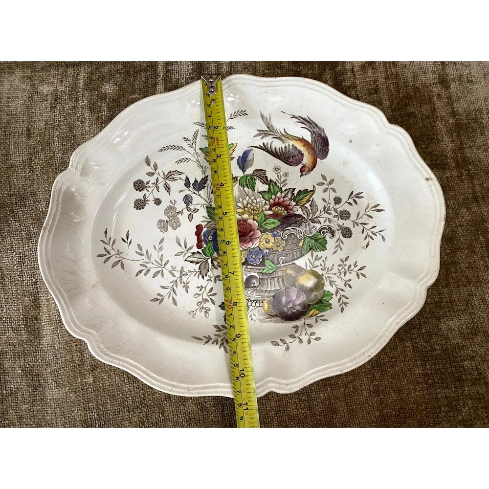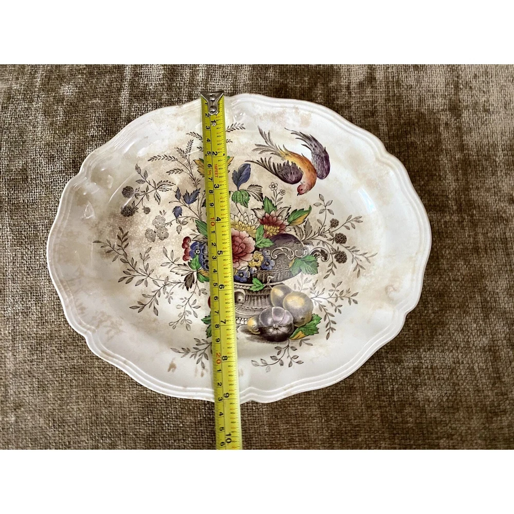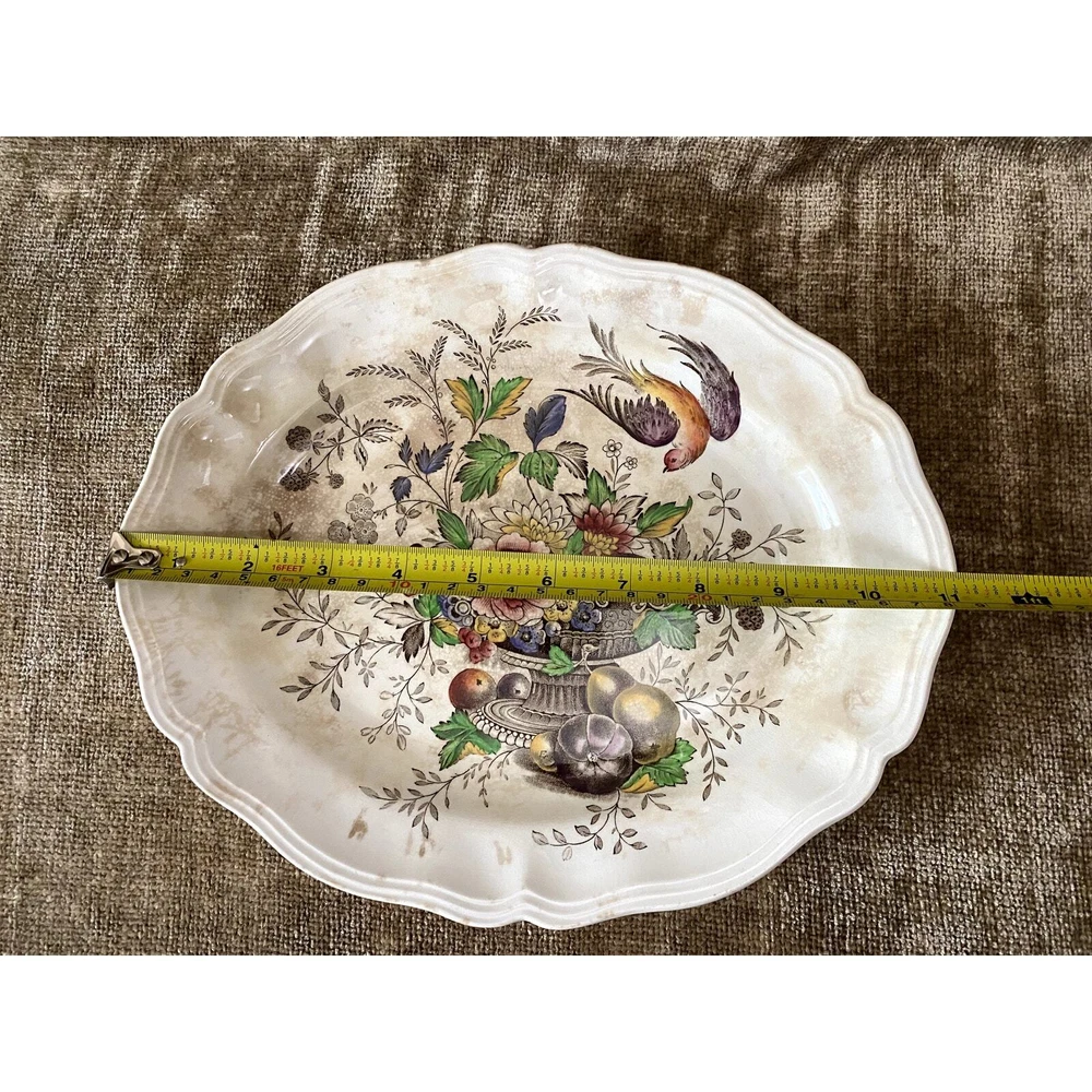- **Vintage Charm**: Authentic 1950s Royal Doulton Hampshire Ceramic Dinnerware Set. - **Artistic Heritage**: Features an original Spode-inspired design with a red bird flying over a lush tureen of flowers and fruit. - **Collector's Detail**: Each piece marked with "Royal Doulton Hampshire, Made in England, D-6141" from drawings by Cutts circa 1840, including a distinctive crowned lion emblem. - **Set Composition**: Includes a 13.5x10.5” oval scalloped-edge platter, an 11"x9" smaller oval platter, two 8"x8" square salad plates, and ten 6” dessert plates. - **Graceful Aging**: Items show slight crackling and signs of use, contributing to their antique appeal while suggesting a storied past. - **Free Shipping**: Delivered straight to your door at no extra cost, ready to add historical elegance to your table setting or collection. Enhance your dining experience or display setup with this timeless Royal Doulton set, blending durability with classic artwork. Condition: Pre-owned; used; plates have a slight crackled look in places that look natural and could use some cleaning, and some look like they may have spent too much time in an oven; still beautiful in all its antique glory.
