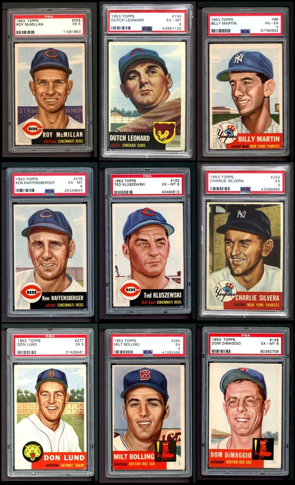 This set contains the following cards 1953 Topps #1 Jackie Robinson PSA 7 - NM Front Back 1953 Topps #2 Luke Easter 4 - VG/EX Front Back 1953 Topps #3 George Crowe 4 - VG/EX Front Back 1953 Topps #4 Ben Wade 6 - EX/MT Front Back 1953 Topps #5 Joe Dobson PSA 5 - EX Front Back 1953 Topps #6 Sam Jones 5 - EX Front Back 1953 Topps #7 Bob Borkowski PSA 6 - EX/MT Front Back 1953 Topps #8 Clem Koshorek 6 - EX/MT Front Back 1953 Topps #9 Joe Collins 5 - EX Front Back 1953 Topps #10 Smoky Burgess 4 - VG/EX Front Back 1953 Topps #11 Sal Yvars 6 - EX/MT Front Back 1953 Topps #12 Howie Judson 4 - VG/EX Front Back 1953 Topps #13 Connie Marrero 4 - VG/EX Front Back 1953 Topps #14 Clem Labine 3 - VG Front Back 1953 Topps #15 Bobo Newsom 6 - EX/MT Front Back 1953 Topps #16 Peanuts Lowrey 4 - VG/EX Front Back 1953 Topps #17 Billy Hitchcock 6 - EX/MT Front Back 1953 Topps #18 Ted Lepcio 4 - VG/EX Front Back 1953 Topps #19 Mel Parnell 3 - VG Front Back 1953 Topps #20 Hank Thompson 5 - EX Front Back 1953 Topps #21 Billy Johnson 4 - VG/EX Front Back 1953 Topps #22 Howard Fox 4 - VG/EX Front Back 1953 Topps #23 Toby Atwell 4 - VG/EX Front Back 1953 Topps #24 Ferris Fain PSA 5 - EX Front Back 1953 Topps #25 Ray Boone PSA 5 - EX Front Back 1953 Topps #26 Dale Mitchell 5 - EX Front Back 1953 Topps #27 Roy Campanella 7 - NM Front Back 1953 Topps #28 Eddie Pellagrini 5 - EX Front Back 1953 Topps #29 Hal Jeffcoat PSA 5.5 - EX+ Front Back 1953 Topps #30 Willard Nixon 4 - VG/EX Front Back 1953 Topps #31 Ewell Blackwell 6 - EX/MT Front Back 1953 Topps #32 Clyde Vollmer PSA 5 - EX Front Back 1953 Topps #33 Bob Kennedy PSA 6 - EX/MT Front Back 1953 Topps #34 George Shuba 5 - EX Front Back 1953 Topps #35 Irv Noren 6 - EX/MT Front Back 1953 Topps #36 Johnny Groth 4 - VG/EX Front Back 1953 Topps #37 Eddie Mathews PSA 6 - EX/MT Front Back 1953 Topps #38 Jim Hearn 4 - VG/EX Front Back 1953 Topps #39 Eddie Miksis 6 - EX/MT Front Back 1953 Topps #40 John Lipon 4 - VG/EX Front Back 1953 Topps #41 Enos Slaughter 5 - EX Front Back 1953 Topps #42 Gus Zernial 4 - VG/EX Front Back 1953 Topps #43 Gil McDougald 4 - VG/EX Front Back 1953 Topps #44 Ellis Kinder 4 - VG/EX Front Back 1953 Topps #45 Grady Hatton 6 - EX/MT Front Back 1953 Topps #46 Johnny Klippstein 5 - EX Front Back 1953 Topps #47 Bubba Church 5 - EX Front Back 1953 Topps #48 Bobby Del Greco 5 - EX Front Back 1953 Topps #49 Faye Throneberry 6 - EX/MT Front Back 1953 Topps #50 Chuck Dressen 6 - EX/MT Front Back 1953 Topps #51 Frank Campos PSA 5 - EX Front Back 1953 Topps #52 Ted Gray PSA 6 - EX/MT Front Back 1953 Topps #53 Sherm Lollar 4 - VG/EX Front Back 1953 Topps #54 Bob Feller 5 - EX Front Back 1953 Topps #55 Mickey McDermott 5 - EX Front Back 1953 Topps #56 Gerry Staley 4 - VG/EX Front Back 1953 Topps #57 Carl Scheib 5 - EX Front Back 1953 Topps #58 George Metkovich 4 - VG/EX Front Back 1953 Topps #59 Karl Drews 5 - EX Front Back 1953 Topps #60 Cloyd Boyer 5 - EX Front Back 1953 Topps #61 Early Wynn 3 - VG Front Back 1953 Topps #62 Monte Irvin 3 - VG Front Back 1953 Topps #63 Gus Niarhos 4 - VG/EX Front Back 1953 Topps #64 Dave Philley 6 - EX/MT Front Back 1953 Topps #65 Earl Harrist 5 - EX Front Back 1953 Topps #66 Minnie Minoso 4 - VG/EX Front Back 1953 Topps #67 Roy Sievers 6 - EX/MT Front Back 1953 Topps #68 Del Rice 4 - VG/EX Front Back 1953 Topps #69 Dick Brodowski PSA 6 - EX/MT Front Back 1953 Topps #70 Ed Yuhas 4 - VG/EX Front Back 1953 Topps #71 Tony Bartirome 5 - EX Front Back 1953 Topps #72 Fred Hutchinson 5 - EX Front Back 1953 Topps #73 Eddie Robinson 5 - EX Front Back 1953 Topps #74 Joe Rossi 5 - EX Front Back 1953 Topps #75 Mike Garcia PSA 6 - EX/MT Front Back 1953 Topps #76 Pee Wee Reese PSA 4 - VG/EX Front Back 1953 Topps #77 Johnny Mize 6 - EX/MT Front Back 1953 Topps #78 Al Red Schoendienst 4 - VG/EX Front Back 1953 Topps #79 John Wyrostek 4 - VG/EX Front Back 1953 Topps #80 Jim Hegan 5 - EX Front Back 1953 Topps #81 Joe Black 5 - EX Front Back 1953 Topps #82 Mickey Mantle PSA 5 - EX Front Back 1953 Topps #83 Howie Pollet 5 - EX Front Back 1953 Topps #84 Bob Hooper 5 - EX Front Back 1953 Topps #85 Bob Morgan 5 - EX Front Back 1953 Topps #86 Billy Martin PSA 4 - VG/EX Front Back 1953 Topps #87 Eddie Lopat 4 - VG/EX Front Back 1953 Topps #88 Willie Jones 5 - EX Front Back 1953 Topps #89 Chuck Stobbs 6 - EX/MT Front Back 1953 Topps #90 Hank Edwards 5 - EX Front Back 1953 Topps #91 Ebba St. Claire 5 - EX Front Back 1953 Topps #92 Paul Minner 5 - EX Front Back 1953 Topps #93 Hal Rice 3 - VG Front Back 1953 Topps #94 Bill Kennedy 5 - EX Front Back 1953 Topps #95 Willard Marshall 6 - EX/MT Front Back 1953 Topps #96 Virgil Trucks 5 - EX Front Back 1953 Topps #97 Don Kolloway 6 - EX/MT Front Back 1953 Topps #98 Cal Abrams 6 - EX/MT Front Back 1953 Topps #99 Dave Madison 5 - EX Front Back 1953 Topps #100 Bill Miller 5 - EX Front Back 1953 Topps #101 Ted Wilks 4 - VG/EX Front Back 1953 Topps #102 Connie Ryan 5 - EX Front Back 1953 Topps #103 Joe Astroth 5 - EX Front Back 1953 Topps #104 Yogi Berra PSA 5.5 - EX+ Front Back 1953 Topps #105 Joe Nuxhall 6 - EX/MT Front Back 1953 Topps #106 Johnny Antonelli 6 - EX/MT Front Back 1953 Topps #107 Danny O'Connell 4 - VG/EX Front Back 1953 Topps #108 Bob Porterfield 4 - VG/EX Front Back 1953 Topps #109 Al Dark PSA 5 - EX Front Back 1953 Topps #110 Herm Wehmeier 5 - EX Front Back 1953 Topps #111 Hank Sauer 4 - VG/EX Front Back 1953 Topps #112 Ned Garver 5 - EX Front Back 1953 Topps #113 Jerry Priddy PSA 6 - EX/MT Front Back 1953 Topps #114 Phil Rizzuto 4 - VG/EX Front Back 1953 Topps #115 George Spencer PSA 6 - EX/MT Front Back 1953 Topps #116 Frank Smith 4 - VG/EX Front Back 1953 Topps #117 Sid Gordon 5 - EX Front Back 1953 Topps #118 Gus Bell 5 - EX Front Back 1953 Topps #119 Johnny Sain PSA 4 - VG/EX Front Back 1953 Topps #120 Davey Williams 4 - VG/EX Front Back 1953 Topps #121 Walt Dropo 4 - VG/EX Front Back 1953 Topps #122 Elmer Valo PSA 6 - EX/MT Front Back 1953 Topps #123 Tommy Byrne 5 - EX Front Back 1953 Topps #
