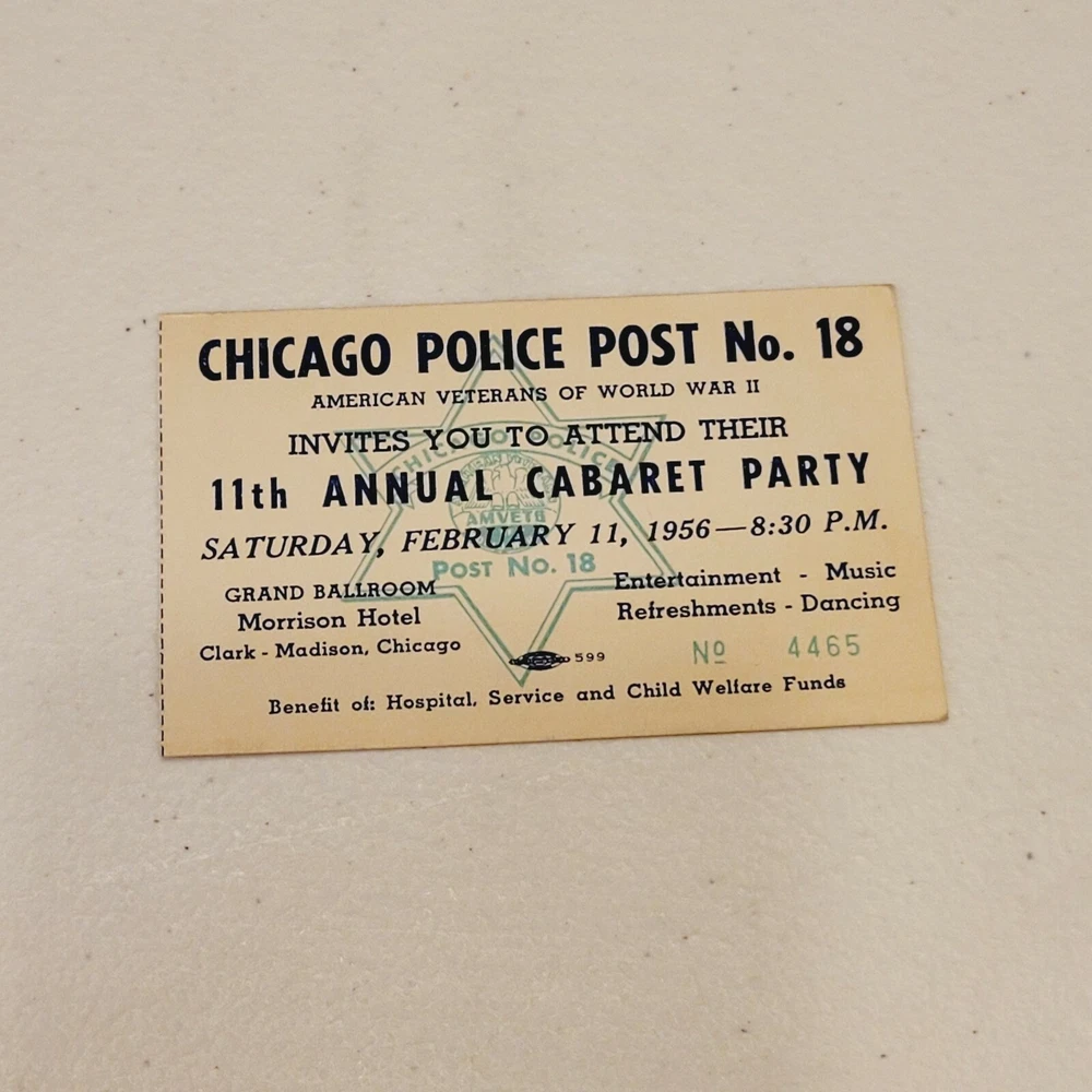 1956 Chicago Police 11th Annual Cabaret Party Ticket Stub