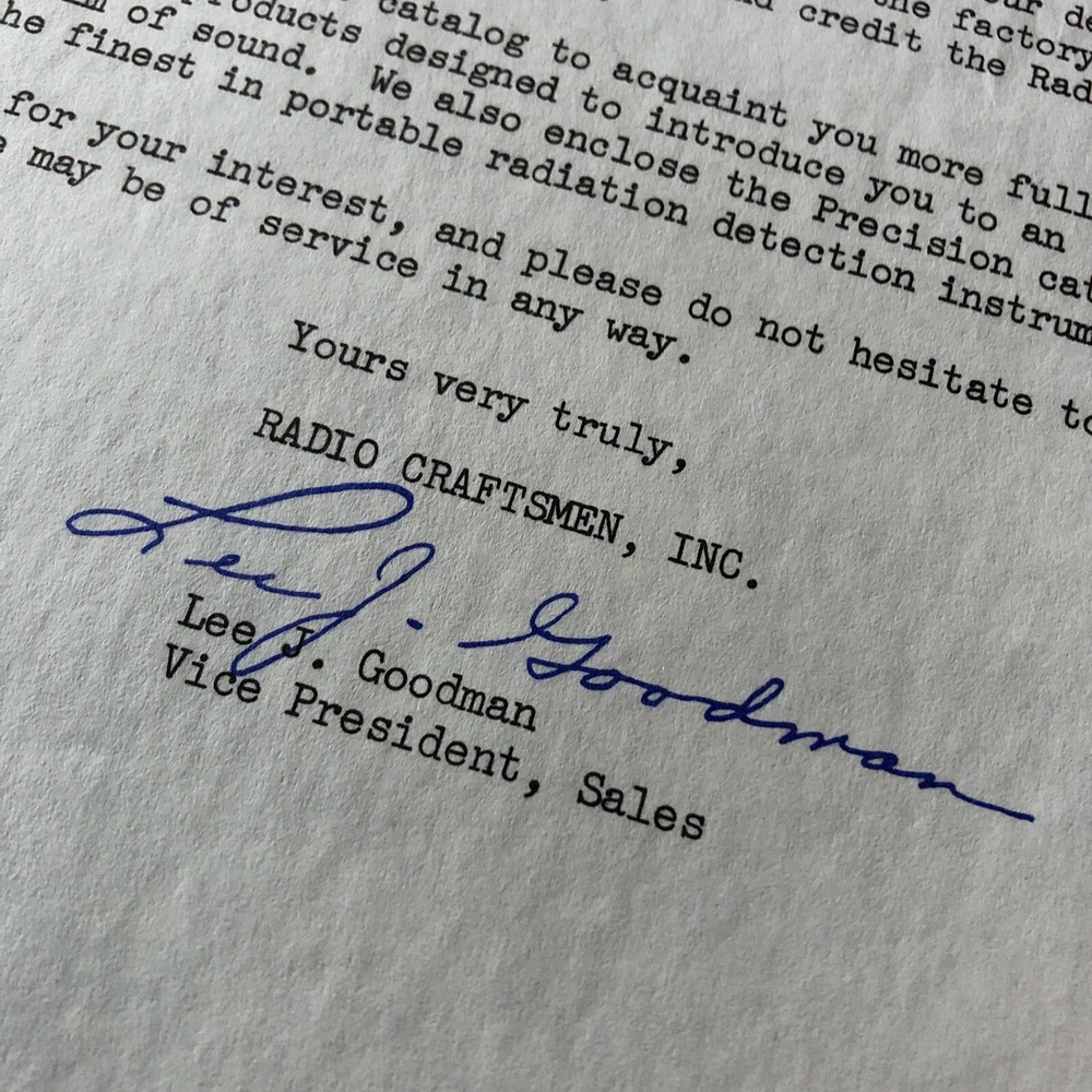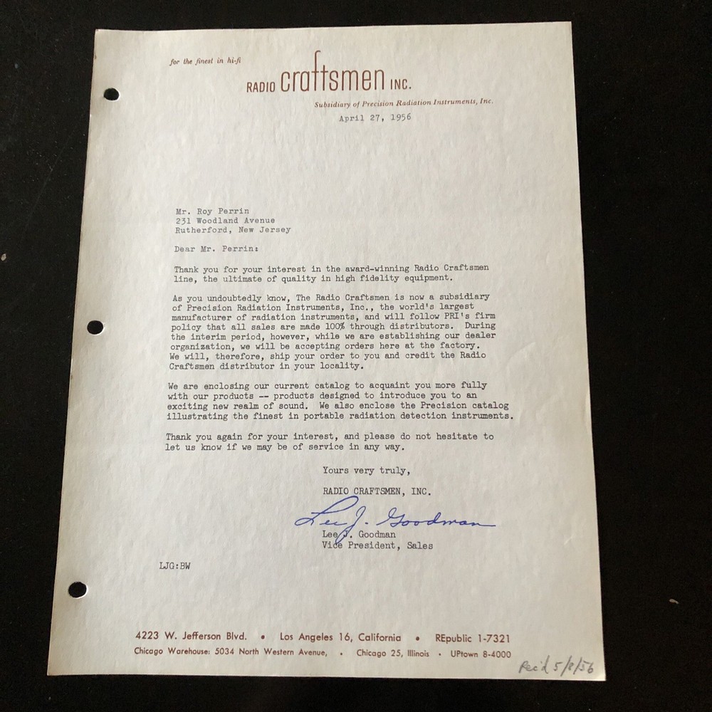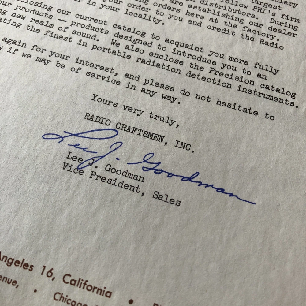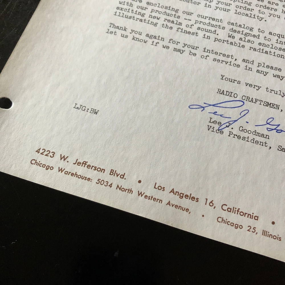 MAKE OFFER 1956 RADIO CRAFTSMEN Letterhead Stationery SIGNED LEE J GOODMAN VP ORIGINAL. Hole punched by original owner. Condition is Used. If there are any imperfections they are pointed out in the photos. See photos before bidding