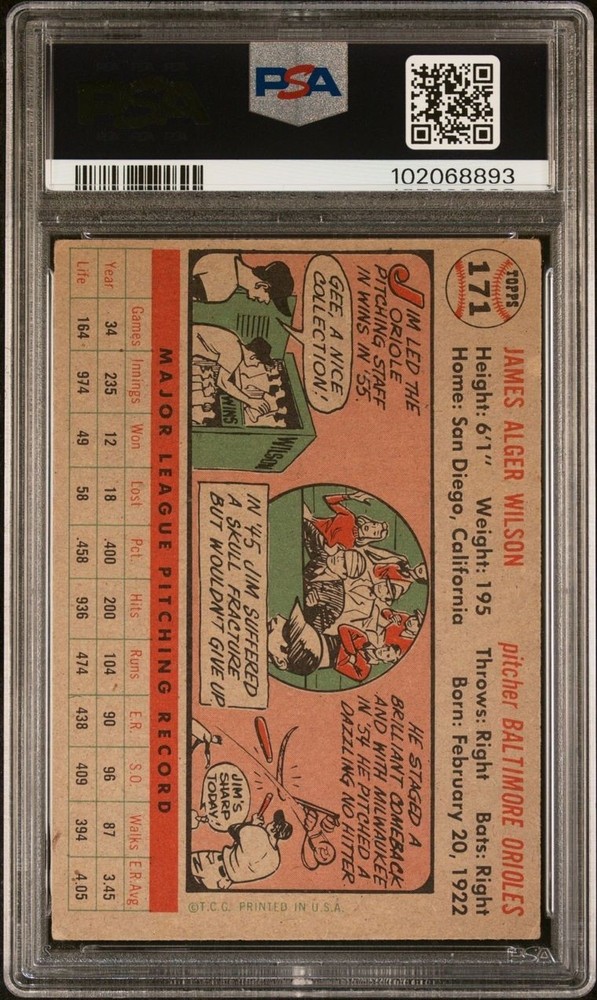 This is a 1956 Topps sports trading card featuring Jim Wilson of the Baltimore Orioles. The card is a part of the base set and has the number 171. It has been graded by PSA and received a score of 3. The card is not autographed and is in good condition.