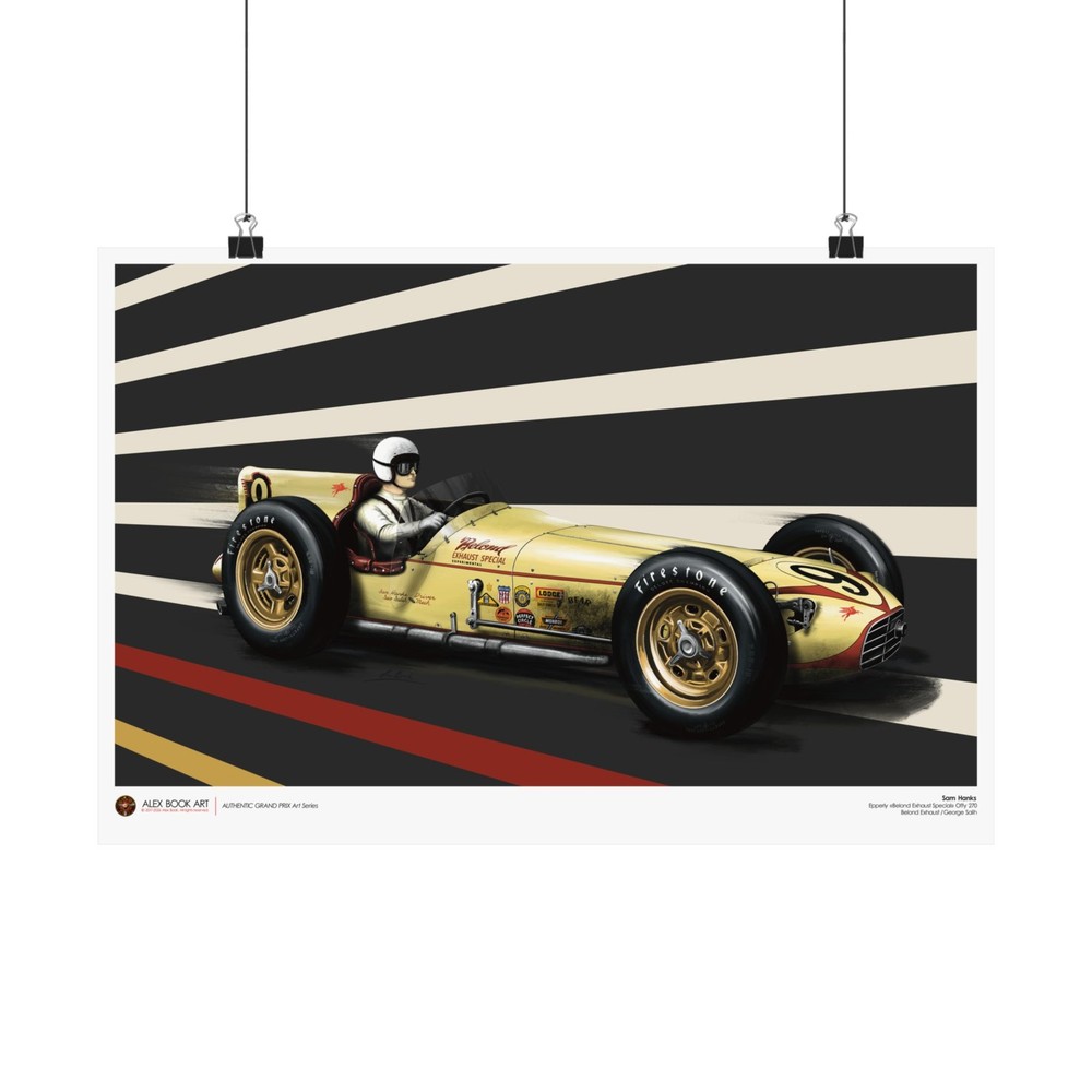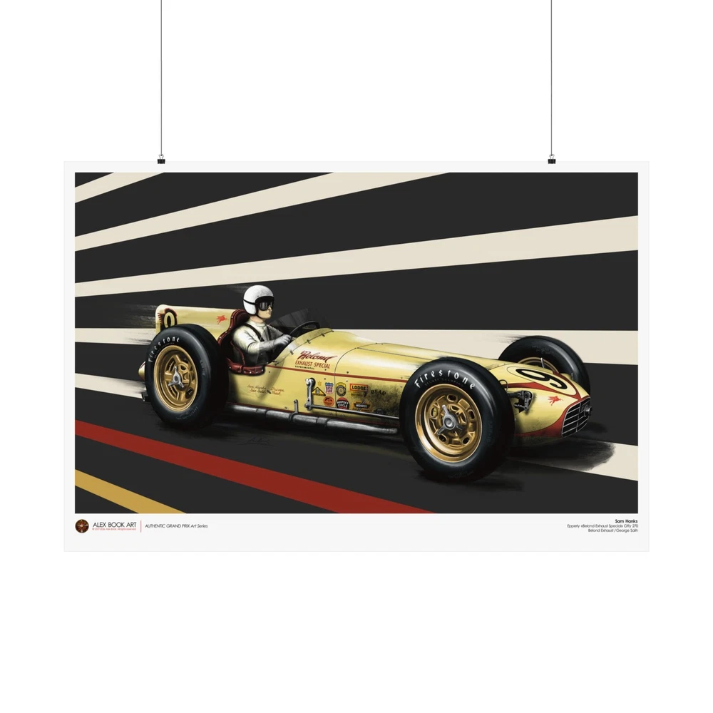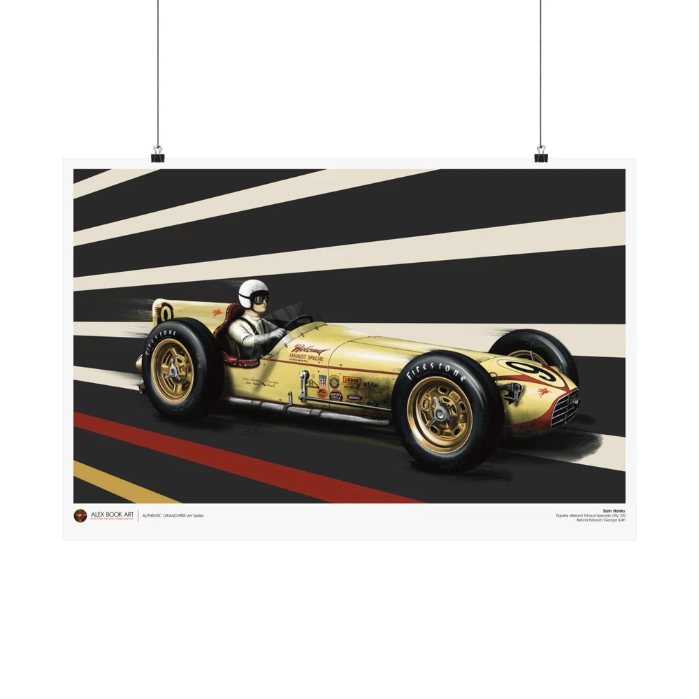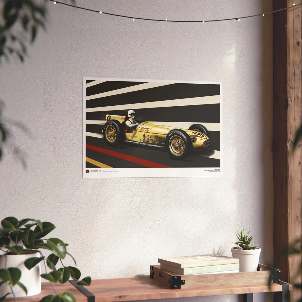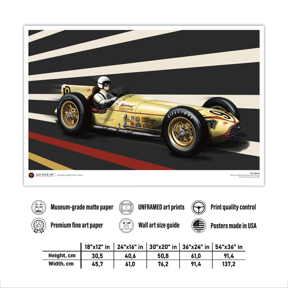 Driver: Sam Hanks Race Car: Epperly “Belond Exhaust Special” Offy 270 Team: Belond Exhaust / George Salih Authentic Grand Prix Art Series - an original art print by Alex Book created as part of a collection dedicated to the history of Formula 1 racing. The artwork is developed through a digital oil painting process that combines traditional painterly technique with illustration and design, keeping a clear, readable composition and a documentary approach to motorsport history. Sam Hanks and the Epperly "Belond Exhaust Special": A Revolution at the Brickyard The 1957 Indianapolis 500 remains a watershed moment in American open-wheel racing, marking the triumph of technical ingenuity and the crowning achievement of Sam Hanks. A veteran of the "Greatest Spectacle in Racing," Hanks secured his victory on his 13th attempt - a record for persistence at the time. A versatile master of midgets and sprint cars, and the 1953 AAA National Champion, Hanks announced his retirement in Victory Lane, ending a distinguished career at the very pinnacle of the sport. The vehicle that propelled him to this historic win was the Epperly "Belond Exhaust Special," a car that fundamentally altered Indy design philosophy. Engineered by George Salih and built by Quinn Epperly, the chassis featured a revolutionary "lay-down" engine configuration. By tilting the venerable 270 cubic-inch Offenhauser (Offy) DOHC inline-four engine at an angle of 18 degrees from the horizontal, Salih significantly lowered the car's center of gravity and reduced its frontal area. This offset placement also improved weight distribution for the left-turn-only oval, allowing for superior cornering speeds and aerodynamic efficiency. Starting from the middle of the first row, Hanks dominated the race. The "Lay-down Offy" proved so superior that it would win again in 1958 with Jimmy Bryan, validating Salih's radical departure from the traditional upright roadster. Hanks’ victory in the Belond Special stands as a testament to the era’s "backyard" engineering brilliance, where a clever mechanical shift could outpace the establishment and define a legacy. Each art print is produced on museum-grade 175 gsm matte fine art paper using high-quality archival inks for sharp detail, balanced contrast, and long-lasting durability. The print is professionally assembled in the USA from globally sourced materials under controlled production standards, carefully packed for safe shipping, and supplied without a frame so collectors can choose their preferred presentation. EU representative : HONSON VENTURES LIMITED, 3, Gnaftis House flat 102, Limassol, Mesa Geitonia, 4003, CY Product information : Generic brand, 2 year warranty in EU and Northern Ireland as per Directive 1999/44/EC Care instructions : If the poster does gather any dust, you may wipe it off gently with a clean, dry cloth.
