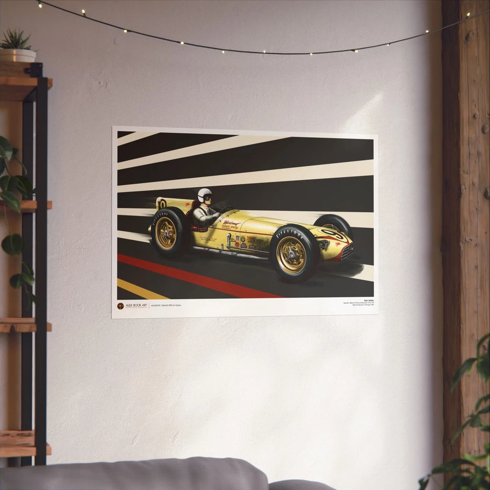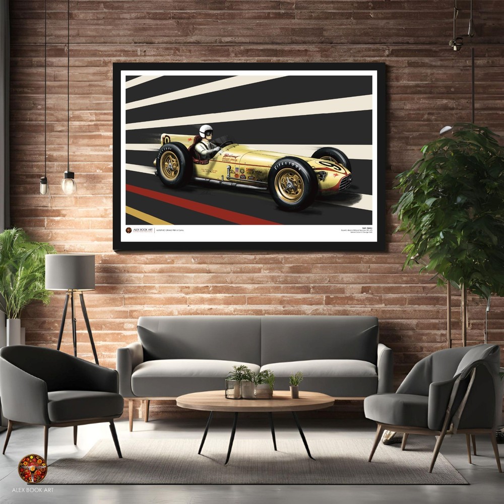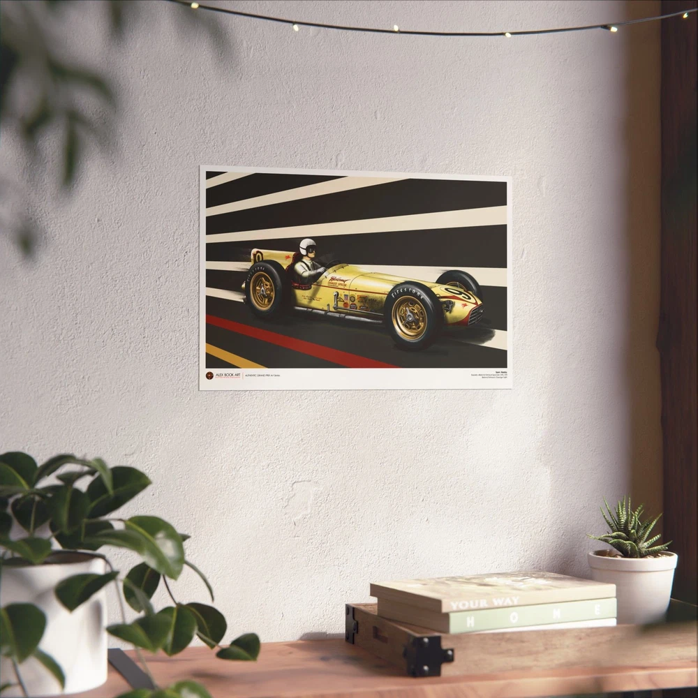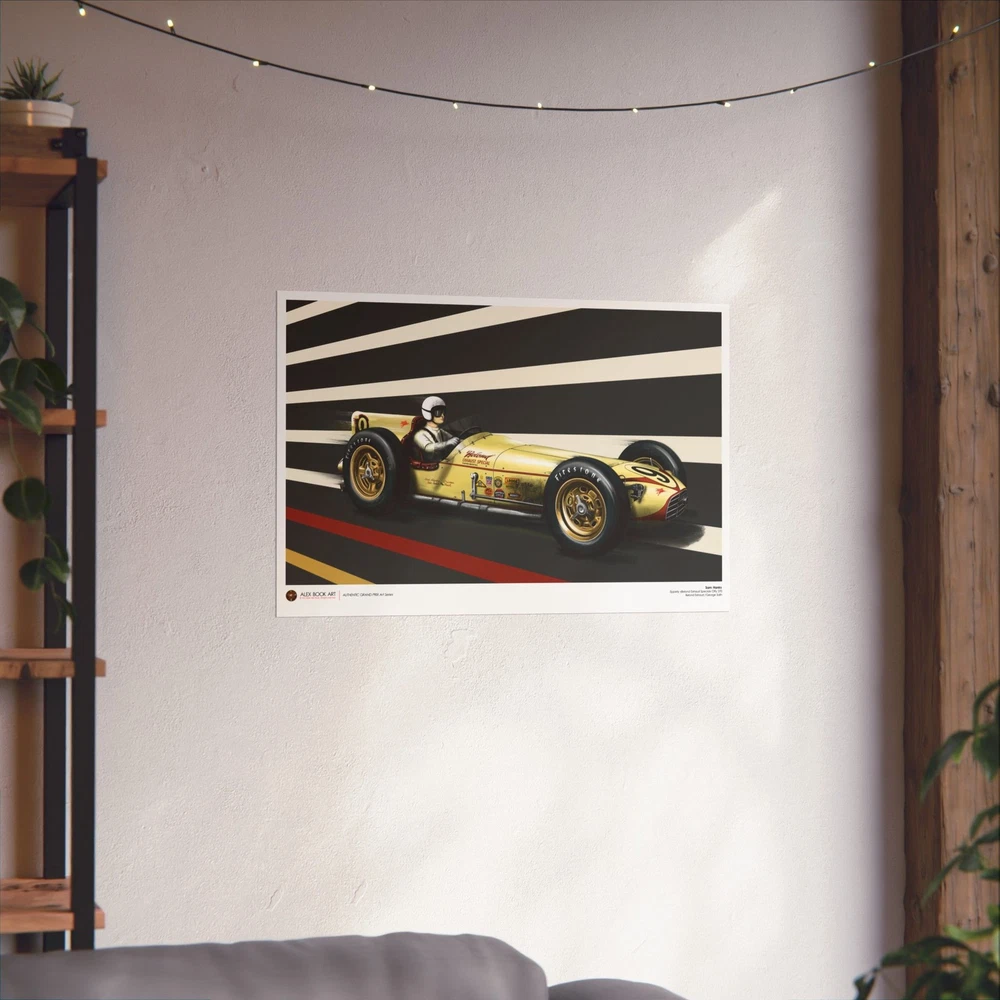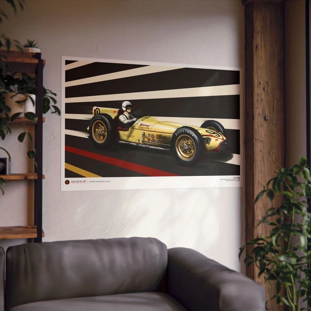 Driver: Sam Hanks Race Car: Epperly “Belond Exhaust Special” Offy 270 Team: Belond Exhaust / George Salih Authentic Grand Prix Art Series - an original art print by Alex Book created as part of a collection dedicated to the history of Formula 1 racing. The artwork is developed through a digital oil painting process that combines traditional painterly technique with illustration and design, keeping a clear, readable composition and a documentary approach to motorsport history. Sam Hanks and the Epperly "Belond Exhaust Special": A Revolution at the Brickyard The 1957 Indianapolis 500 remains a watershed moment in American open-wheel racing, marking the triumph of technical ingenuity and the crowning achievement of Sam Hanks. A veteran of the "Greatest Spectacle in Racing," Hanks secured his victory on his 13th attempt - a record for persistence at the time. A versatile master of midgets and sprint cars, and the 1953 AAA National Champion, Hanks announced his retirement in Victory Lane, ending a distinguished career at the very pinnacle of the sport. The vehicle that propelled him to this historic win was the Epperly "Belond Exhaust Special," a car that fundamentally altered Indy design philosophy. Engineered by George Salih and built by Quinn Epperly, the chassis featured a revolutionary "lay-down" engine configuration. By tilting the venerable 270 cubic-inch Offenhauser (Offy) DOHC inline-four engine at an angle of 18 degrees from the horizontal, Salih significantly lowered the car's center of gravity and reduced its frontal area. This offset placement also improved weight distribution for the left-turn-only oval, allowing for superior cornering speeds and aerodynamic efficiency. Starting from the middle of the first row, Hanks dominated the race. The "Lay-down Offy" proved so superior that it would win again in 1958 with Jimmy Bryan, validating Salih's radical departure from the traditional upright roadster. Hanks’ victory in the Belond Special stands as a testament to the era’s "backyard" engineering brilliance, where a clever mechanical shift could outpace the establishment and define a legacy. Each art print is produced on museum-grade 175 gsm matte fine art paper using high-quality archival inks for sharp detail, balanced contrast, and long-lasting durability. The print is professionally assembled in the USA from globally sourced materials under controlled production standards, carefully packed for safe shipping, and supplied without a frame so collectors can choose their preferred presentation. EU representative : HONSON VENTURES LIMITED, 3, Gnaftis House flat 102, Limassol, Mesa Geitonia, 4003, CY Product information : Generic brand, 2 year warranty in EU and Northern Ireland as per Directive 1999/44/EC Care instructions : If the poster does gather any dust, you may wipe it off gently with a clean, dry cloth.
