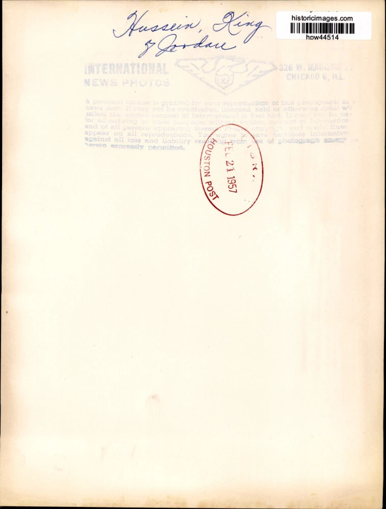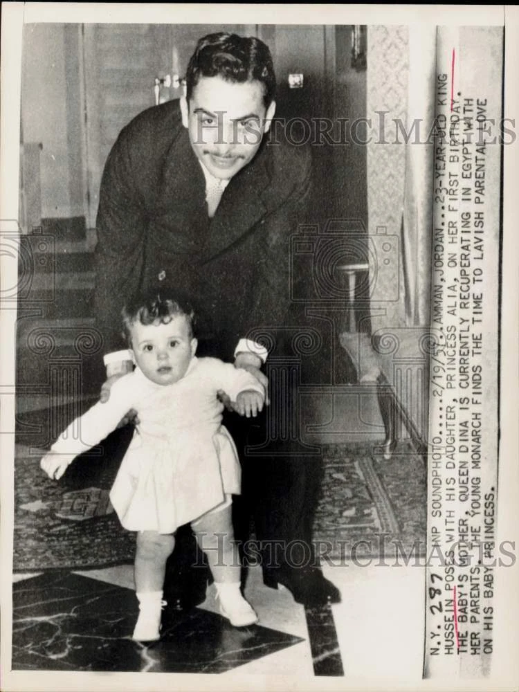 ebay template Note: Please study the images carefully to determine the condition of this vintage photograph, as it may not be in perfect condition. It may contain wrinkles, cracks, and possibly even tears due to its age and how it was handled before it got to us. A scanner may interpret colors and contrast differently than human eyes will, so it is possible that the actual photograph may be slightly darker or lighter in person. This vintage photograph is offered for sale as a collectible item and conveys no transfer of copyright. 1957 Press Photo Jordan's King Hussein poses with daughter Princess Alia. This is an original press photo. Amman, Jordan: 23-year-old King Hussein poses with his daughter, Princess Alia, on her first birthday. The baby's mother, Queen Dina is currently recuperating in Egypt with her parents. The young monarch finds the time to lavish parental love on his baby princess. Photo measures 7 x 9.25inches. Photo is dated 02-19-1957. PHOTO FRONT PHOTO BACK Historic Images Part Number: hpw44514 Sell Smarter with Kyozou. Inventory and Ecommerce Management
