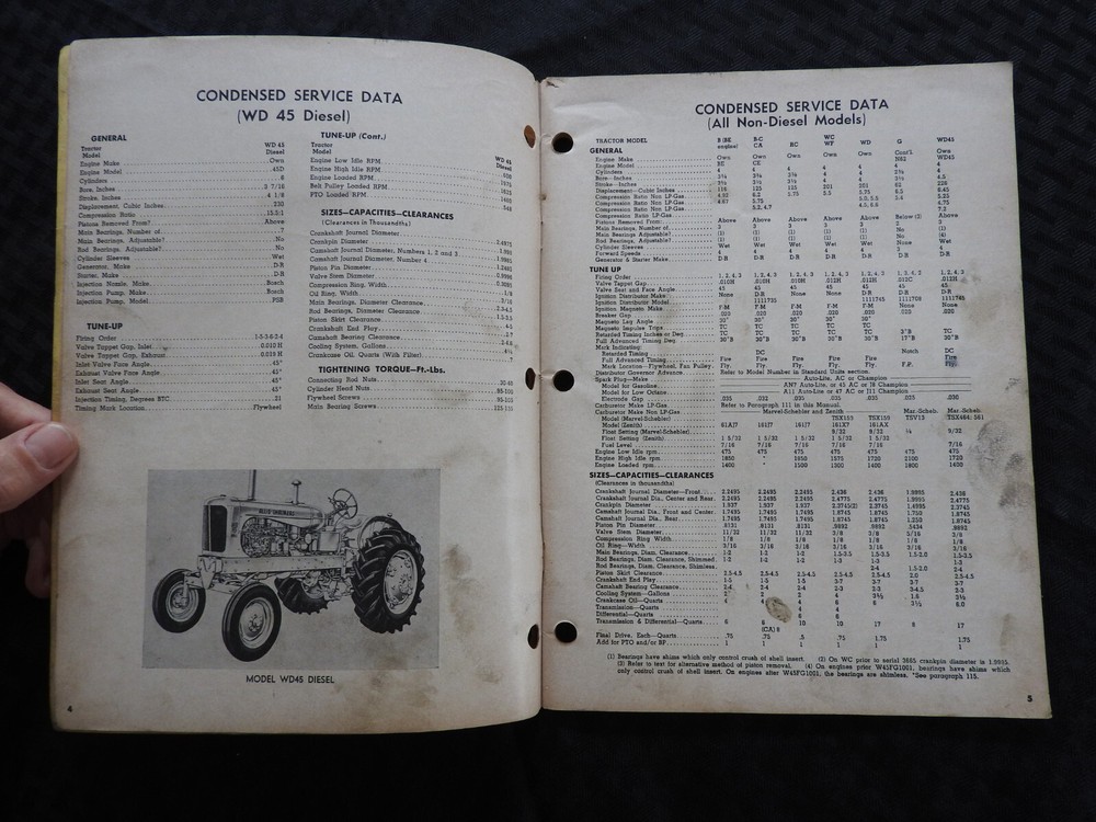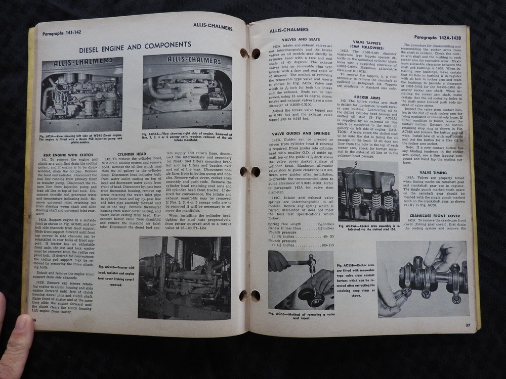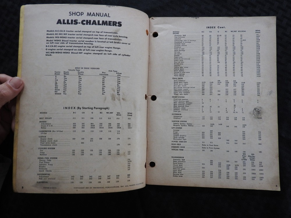 This is an ORIGINAL Allis-Chalmers B, C, CA, G, RC, WC, WD, WD 45, & WF Tractor I & T Service Shop Manual (1960 printing, AC-11). This manual has super illustrations as well as having in-depth repair and specification information for these classic AC tractors. The condition of the cover is good with soiling, but has NO tears or tatters. The spline is tight and intact with NO splits. Manual contains 90+ pages that are in GOOD shape. This manual is in GOOD overall condition. FREE S & H. Thanks for viewing.............Triple K