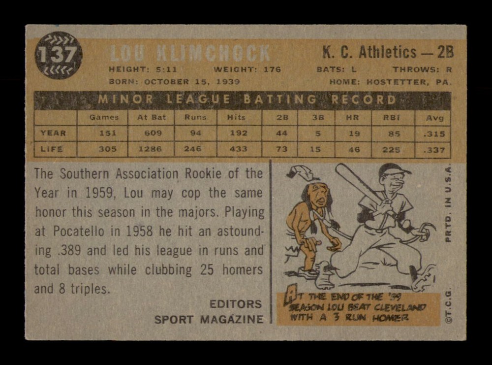 Sport: Baseball Player: Lou Klimchock Year: 1960 Card Manufacturer: Topps Graded: No Season: 1960 Series: Varies Original/Reprint: Original