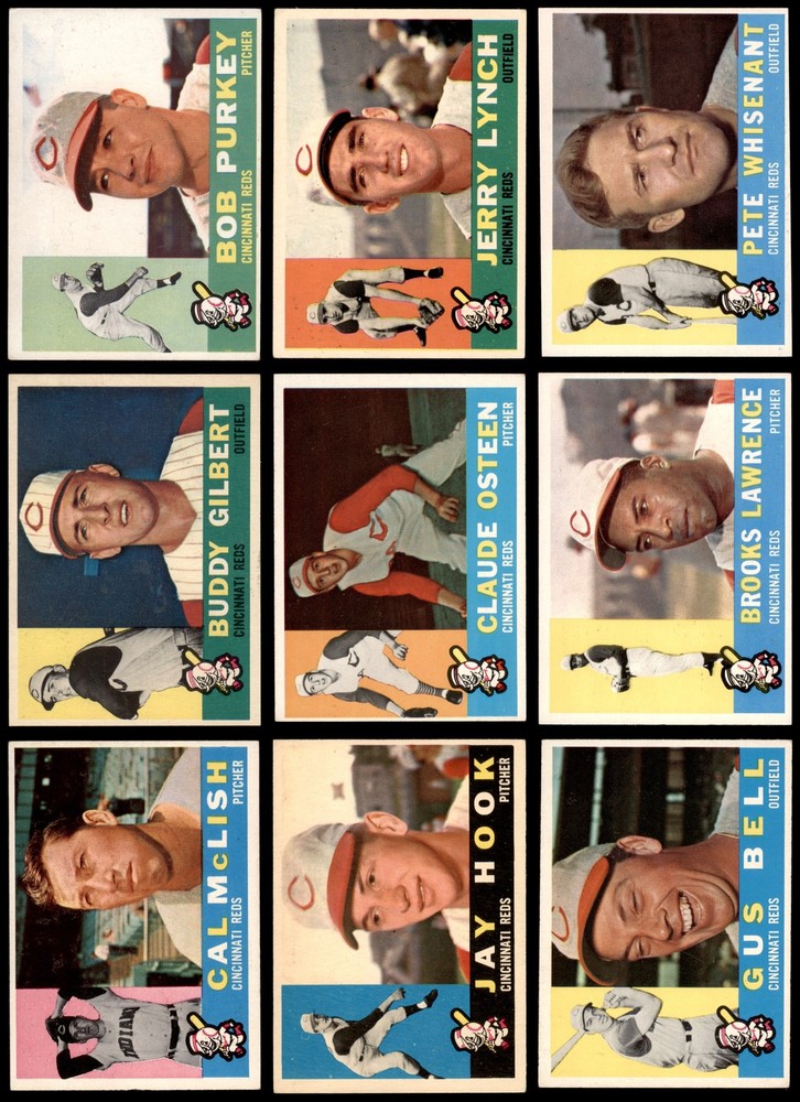 This set contains the following cards 1960 Topps #4 Bob Purkey 5 - EX Front Back 1960 Topps #21 Dutch Dotterer 7 - NM Front Back 1960 Topps #45 Roy McMillan 4 - VG/EX Front Back 1960 Topps #61 Eddie Kasko 6 - EX/MT Front Back 1960 Topps #110 Cal McLish 5 - EX Front Back 1960 Topps #119 - Leo Cardenas Rookie Star 7 - NM Front Back 1960 Topps #176 Vada Pinson 5 - EX Front Back 1960 Topps #187 Jay Hook 5 - EX Front Back 1960 Topps #198 Jerry Lynch 5 - EX Front Back 1960 Topps #206 Claude Osteen 5 - EX Front Back 1960 Topps #235 Gus Bell 5 - EX Front Back 1960 Topps #257 Gordy Coleman 6 - EX/MT Front Back 1960 Topps #282 Joe Nuxhall 5 - EX Front Back 1960 Topps #345 Don Newcombe 3 - VG Front Back 1960 Topps #359 Buddy Gilbert 5 - EX Front Back 1960 Topps #411 Ed Bailey 7 - NM Front Back 1960 Topps #424 Pete Whisenant 5 - EX Front Back 1960 Topps #434 Brooks Lawrence 6 - EX/MT Front Back 1960 Topps #449 Jim Brosnan 7 - NM Front Back This is a 1960 Topps Cincinnati Reds Near Team Set. Dean's Cards has designed our Near Complete Team Sets using the majority of cards for that team - leaving out the expensive super-star rookie cards, high numbers, short-prints, and multi-player rookie cards, reducing the price. the other cards can then be added, from our inventory of over a million cards, as your budget allows. For the exact cards contained in this set, as well as their front and back scans, please see the description below. Set breakdown by grade: Number of Cards in Set 19 Average Grade - Weighted by Value 5.72 - EX+ Average Grade - Unweighted 5.42 - EX+ Grade Breakdown 7 - NM 4 6 - EX/MT 3 5 - EX 10 4 - VG/EX 1 3 - VG 1 . This near team set contains 19 cards out of the possible 37 cards. This is not a complete set. The following cards have been omitted, in order to keep the cost of the set reasonable, and can be purchased separately.#164 Reds Team Checklist This set does not include the following cards: #459 Reds Coaches - Reggie Otero / Cot Deal / Wally Moses, #289 Willie Jones, #146 Rookie Star - Ted Wieand, #506 Lee Walls, #535 Whitey Lockman, #372 Frank House, #490 Frank Robinson, #524 Bill Henry, #173 Billy Martin, #311 Raul Sanchez, #398 Mike Cuellar, #518 Tony Gonzalez, #219 Fred Hutchinson, #543 Elio Chacon, #325 Jim O'Toole, #352 Cincy Clouters - Gus Bell / Frank Robinson / Jerry Lynch, #32 Sophomore Stalwarts - Jim O'Toole / Vada Pinson Dean's Cards offers a 100% Money Back Satisfaction Guarantee on all purchases. Just contact us within 10 days of the purchase date and we will refund your money or, when possible, replace the cards. 1960 Topps Cincinnati Reds Near Team Set 5.5 - EX+ 6909879 (19 / 37 cards) If the scan in the listing says ACTUAL IMAGE, you will receive the card pictured. For cards issued after 1983, we will often use representative images and you will not receive the exact card pictured. Shipping Policy You only pay shipping on the first item. If you order multiple items on the same order, you will only be charged once for shipping. We do not combine shipping on multiple orders. To avoid multiple shipping charges we recommend using eBay's "Add to Cart" feature to check out multiple items in one transaction, or please request and allow for us to send an invoice to reflect the combined shipping charges. Canadian customers - We send all of our Canadian/International packages with tracking and cannot make any exceptions to this policy. Negotiating Prices All prices are final and we do not negotiate. This policy is to ensure that everyone knows that they are getting our best possible price. So please do not ask us to negotiate on price. Return Policy Dean's Cards has a 100% Money Back Satisfaction Guarantee on all purchases, as long as the product is returned within 30 days of receiving the product. Card Grading Each card is first reviewed by a member of our team, in order to detect any flaws that may not be visible on a scan, such as wrinkles, creases, print spots, or light stains. The vast majority of our vintage cards are professionally graded by the Dean's Cards Grading Software and include a 100% satisfaction guarantee. Our grading is on par with PSA standards when it comes to corners, centering and flaws - and tends to grade a bit tougher than PSA, on cards with a tilted image or rough edges. This grading software was developed to provide far better grading and consistency than can be achieved using the human eye. Determining the card's grade The sharpness of the corners and the degree to which a card was cut off-center determines the maximum possible grade that the card can receive. The card's grade is further reduced by any flaws or blemishes that it may have. Each card is evaluated on the following characteristics and assigned a score. Corners - Each corner of a card is individually analyzed, and then assigned a score on how square, sharp, and flawless it appears. Centering - The borders are measured, at multiple points along the edge, to determine the horizontal and vertical centering and tilt. Defects - The card is examined for imperfections, such as: size, print flaws, dings, stains, creases, or other wear which could lower its grade. Bonus for Perfect Centering - A vintage card, with near perfect centering, is given a one-half grade bonus. So when you buy one of our cards with a half-grade (e.g. 3.5 or 6.5) it will appear perfectly centered, both vertically and horizontally. Grading Criteria Worst Corner - A card can grade only as high as the worst corner will allow. Average Corner Tilt - The difference in width of a card border near the top, compared to the bottom. OCT - The sum of how far a card is Off-Center, plus its Tilt. Minimum Centering Requirements Eye Appeal - The combination of a card's centering, corners and tilt. Well-Centered - Cards that appear perfectly centered receive a bonus of one-half grade. Flaws, defects and other imperfections - can lower a card's grade. Card Backs - the above criteria is also considered, for the back of the cards, but do