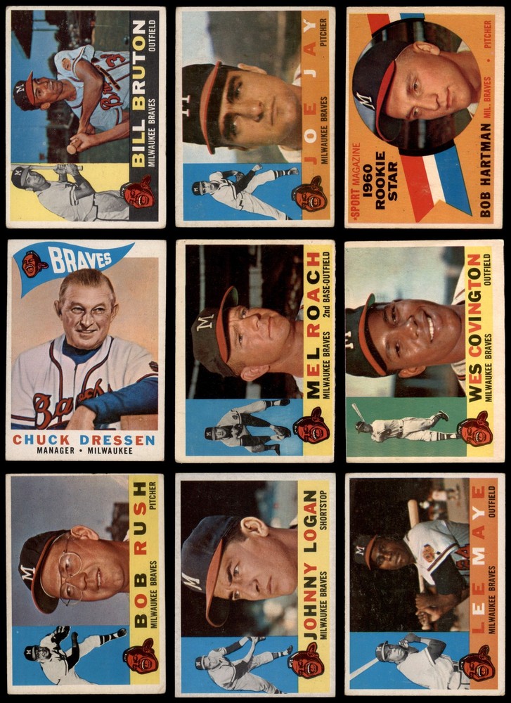 This set contains the following cards 1960 Topps #3 Joe Adcock 2 - GOOD Front Back 1960 Topps #19 Felix Mantilla 3 - VG Front Back 1960 Topps #37 Bill Bruton 2 - GOOD Front Back 1960 Topps #59 Juan Pizarro 2 - GOOD Front Back 1960 Topps #70 Lew Burdette 2 - GOOD Front Back 1960 Topps #90 Bobby Avila 2 - GOOD Front Back 1960 Topps #107 Carlton Willey 2 - GOOD Front Back 1960 Topps #129 - Bob Hartman Rookie Star 2 - GOOD Front Back 1960 Topps #143 - Al Spangler Rookie Star 1 - POOR Front Back 1960 Topps #158 Wes Covington 1.5 - FAIR Front Back 1960 Topps #170 Del Crandall 3 - VG Front Back 1960 Topps #189 Don McMahon 2 - GOOD Front Back 1960 Topps #205 Johnny Logan 1.5 - FAIR Front Back 1960 Topps #213 Chuck Dressen 2 - GOOD Front Back 1960 Topps #230 - Lew Burdette / Warren Spahn / Bob Buhl Mound Magicians 2 - GOOD Front Back 1960 Topps #246 Lee Maye 2 - GOOD Front Back 1960 Topps #266 Joey Jay 1.5 - FAIR Front Back 1960 Topps #281 Ray Boone 1.5 - FAIR Front Back 1960 Topps #300 Hank Aaron 2 - GOOD Front Back 1960 Topps #312 Charlie Lau 1.5 - FAIR Front Back 1960 Topps #335 Red Schoendienst 2 - GOOD Front Back 1960 Topps #351 Don Nottebart 1.5 - FAIR Front Back 1960 Topps #374 Bob Buhl 2 - GOOD Front Back 1960 Topps #381 Braves Team Checklist 2 - GOOD Front Back 1960 Topps #404 Bob Rush 1.5 - FAIR Front Back 1960 Topps #417 Chuck Cottier 3.5 - VG+ Front Back 1960 Topps #420 Eddie Mathews 2 - GOOD Front Back 1960 Topps #445 Warren Spahn 2 - GOOD Front Back 1960 Topps #464 - Bob Scheffing / Whitlow Wyatt / Andy Pafko / George Myatt Braves Coaches 1.5 - FAIR Front Back 1960 Topps #478 Frank Torre 3 - VG Front Back 1960 Topps #491 Mel Roach 1.5 - FAIR Front Back 1960 Topps #515 Stan Lopata 5 - EX Front Back 1960 Topps #534 Ken MacKenzie 1.5 - FAIR Front Back 1960 Topps #558 - Eddie Mathews All-Star 3 - VG Front Back 1960 Topps #566 - Hank Aaron All-Star PSA 3 - VG Front Back 1960 Topps #568 - Del Crandall All-Star 1.5 - FAIR Front Back This is a 1960 Topps Milwaukee Braves Team Set. Set breakdown by grade: Number of Cards in Set 36 Average Grade - Weighted by Value 2.50 - GD+ Average Grade - Unweighted 2.08 - GOOD Grade Breakdown 5 - EX 1 3.5 - VG+ 1 3 - VG 4 PSA 3 - VG 1 2 - GOOD 17 1.5 - FAIR 11 1 - POOR 1 Dean's Cards offers a 100% Money Back Satisfaction Guarantee on all purchases. Just contact us within 10 days of the purchase date and we will refund your money or, when possible, replace the cards. 1960 Topps Milwaukee Braves Team Set 2.5 - GD+ 6908997 If the scan in the listing says ACTUAL IMAGE, you will receive the card pictured. For cards issued after 1983, we will often use representative images and you will not receive the exact card pictured. Shipping Policy You only pay shipping on the first item. If you order multiple items on the same order, you will only be charged once for shipping. We do not combine shipping on multiple orders. To avoid multiple shipping charges we recommend using eBay's "Add to Cart" feature to check out multiple items in one transaction, or please request and allow for us to send an invoice to reflect the combined shipping charges. Canadian customers - We send all of our Canadian/International packages with tracking and cannot make any exceptions to this policy. Negotiating Prices All prices are final and we do not negotiate. This policy is to ensure that everyone knows that they are getting our best possible price. So please do not ask us to negotiate on price. Return Policy Dean's Cards has a 100% Money Back Satisfaction Guarantee on all purchases, as long as the product is returned within 30 days of receiving the product. Card Grading Each card is first reviewed by a member of our team, in order to detect any flaws that may not be visible on a scan, such as wrinkles, creases, print spots, or light stains. The vast majority of our vintage cards are professionally graded by the Dean's Cards Grading Software and include a 100% satisfaction guarantee. Our grading is on par with PSA standards when it comes to corners, centering and flaws - and tends to grade a bit tougher than PSA, on cards with a tilted image or rough edges. This grading software was developed to provide far better grading and consistency than can be achieved using the human eye. Determining the card's grade The sharpness of the corners and the degree to which a card was cut off-center determines the maximum possible grade that the card can receive. The card's grade is further reduced by any flaws or blemishes that it may have. Each card is evaluated on the following characteristics and assigned a score. Corners - Each corner of a card is individually analyzed, and then assigned a score on how square, sharp, and flawless it appears. Centering - The borders are measured, at multiple points along the edge, to determine the horizontal and vertical centering and tilt. Defects - The card is examined for imperfections, such as: size, print flaws, dings, stains, creases, or other wear which could lower its grade. Bonus for Perfect Centering - A vintage card, with near perfect centering, is given a one-half grade bonus. So when you buy one of our cards with a half-grade (e.g. 3.5 or 6.5) it will appear perfectly centered, both vertically and horizontally. Grading Criteria Worst Corner - A card can grade only as high as the worst corner will allow. Average Corner Tilt - The difference in width of a card border near the top, compared to the bottom. OCT - The sum of how far a card is Off-Center, plus its Tilt. Minimum Centering Requirements Eye Appeal - The combination of a card's centering, corners and tilt. Well-Centered - Cards that appear perfectly centered receive a bonus of one-half grade. Flaws, defects and other imperfections - can lower a card's grade. Card Backs - the above criteria is also considered, for the back of the cards, but does not inflict as severe of a penalty to its grade. Packaging Once scanned, the cards are placed in "soft" sleeves, which have an open top for easy removal. Th