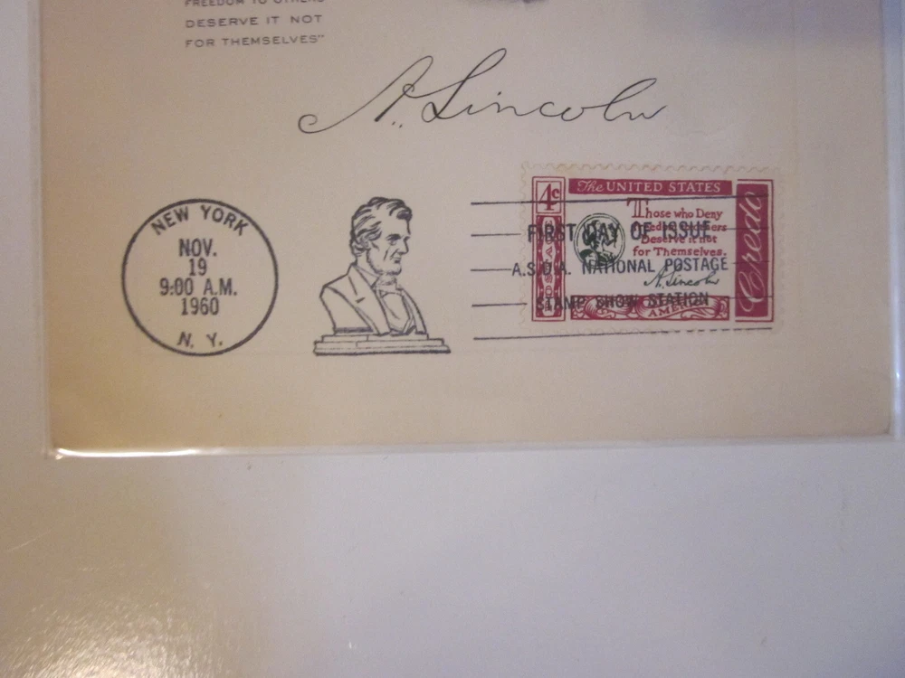 This rare and unique 1960 US FDC 1143 ABRAHAM LINCOLN Art Craft Engraved Card with FAUX Signature is a must-have for any serious stamp collector or political enthusiast. This beautiful piece of history features a 4 cent denomination and was issued between 1951-1960 in the United States. The card has been carefully crafted with high-quality art and engraving, making it a true work of art. It is ungraded and uncertified, but its authenticity can be verified by its cancellation type and place of origin. This item is perfect for adding to your collection or as a thoughtful gift for someone special.