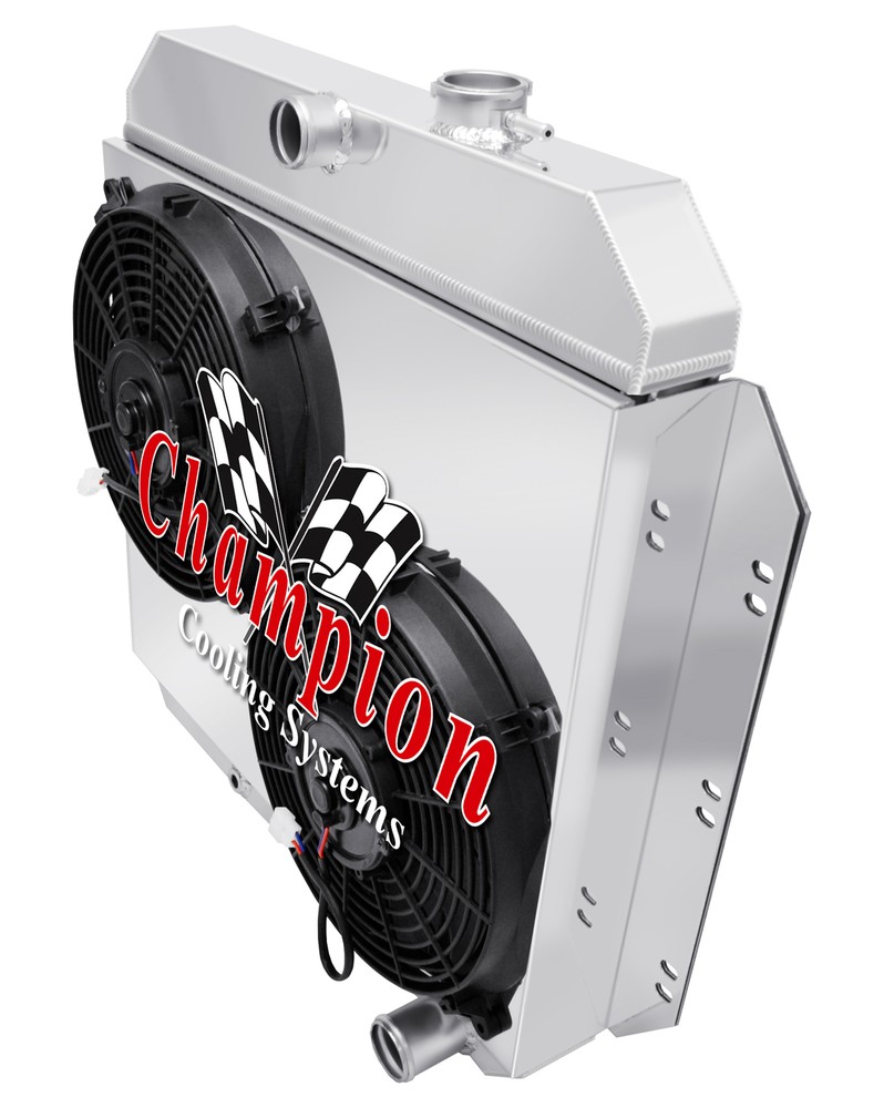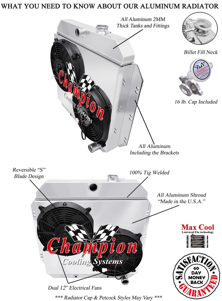 Champion Cooling radiators are tig welded with aircraft grade aluminum. Every radiator comes with a limited lifetime warranty so you can buy with confidence! Product Specifications: Core (H x W): 18.875" x 21.75" - Overall (H x W): 25" x 26.625" - Hose Locations (In x Out): Center x Pass - Hose Fittings (In x Out): 1.5" x 1.75" - TOC: 1/2-20 Straight Thread, Inverted FlarePlease click on the "Read more" link below to view a complete item description with product videos and additional items to upgrade your cooling system. PART INFORMATION Shipping Payment Policies Contact Us Part Information Related Items Genuine Champion Cooling Systems Part #AE6062 Features Higher density core: cooling rows are spaced 3/8" apart: giving you 25% more rows within the core than other aluminum radiators sold on eBay and 35% more rows than OEM copper. Aluminum dissipates heat more efficiently than copper or brass. 14-16 cooling fins per inch (42 per square inch) giving you approximately 1500 more cooling fins than other aluminum radiators and approximately 3000 more than OEM copper radiators. Lighter weight. Outperforms other 2, 3 and 4 row copper radiators. High performance appearance. You get "BIG BLOCK COOLING" and "PEACE OF MIND" when you drive your car with a Champion Cooling Systems radiator. You could easily spend $400 - $1,000 more for a radiator of similar quality. Needs modifications to your radiator? We can do them! Brackets, inlet/outlet size changes, whatever you need. Polishing also available! Please allow additional shipping time for any of these services. Specifications Down Flow Or Cross Flow Type: Down Flow Mounting Type: Bracket Tank Material: Aluminum Core Material: Aluminum Overall Height: 25 Overall Width: 26 5/8 Core Height: 18 7/8 Core Width: 21 3/4 Inlet Location: Center Inlet Diameter: 1 1/2 Outlet Location: Passenger Outlet Diameter: 1 3/4 Core Row Quantity: 2 Row with 1" Tubes Transmission Oil Cooler Fitting Type: 1/2-20 Straight Thread, Inverted Flare Internal Transmission Oil Cooler: Yes Filler Neck Attached: Yes Core Thickness: 2 1/4 Core Tube Width: 1 This package includes a 2 Row All Aluminum Radiator with 1" tubes, a fan shroud and two 12" electric fans. Shipping Shipping Our radiators are hand packed in the factory box and shipped via FedEx with insurance. Call for extra shipping rates to Hawaii, Puerto Rico, & Alaska International shipments are via FedEx International. Payment Pay securely with any major credit card! Guarantee Policies We will refund (or exchange after 60 days) 100% of your money (Including All Shipping Costs) If: Your radiator does not fit Your radiator does not cool your engine Your radiator leaks Contains manufacture's defects Or for some reason you just do not like it Contact Us © 2009 - 2017