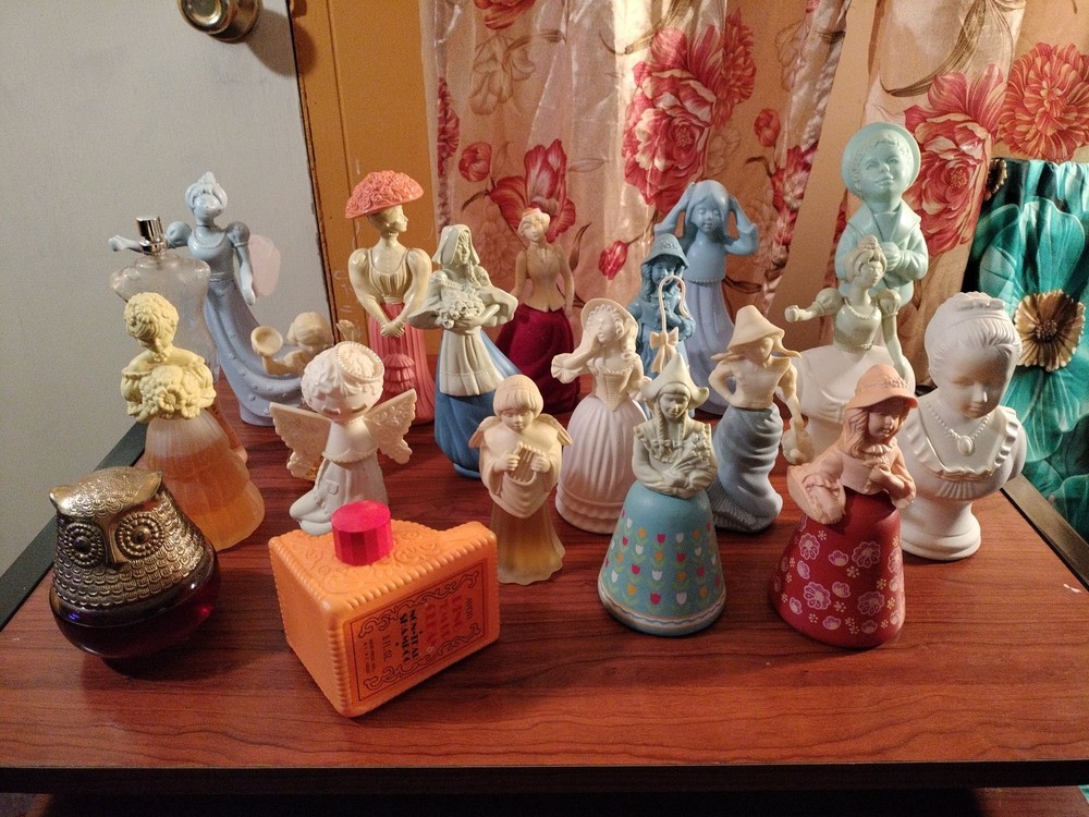 Belles of the worlds, 18th century classic figurines young girl (belles of the world), Dutch Maid(moonwind), Angel songs w/ llyre, Mary Mary (topaz), little girl blue(topaz), Garden girl (sweet honesty), Heavenly Angel (sweet honesty), Gay Nineties Fashion figurines (somewhere), Victorian Lady (sweet honesty), Owl Fancy gelee decanter(raining Violet, roses, roses, Fly- A - Balloon(birds of paradise) .This is a whole sales deal not by pieces.. buy all collectibles vintages 1960's to 1980's Avon filled and Empty bottle scent mostly bottle are filled with their original scent, some are full , half, for $250 twenty one (21) bottles...