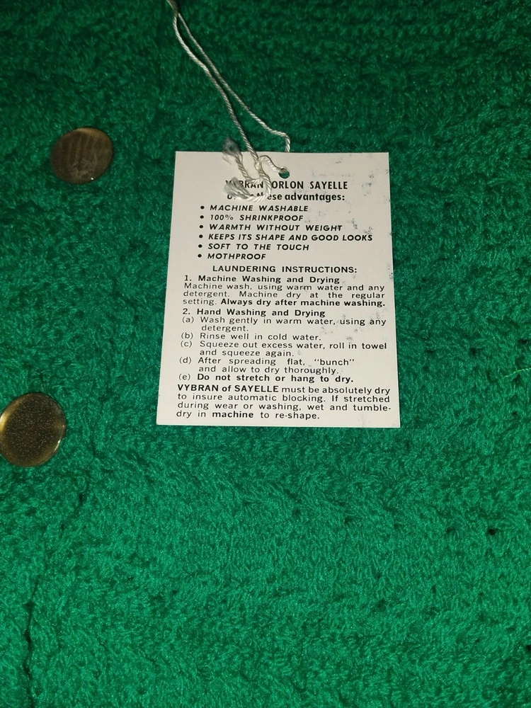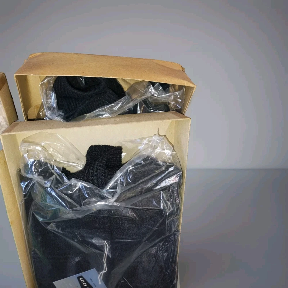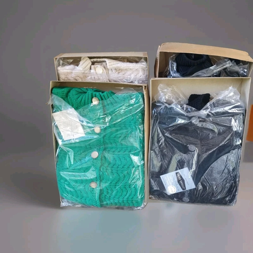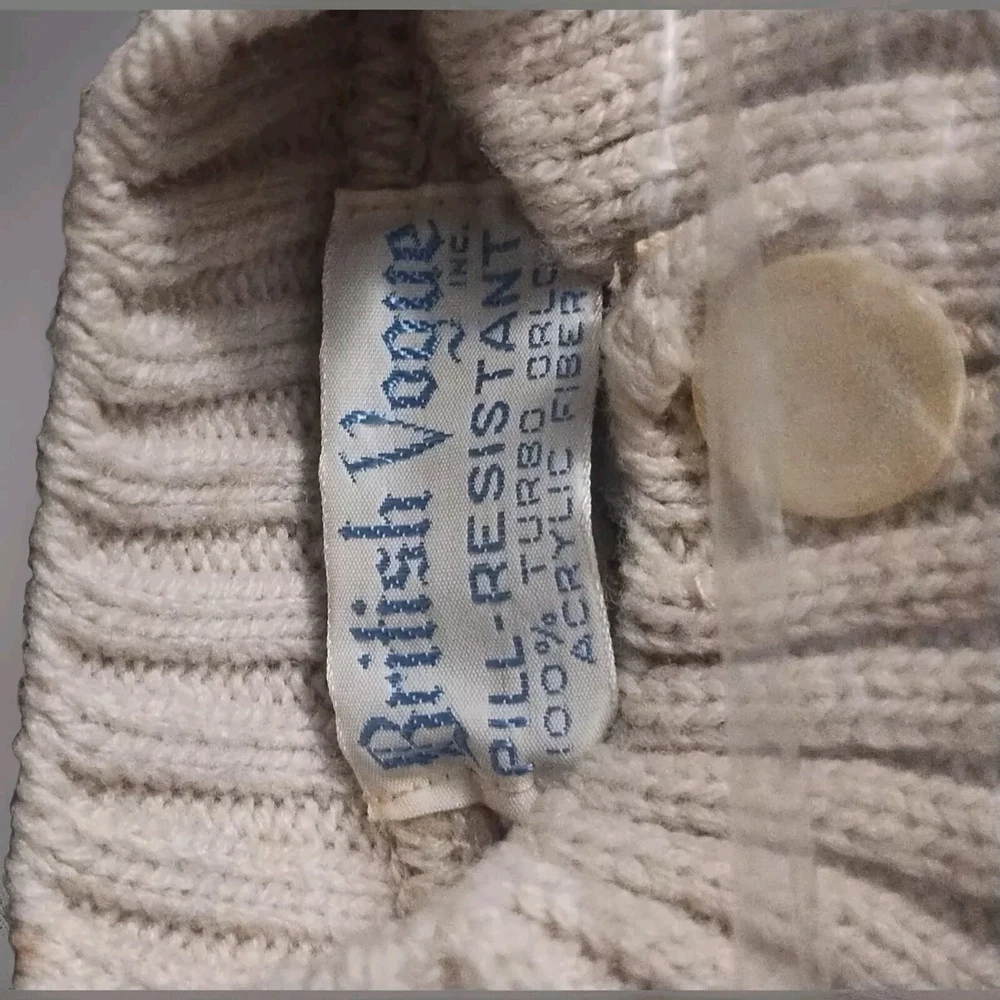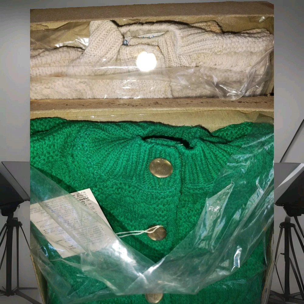 This vintage British Vogue knit sweater is a must-have for any fashion-forward individual. The sweater, made of high-quality acrylic material, features a black, beige, and green color scheme that is sure to turn heads. With a size small fit, this sweater is perfect for everyday wear and is suitable for any occasion. The sweater's unique secretary/geek look is perfect for those who want to add a touch of vintage flair to their wardrobe. Made in the United States, this sweater is a rare find and is sure to make a statement. Don't miss out on the opportunity to own a piece of fashion history. The sweater is in fantastic condition!! Musty smell from storage needs to be washed. The original boxes come with them, but label is gone. There are 3 colors! 1 Green, 1 black and 1 beige. Message me for which one you want. ALL questions are welcomed.