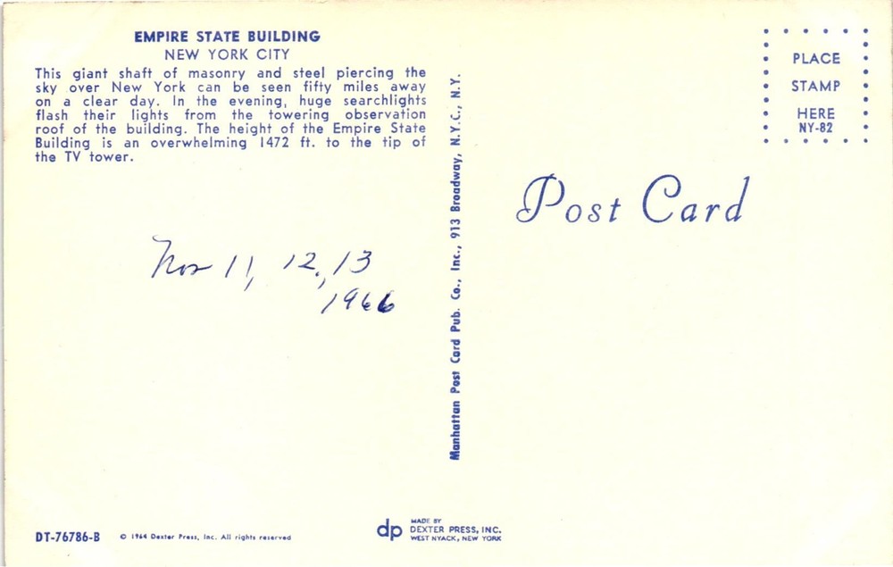 Vintage Postcard- Empire State Building, New York City, NY 1960s