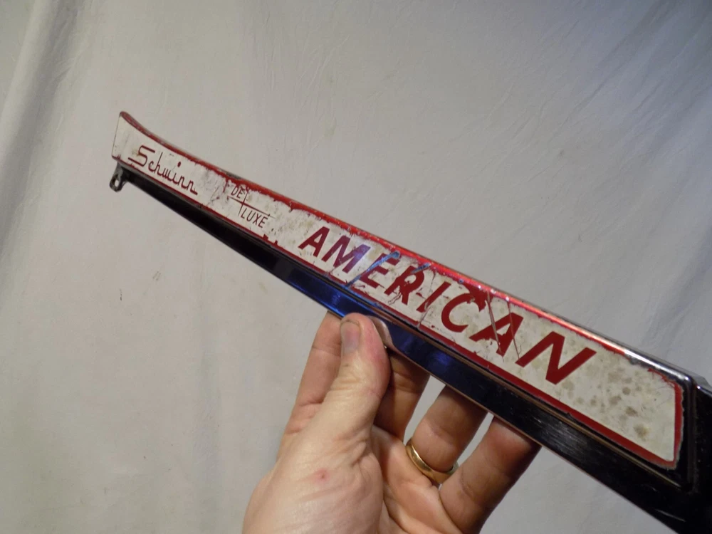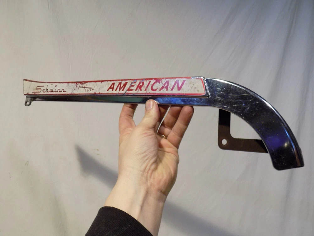 1960s SCHWINN DELUXE AMERICAN REVERSE SCREEN CHAINGUARD RED PANTHER JAGUAR TANK! Click Photos to Enlarge Description Here is a super cool vintage red paint chrome deluxe REVERSE SCREEN chainguard removed from a 1960s Schwinn Deluxe American bicycle with 26x1 3/4" wheels. Comes exactly as shown. This one measures approx 17 1/2" from the center to center of the mounting points and approx 21 1/4" from corner to corner. BE SURE to compare before you buy to be sure this will be right for you. Will fit many vintage bikes with 26" wheels but more correct for your early 1960s Schwinn middleweight bike such as your Schwinn American, Corvette, Jaguar, (Mark II, IV, V etc) Panther, Typhoon, Fair Lady, Starlet, Hollywood etc . They are money in the bank and will only go UP in value! A cool item just to hang on the wall and have on hand if you may ever need it someday! Sold as is as shown. Be sure to check out all pics and email with any questions regarding condition before you bid. THIS WEEK I AM LISTING NUMEROUS COOL VINTAGE ITEMS! They are all available right now! Check them out! Combine items to save yourself $$$ on shipping!I try my very best to describe as accurately as possible. Be sure to check out all pics and email with any questions you may have before you bid. If you are anywhere outside the lower 48 States including Alaska, Hawaii, or Puerto Rico contact me before you bid as shipping will cost more. I have lots of other rare car parts and unique items on auction this week! Email with any questions you may have. THANK YOU for your bid! Payment and Shipping PAYMENT TERMS: Paypal is Ebay's accepted form of payment. Items are shipped every Tuesday and every Friday. Payments received by Monday generally ship on Tuesday. Payments received after generally ship on Friday. SHIPPING TERMS: I will gladly ship worldwide as well as to Alaska and Hawaii for USPS Priority Mail cost. (Please email for exact cost BEFORE you bid) WISCONSIN RESIDENTS add 5.5% for sales tax. inkfrog terapeak