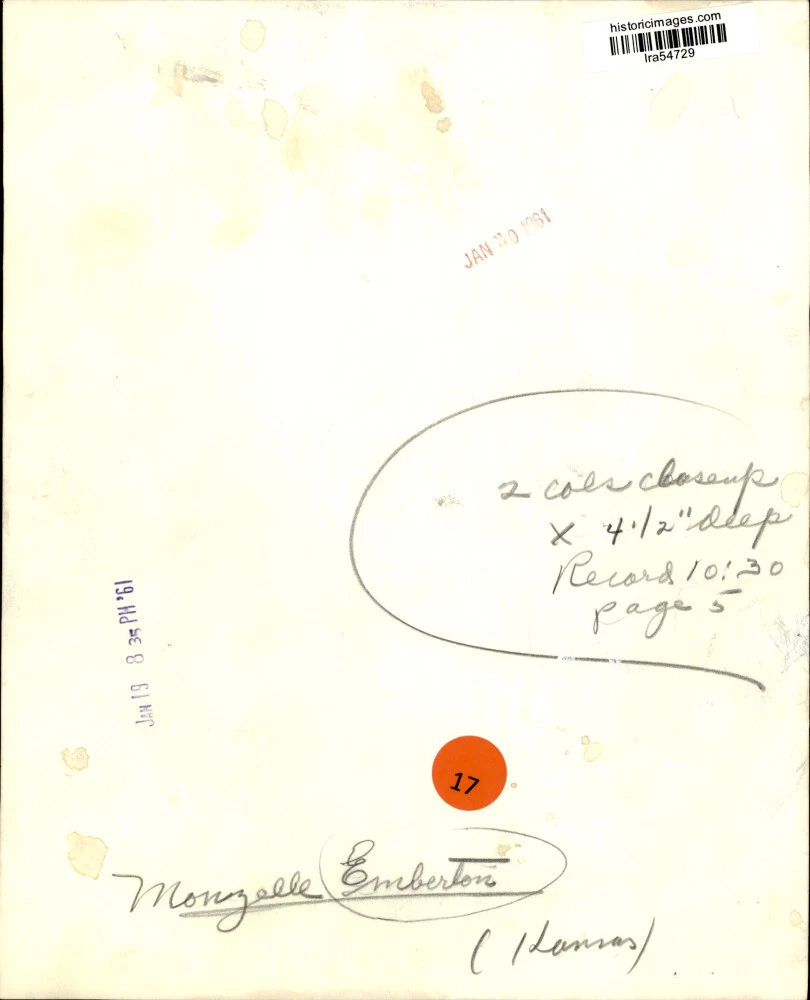 ebay template Note: Please study the images carefully to determine the condition of this vintage photograph, as it may not be in perfect condition. It may contain wrinkles, cracks, and possibly even tears due to its age and how it was handled before it got to us. A scanner may interpret colors and contrast differently than human eyes will, so it is possible that the actual photograph may be slightly darker or lighter in person. This vintage photograph is offered for sale as a collectible item and conveys no transfer of copyright. 1961 Press Photo Monzelle Emberton of Kansas reading a book - lra54729 This is an original press photo. Monzelle Emberton, Kansas Photo is dated 1/19/1961. Photo measures 8 x 10 inches.. PHOTO FRONT PHOTO BACK Historic Images Part Number: lra54729 Sell Smarter with Kyozou. Inventory and Ecommerce Management