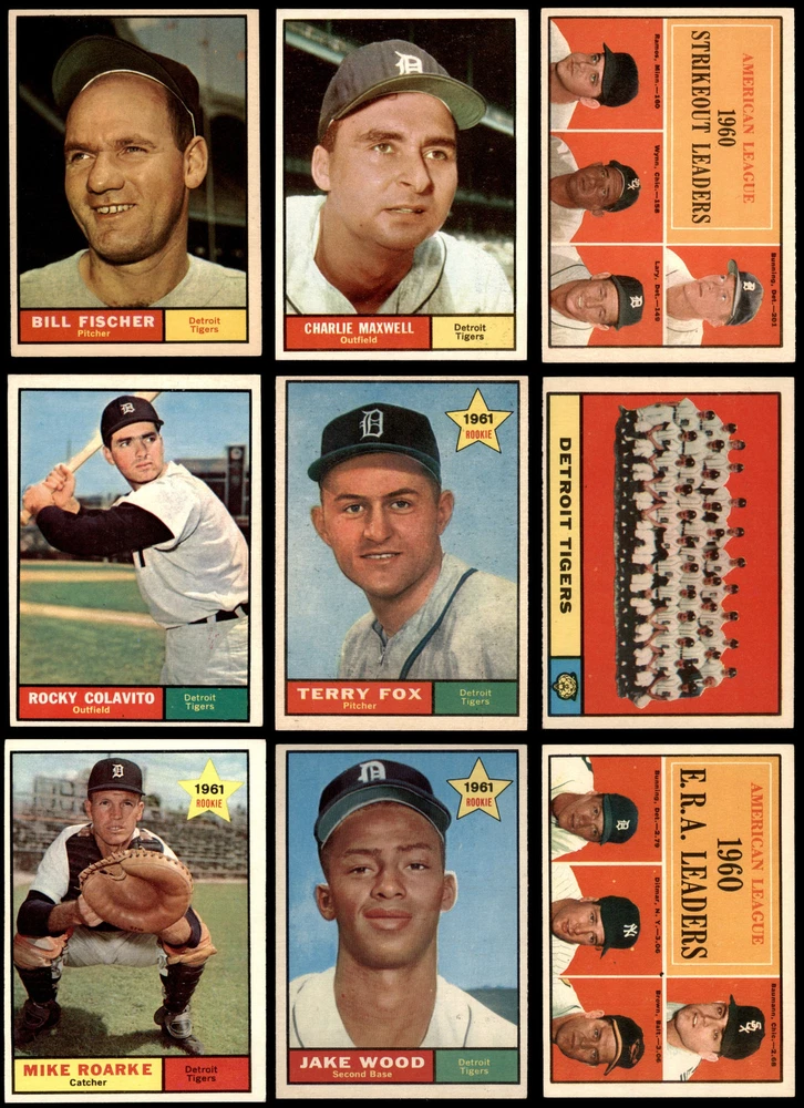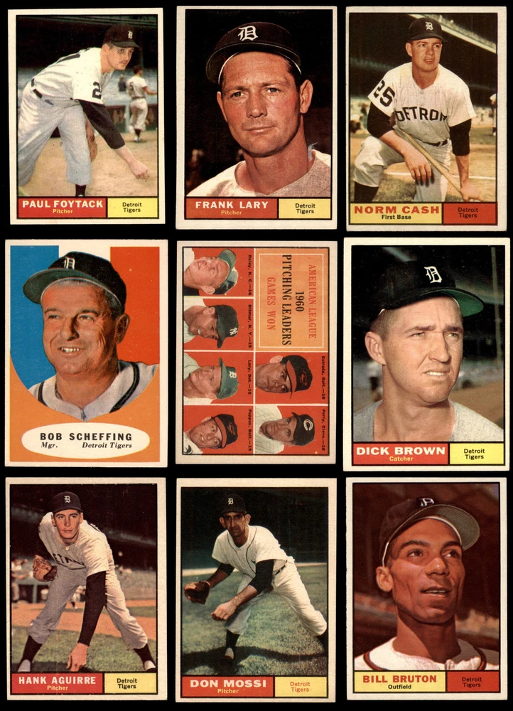 This set contains the following cards 1961 Topps #13 Chuck Cottier 5 - EX Front Back 1961 Topps #14 Don Mossi 5 - EX Front Back 1961 Topps #37 Charlie Maxwell 6 - EX/MT Front Back 1961 Topps #46 - Jim Bunning / Frank Baumann / Hal Brown / Art Ditmar AL ERA Leaders 6 - EX/MT Front Back 1961 Topps #48 - Bud Daley / Art Ditmar / Chuck Estrada / Frank Lary / Milt Pappas / Jim Perry AL Pitching Leaders 4 - VG/EX Front Back 1961 Topps #50 - Jim Bunning / Frank Lary / Pedro Ramos / Early Wynn AL Strikeout Leaders 5 - EX Front Back 1961 Topps #51 Tigers Team 4 - VG/EX Front Back 1961 Topps #67 Ossie Virgil 4 - VG/EX Front Back 1961 Topps #83 Bob Bruce 4 - VG/EX Front Back 1961 Topps #95 Norm Cash 4 - VG/EX Front Back 1961 Topps #112 Chico Fernandez 4 - VG/EX Front Back 1961 Topps #151 Jim Donohue 5 - EX Front Back 1961 Topps #171 Paul Foytack 6 - EX/MT Front Back 1961 Topps #192 Dick Brown 6 - EX/MT Front Back 1961 Topps #208 Complete or Incomplete Line Larry Osborne 4 - VG/EX Front Back 1961 Topps #223 Bob Scheffing 6 - EX/MT Front Back 1961 Topps #243 Frank Lary 5 - EX Front Back 1961 Topps #251 Bill Bruton 5 - EX Front Back 1961 Topps #269 Harry Chiti 4 - VG/EX Front Back 1961 Topps #284 Dick Gernert 4 - VG/EX Front Back 1961 Topps #324 Hank Aguirre 5 - EX Front Back 1961 Topps #330 Rocky Colavito 5 - EX Front Back 1961 Topps #348 Steve Boros 4 - VG/EX Front Back 1961 Topps #376 Mike Roarke 5 - EX Front Back 1961 Topps #429 Al Kaline 4 - VG/EX Front Back 1961 Topps #439 Phil Regan 4 - VG/EX Front Back 1961 Topps #459 Terry Fox 5 - EX Front Back 1961 Topps #490 Jim Bunning 4 - VG/EX Front Back 1961 Topps #514 Jake Wood 5 - EX Front Back 1961 Topps #544 George Thomas PSA 6 - EX/MT Front Back 1961 Topps #553 Bill Fischer 5 - EX Front Back This 1961 Topps Detroit Tigers Team Set contains the 1961 Topps Tigers baseball cards and makes a great gift for any Tigers fan. ?With an inventory of over 15,000 team sets, Dean's Cards has Team Sets & Near Team Sets for just about every team, in multiple conditions, for all sports, for most major sets issued between 1909 and 1979. The 1961 Detroit Tigers won 101 games, but the team had the misfortune of reaching this total in the same year that the Yankees had one of their best all-time teams. So the Tigers did not qualify for post season play in this first AL expansion season. ?Card #580 Al Kaline is not included but can be purchased separately on our site.?