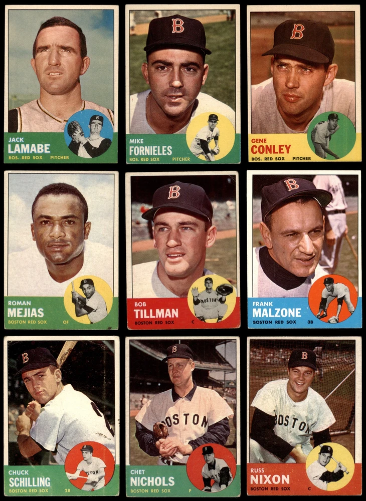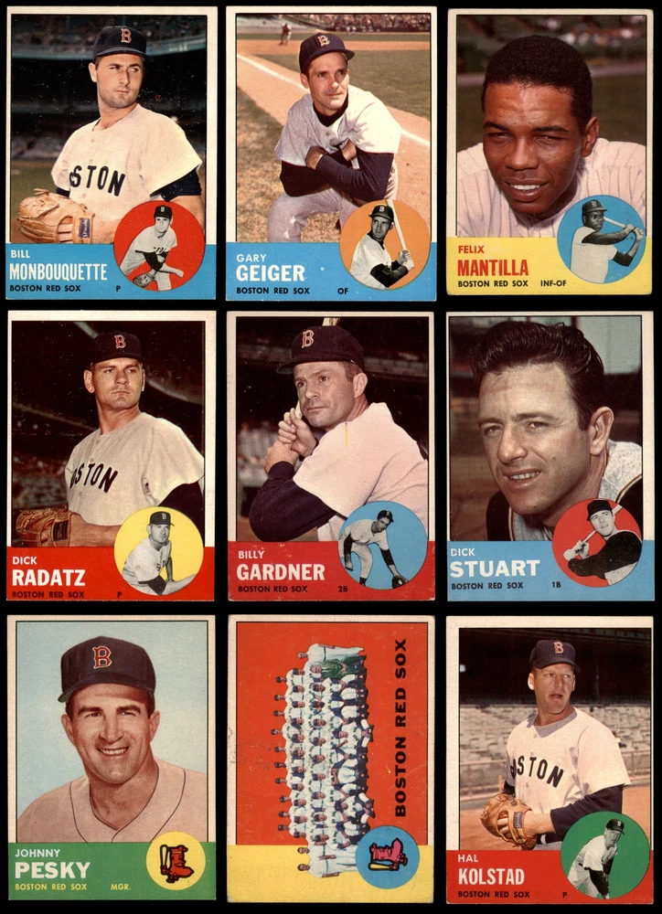 This set contains the following cards 1963 Topps #28 xSTR Mike Fornieles 3 - VG Front Back 1963 Topps #52 May or May Not Have Red Mark above the Trademark on the Bat Chuck Schilling 2 - GOOD Front Back 1963 Topps #76 Earl Wilson 2 - GOOD Front Back 1963 Topps #96 Lou Clinton 2 - GOOD Front Back 1963 Topps #115 Carl Yastrzemski 3 - VG Front Back 1963 Topps #136 Ike Delock 2 - GOOD Front Back 1963 Topps #168 Russ Nixon 3 - VG Front Back 1963 Topps #188 Eddie Bressoud 3 - VG Front Back 1963 Topps #202 Red Sox Team 2 - GOOD Front Back 1963 Topps #216 Gene Conley 4 - VG/EX Front Back 1963 Topps #232 Frank Malzone 4 - VG/EX Front Back 1963 Topps #251 Jack Lamabe 4 - VG/EX Front Back 1963 Topps #285 Dick Stuart 3 - VG Front Back 1963 Topps #307 Chet Nichols 3 - VG Front Back 1963 Topps #328 Dick Williams 4 - VG/EX Front Back 1963 Topps #343 Johnny Pesky 3 - VG Front Back 1963 Topps #363 Dick Radatz 3 - VG Front Back 1963 Topps #384 Bob Tillman 2 - GOOD Front Back 1963 Topps #408 Billy Gardner 4 - VG/EX Front Back 1963 Topps #432 Roman Mejias 3 - VG Front Back 1963 Topps #447 Felix Mantilla 3 - VG Front Back 1963 Topps #480 Bill Monbouquette 5 - EX Front Back 1963 Topps #513 Gary Geiger 5 - EX Front Back 1963 Topps #574 Hal Kolstad 3 - VG Front Back This 1963 Topps Boston Red Sox Team Set contains the 1963 Topps Red Sox baseball cards and makes a great gift for any Red Sox fan. ?With an inventory of over 15,000 team sets, Dean's Cards has Team Sets & Near Team Sets for just about every team, in multiple conditions, for all sports, for most major sets issued between 1909 and 1979. Set breakdown by grade: Number of Cards in Set 24 Average Grade - Weighted by Value 3.51 - VG+ Average Grade - Unweighted 3.13 - VG Grade Breakdown 5 - EX 2 4 - VG/EX 5 3 - VG 11 2 - GOOD 6 The following cards are omitted from this set: #253 Rookie Stars - Deacon Jones / John Wojcik / Pete Jernigan / Len Gabrielson, #299 Rookie Stars - Dave Morehead / Tom Butters / Dan Schneider / Bob Dustal, #2 AL Batting Leaders - Mickey Mantle / Chuck Hinton / Floyd Robinson / Pete Runnels / Norm Siebern and #553 Rookie Stars - Willie Stargell / Jim Gosger / Brock Davis / John Herrnstein Dean's Cards offers a 100% Money Back Satisfaction Guarantee on all purchases. Just contact us within 10 days of the purchase date and we will refund your money or, when possible, replace the cards. 1963 Topps Boston Red Sox Team Set 3.5 - VG+ 6883675 If the scan in the listing says ACTUAL IMAGE, you will receive the card pictured. For cards issued after 1983, we will often use representative images and you will not receive the exact card pictured. Shipping Policy You only pay shipping on the first item. If you order multiple items on the same order, you will only be charged once for shipping. We do not combine shipping on multiple orders. To avoid multiple shipping charges we recommend using eBay's "Add to Cart" feature to check out multiple items in one transaction, or please request and allow for us to send an invoice to reflect the combined shipping charges. Canadian customers - We send all of our Canadian/International packages with tracking and cannot make any exceptions to this policy. Negotiating Prices All prices are final and we do not negotiate. This policy is to ensure that everyone knows that they are getting our best possible price. So please do not ask us to negotiate on price. Return Policy Dean's Cards has a 100% Money Back Satisfaction Guarantee on all purchases, as long as the product is returned within 30 days of receiving the product. Card Grading Each card is first reviewed by a member of our team, in order to detect any flaws that may not be visible on a scan, such as wrinkles, creases, print spots, or light stains. The vast majority of our vintage cards are professionally graded by the Dean's Cards Grading Software and include a 100% satisfaction guarantee. Our grading is on par with PSA standards when it comes to corners, centering and flaws - and tends to grade a bit tougher than PSA, on cards with a tilted image or rough edges. This grading software was developed to provide far better grading and consistency than can be achieved using the human eye. Determining the card's grade The sharpness of the corners and the degree to which a card was cut off-center determines the maximum possible grade that the card can receive. The card's grade is further reduced by any flaws or blemishes that it may have. Each card is evaluated on the following characteristics and assigned a score. Corners - Each corner of a card is individually analyzed, and then assigned a score on how square, sharp, and flawless it appears. Centering - The borders are measured, at multiple points along the edge, to determine the horizontal and vertical centering and tilt. Defects - The card is examined for imperfections, such as: size, print flaws, dings, stains, creases, or other wear which could lower its grade. Bonus for Perfect Centering - A vintage card, with near perfect centering, is given a one-half grade bonus. So when you buy one of our cards with a half-grade (e.g. 3.5 or 6.5) it will appear perfectly centered, both vertically and horizontally. Grading Criteria Worst Corner - A card can grade only as high as the worst corner will allow. Average Corner Tilt - The difference in width of a card border near the top, compared to the bottom. OCT - The sum of how far a card is Off-Center, plus its Tilt. Minimum Centering Requirements Eye Appeal - The combination of a card's centering, corners and tilt. Well-Centered - Cards that appear perfectly centered receive a bonus of one-half grade. Flaws, defects and other imperfections - can lower a card's grade. Card Backs - the above criteria is also considered, for the back of the cards, but does not inflict as severe of a penalty to its grade. Packaging Once scanned, the cards are placed in "soft" sleeves, which have an open top for easy removal. The Dean's Cards label is placed on the top back of the card sleeve
