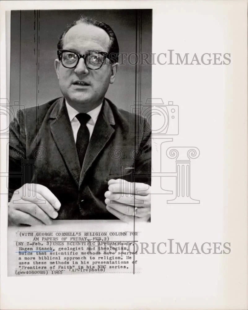 ebay template Note: Please study the images carefully to determine the condition of this vintage photograph, as it may not be in perfect condition. It may contain wrinkles, cracks, and possibly even tears due to its age and how it was handled before it got to us. A scanner may interpret colors and contrast differently than human eyes will, so it is possible that the actual photograph may be slightly darker or lighter in person. This vintage photograph is offered for sale as a collectible item and conveys no transfer of copyright. 1965 Press Photo Geologist Hagen Staack describes scientific methods on NBC show This is an original press photo. Hagen Staack, geologist and theologian, holds that scientific methods have spurred a more biblical approach to religion. He uses these methods in his presentations of "Frontiers of Faith" in his NBC series. Photo measures 8 x 10inches. Photo is dated 02-03-1965. PHOTO FRONT PHOTO BACK Historic Images Part Number: hcw36030 Sell Smarter with Kyozou. Inventory and Ecommerce Management
