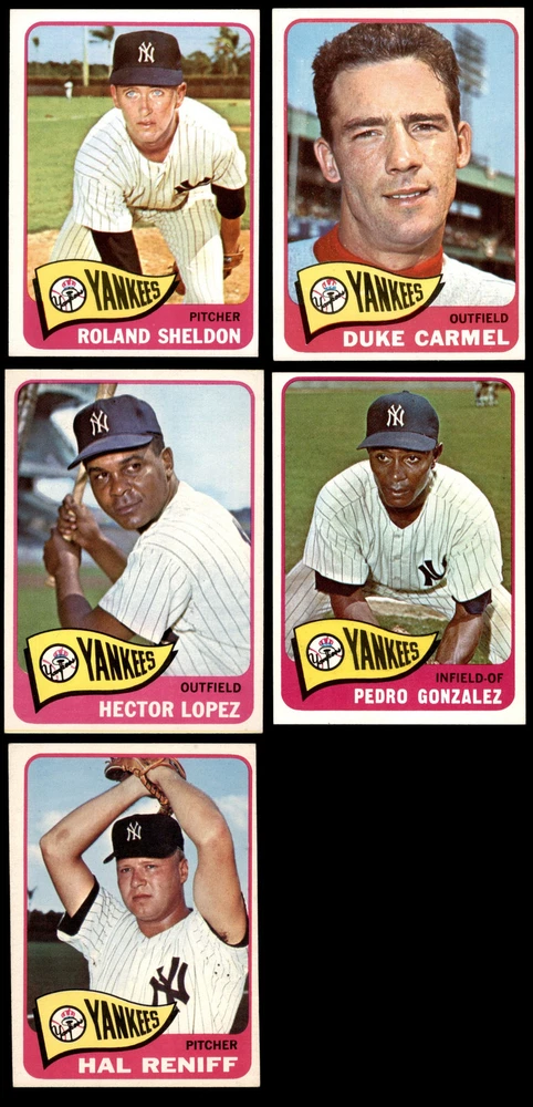 This set contains the following cards 1965 Topps #30 Jim Bouton 5 - EX Front Back 1965 Topps #97 Pedro Gonzalez 7 - NM Front Back 1965 Topps #115 Bobby Richardson 5 - EX Front Back 1965 Topps #131 Johnny Keane 6 - EX/MT Front Back 1965 Topps #177 Pete Mikkelsen 6 - EX/MT Front Back 1965 Topps #226 - Jake Gibbs / Elvio Jimenez Yankees Rookies 6 - EX/MT Front Back 1965 Topps #254 Roland Sheldon 5 - EX Front Back 1965 Topps #261 Duke Carmel 6 - EX/MT Front Back 1965 Topps #281 Bill Stafford 6 - EX/MT Front Back 1965 Topps #369 Phil Linz 5 - EX Front Back 1965 Topps #388 John Blanchard 6 - EX/MT Front Back 1965 Topps #413 Hal Reniff 5 - EX Front Back 1965 Topps #440 Tom Tresh 6 - EX/MT Front Back 1965 Topps #532 Hector Lopez 5 - EX Front Back 1965 Topps #582 Bob Schmidt 7 - NM Front Back 1965 Topps #598 Al Downing 6 - EX/MT Front Back This 1965 Topps New York Yankees Team Set consists of the cards printed by Topps in 1965 of Yankees players. It does not include card #350 Mickey Mantle because it almost doubles the cost of the set. It can be purchased separately on our website. For the exact cards contained in this set, as well as their front and back scans, please see the description below. Set breakdown by grade: Number of Cards in Set 16 Average Grade - Weighted by Value 5.79 - EX/MT Average Grade - Unweighted 5.75 - EX/MT Grade Breakdown 7 - NM 2 6 - EX/MT 8 5 - EX 6 . This near team set contains 16 cards out of the possible 40 cards. This is not a complete set. "The following cards have been omitted, in order to keep the cost of the set reasonable, and can be purchased separately."#13 Pedro Ramos, #133 1964 World Series - Game #2 - Stottlemyre Wins - Mel Stottlemyre, #3 AL HR Leaders - Mickey Mantle / Harmon Killebrew / Boog Powell, #350 Mickey Mantle, #1 AL Batting Leaders - Elston Howard / Tony Oliva / Brooks Robinson, #5 AL RBI Leaders - Harmon Killebrew / Mickey Mantle / Brooks Robinson / Dick Stuart, #134 1964 World Series - Game #3 - Mantle's Clutch HR - Mickey Mantle, #138 1964 World Series - Game #7 - Gibson Wins Finale - Bob Gibson, #139 1964 World Series - Summary - The Cards Celebrate, #137 1964 World Series - Game #6 - Bouton Wins Again - Jim Bouton, #135 1964 World Series - Game #4 - Boyer's Grand Slam - Ken Boyer / Elston Howard, #136 1964 World Series - Game #5 - 10th Inning Triumph - Tim McCarver / Bill White / Dick Groat / Mike Shannon, #11 AL Strikeout Leaders - Al Downing / Camilo Pascual / Dean Chance and #132 1964 World Series - Game #1 - Cards Take Opener - Mike Shannon / Whitey Ford / Elston Howard Dean's Cards offers a 100% Money Back Satisfaction Guarantee on all purchases. Just contact us within 10 days of the purchase date and we will refund your money or, when possible, replace the cards. 1965 Topps New York Yankees Near Team Set Won 1964 AL Pennant 6 - EX/MT 6909923 (16 / 40 cards) If the scan in the listing says ACTUAL IMAGE, you will receive the card pictured. For cards issued after 1983, we will often use representative images and you will not receive the exact card pictured. Shipping Policy You only pay shipping on the first item. If you order multiple items on the same order, you will only be charged once for shipping. We do not combine shipping on multiple orders. To avoid multiple shipping charges we recommend using eBay's "Add to Cart" feature to check out multiple items in one transaction, or please request and allow for us to send an invoice to reflect the combined shipping charges. Canadian customers - We send all of our Canadian/International packages with tracking and cannot make any exceptions to this policy. Negotiating Prices All prices are final and we do not negotiate. This policy is to ensure that everyone knows that they are getting our best possible price. So please do not ask us to negotiate on price. Return Policy Dean's Cards has a 100% Money Back Satisfaction Guarantee on all purchases, as long as the product is returned within 30 days of receiving the product. Card Grading Each card is first reviewed by a member of our team, in order to detect any flaws that may not be visible on a scan, such as wrinkles, creases, print spots, or light stains. The vast majority of our vintage cards are professionally graded by the Dean's Cards Grading Software and include a 100% satisfaction guarantee. Our grading is on par with PSA standards when it comes to corners, centering and flaws - and tends to grade a bit tougher than PSA, on cards with a tilted image or rough edges. This grading software was developed to provide far better grading and consistency than can be achieved using the human eye. Determining the card's grade The sharpness of the corners and the degree to which a card was cut off-center determines the maximum possible grade that the card can receive. The card's grade is further reduced by any flaws or blemishes that it may have. Each card is evaluated on the following characteristics and assigned a score. Corners - Each corner of a card is individually analyzed, and then assigned a score on how square, sharp, and flawless it appears. Centering - The borders are measured, at multiple points along the edge, to determine the horizontal and vertical centering and tilt. Defects - The card is examined for imperfections, such as: size, print flaws, dings, stains, creases, or other wear which could lower its grade. Bonus for Perfect Centering - A vintage card, with near perfect centering, is given a one-half grade bonus. So when you buy one of our cards with a half-grade (e.g. 3.5 or 6.5) it will appear perfectly centered, both vertically and horizontally. Grading Criteria Worst Corner - A card can grade only as high as the worst corner will allow. Average Corner Tilt - The difference in width of a card border near the top, compared to the bottom. OCT - The sum of how far a card is Off-Center, plus its Tilt. Minimum Centering Requirements Eye Appeal - The combination of a card's centering, corners and tilt. Well-Centered - Cards that appear 