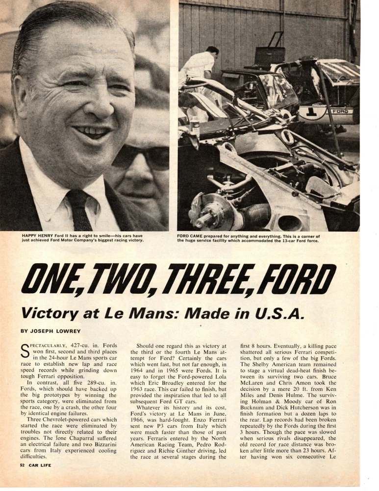 1966 FORD VICTORY AT LE MANS / ONE, TWO, THREE NICE 4-VIEWABLE PAGE ARTICLE MEASURES APPROX 8" X 11" GOOD CONDITION IF YOU LOVE LE MANS THIS IS A MUST HAVE FOR YOUR COLLECTION - MAKES AN EXCELLENT GIFT FOR THAT CAR ENTHUSIAST - THESE ADS LOOK GREAT FRAMED AND MOUNTED ON YOUR GARAGE OR DEN WALL - A 100% ORIGINAL VINTAGE HISTORICAL PIECE * * * WILL COMBINE SHIPPING ON 1 TO 5 ADS * * * *** FREE SHIPPING ON 6 ADS OR MORE USA ONLY *** PAPERMUSCLE IF YOU PLAN FOR COMBINED SHIPPING PLEASE WAIT TO RECEIVE AN INVOICE FOR DISCOUNTED SHIPPING