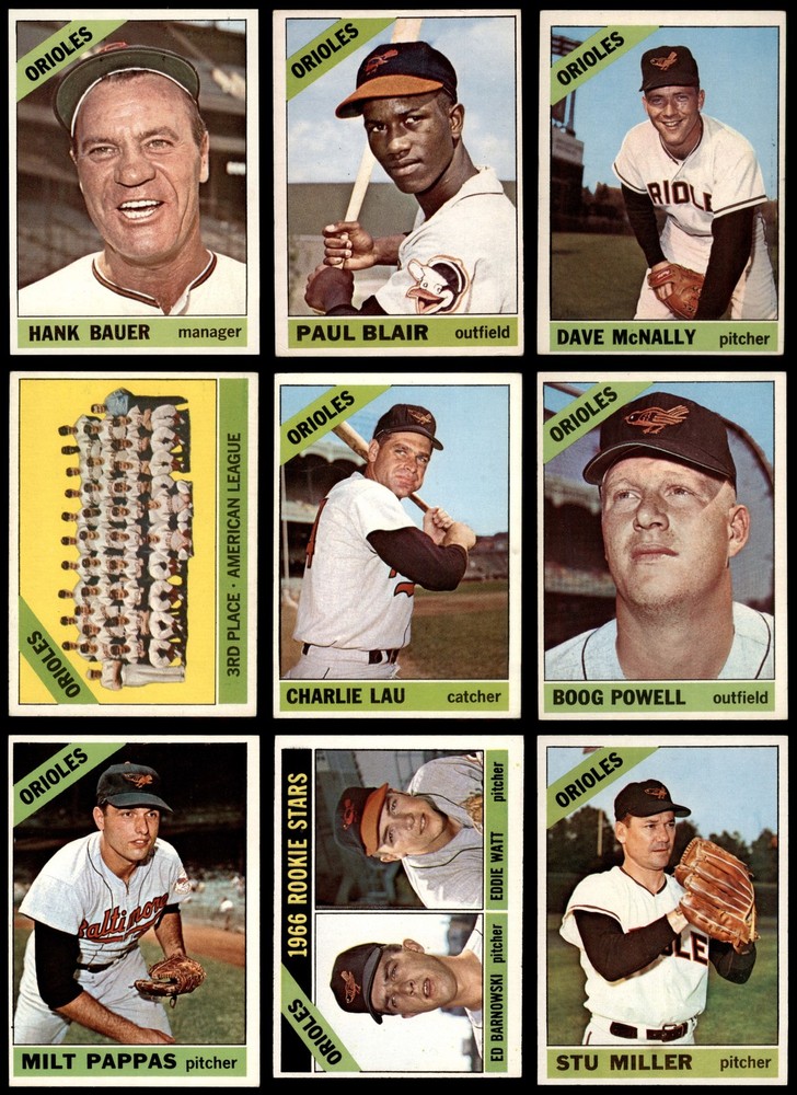 This set contains the following cards 1966 Topps #14 Norm Siebern 2 - GOOD Front Back 1966 Topps #27 - Andy Etchebarren / Darold Knowles Orioles Rookies 3 - VG Front Back 1966 Topps #48 Paul Blair 4 - VG/EX Front Back 1966 Topps #90 Luis Aparicio 4 - VG/EX Front Back 1966 Topps #105 Milt Pappas 5 - EX Front Back 1966 Topps #126 Jim Palmer 2 - GOOD Front Back 1966 Topps #136 Woodie Held 3 - VG Front Back 1966 Topps #148 Bob Johnson 4 - VG/EX Front Back 1966 Topps #167 Boog Powell 5 - EX Front Back 1966 Topps #193 Dave McNally 4 - VG/EX Front Back 1966 Topps #229 Hank Bauer 6 - EX/MT Front Back 1966 Topps #247 Carl Warwick 3 - VG Front Back 1966 Topps #265 Stu Miller 6 - EX/MT Front Back 1966 Topps #348 Orioles Team 4 - VG/EX Front Back 1966 Topps #368 Charlie Lau 4 - VG/EX Front Back 1966 Topps #390 Brooks Robinson 1 - POOR Front Back 1966 Topps #412 Sam Bowens 3 - VG Front Back 1966 Topps #442 - Eddie Watt / Ed Barnowski Orioles Rookies 5 - EX Front Back This is a 1966 Topps Baltimore Orioles Team Set. ?It contains all the cards of the 1966 World Champs, who defeated swept the Dodgers in 4 games. ?This team includes 4 future Hall-of-Famers, plus the expensive high number cards. Set breakdown by grade: Number of Cards in Set 18 Average Grade - Weighted by Value 3.63 - VG+ Average Grade - Unweighted 3.78 - VG/EX Grade Breakdown 6 - EX/MT 2 5 - EX 3 4 - VG/EX 6 3 - VG 4 2 - GOOD 2 1 - POOR 1 This near team set contains 18 cards out of the possible 29 cards. This is not a complete set. This set does not include the following cards: #291 Moe Drabowsky, #310 Frank Robinson, #427 John Miller, #460 Curt Blefary, #467 Vic Roznovsky, #477 Steve Barber, #499 Wally Bunker, #513 Camilo Carreon, #533 Jerry Adair, #562 Russ Snyder, #579 Orioles Rookies - Davey Johnson / Frank Bertaina / Gene Brabender Dean's Cards offers a 100% Money Back Satisfaction Guarantee on all purchases. Just contact us within 10 days of the purchase date and we will refund your money or, when possible, replace the cards. 1966 Topps Baltimore Orioles Team Set 1966 World Series Champs! 4 - VG/EX 6909988 (18 / 29 cards) If the scan in the listing says ACTUAL IMAGE, you will receive the card pictured. For cards issued after 1983, we will often use representative images and you will not receive the exact card pictured. Shipping Policy You only pay shipping on the first item. If you order multiple items on the same order, you will only be charged once for shipping. We do not combine shipping on multiple orders. To avoid multiple shipping charges we recommend using eBay's "Add to Cart" feature to check out multiple items in one transaction, or please request and allow for us to send an invoice to reflect the combined shipping charges. Canadian customers - We send all of our Canadian/International packages with tracking and cannot make any exceptions to this policy. Negotiating Prices All prices are final and we do not negotiate. This policy is to ensure that everyone knows that they are getting our best possible price. So please do not ask us to negotiate on price. Return Policy Dean's Cards has a 100% Money Back Satisfaction Guarantee on all purchases, as long as the product is returned within 30 days of receiving the product. Card Grading Each card is first reviewed by a member of our team, in order to detect any flaws that may not be visible on a scan, such as wrinkles, creases, print spots, or light stains. The vast majority of our vintage cards are professionally graded by the Dean's Cards Grading Software and include a 100% satisfaction guarantee. Our grading is on par with PSA standards when it comes to corners, centering and flaws - and tends to grade a bit tougher than PSA, on cards with a tilted image or rough edges. This grading software was developed to provide far better grading and consistency than can be achieved using the human eye. Determining the card's grade The sharpness of the corners and the degree to which a card was cut off-center determines the maximum possible grade that the card can receive. The card's grade is further reduced by any flaws or blemishes that it may have. Each card is evaluated on the following characteristics and assigned a score. Corners - Each corner of a card is individually analyzed, and then assigned a score on how square, sharp, and flawless it appears. Centering - The borders are measured, at multiple points along the edge, to determine the horizontal and vertical centering and tilt. Defects - The card is examined for imperfections, such as: size, print flaws, dings, stains, creases, or other wear which could lower its grade. Bonus for Perfect Centering - A vintage card, with near perfect centering, is given a one-half grade bonus. So when you buy one of our cards with a half-grade (e.g. 3.5 or 6.5) it will appear perfectly centered, both vertically and horizontally. Grading Criteria Worst Corner - A card can grade only as high as the worst corner will allow. Average Corner Tilt - The difference in width of a card border near the top, compared to the bottom. OCT - The sum of how far a card is Off-Center, plus its Tilt. Minimum Centering Requirements Eye Appeal - The combination of a card's centering, corners and tilt. Well-Centered - Cards that appear perfectly centered receive a bonus of one-half grade. Flaws, defects and other imperfections - can lower a card's grade. Card Backs - the above criteria is also considered, for the back of the cards, but does not inflict as severe of a penalty to its grade. Packaging Once scanned, the cards are placed in "soft" sleeves, which have an open top for easy removal. The Dean's Cards label is placed on the top back of the card sleeve. Every card you buy features a QR Code that you can scan to see your ACTUAL CARD and its grading statistics. Please note that when images are enlarged there may be instances of vertical lines running through the scans. This was caused by a "dust speck" on the scanner and can be verified by the vertical lines runnin