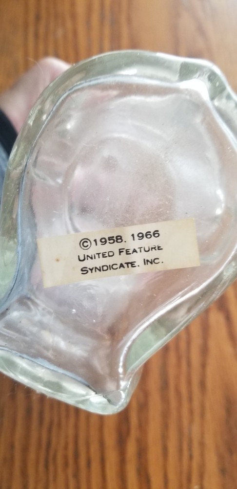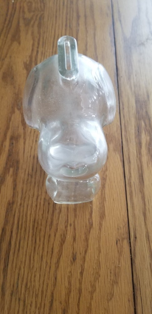 The 1966 Vintage Glass Snoopy Piggy Bank from United Feature Syndicate is a collectible item featuring the beloved character Snoopy from the Peanuts franchise. Made of clear glass, this piggy bank stands at 6 inches tall and has dimensions of 4.5 inches in length and 3.5 inches in width. With its cartoon and TV character theme, this nostalgic piece is a must-have for fans of nostalgia and animation enthusiasts alike. Perfect for storing loose change or displaying as a unique decor item in any Snoopy or Peanuts fan's collection. The glass jar is a bit dusty on the inside