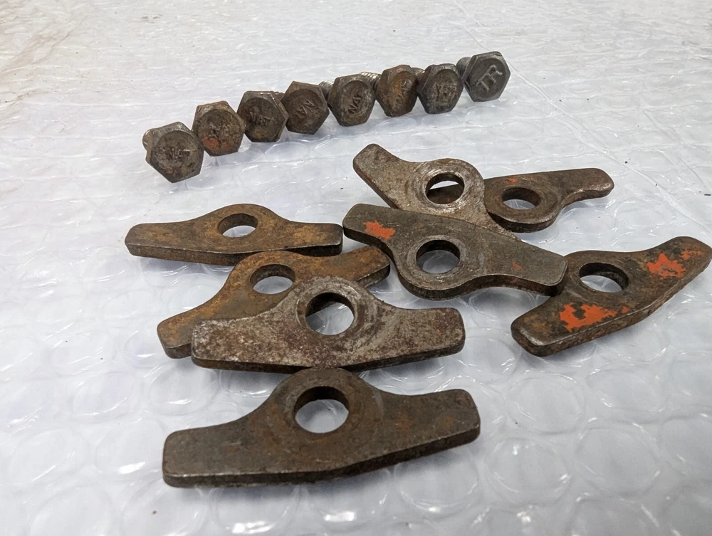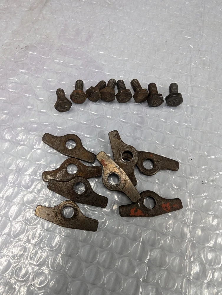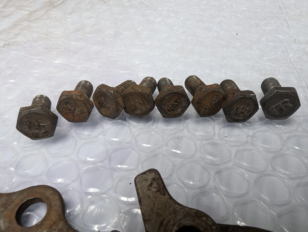 Original bolts and spreaders I removed from a 327 engine that was cracked. 8 bolts have NAT marking, one has TR.