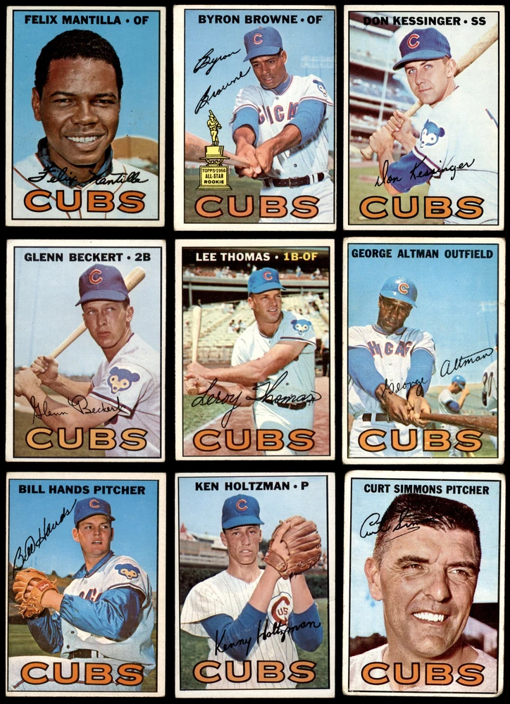 This set contains the following cards 1967 Topps #16 Bill Hands 2 - GOOD Front Back 1967 Topps #39 Curt Simmons 1 - POOR Front Back 1967 Topps #70 Ron Santo 2 - GOOD Front Back 1967 Topps #87 George Altman 1 - POOR Front Back 1967 Topps #106 Randy Hundley 1 - POOR Front Back 1967 Topps #124 Jimmy Stewart 2 - GOOD Front Back 1967 Topps #148 Adolfo Phillips 1.5 - FAIR Front Back 1967 Topps #168 Ray Culp 1 - POOR Front Back 1967 Topps #171 Cal Koonce 1.5 - FAIR Front Back 1967 Topps #185 Ken Holtzman 2 - GOOD Front Back 1967 Topps #215 Ernie Banks 3 - VG Front Back 1967 Topps #256 Bob Hendley 1 - POOR Front Back 1967 Topps #272 - Bill Connors / Dave Dowling Cubs Rookies 1 - POOR Front Back 1967 Topps #296 Glenn Beckert 2 - GOOD Front Back 1967 Topps #315 Billy Williams 3.5 - VG+ Front Back 1967 Topps #333 Ferguson Jenkins 2 - GOOD Front Back 1967 Topps #354 Cubs Team 1 - POOR Front Back 1967 Topps #388 Arnold Earley 1 - POOR Front Back 1967 Topps #419 Don Kessinger 3.5 - VG+ Front Back 1967 Topps #439 Byron Browne 1.5 - FAIR Front Back 1967 Topps #458 Lee Thomas 4 - VG/EX Front Back 1967 Topps #481 Leo Durocher 2 - GOOD Front Back 1967 Topps #524 Felix Mantilla 3 - VG Front Back This 1967 Topps Chicago Cubs Team Set contains the 1967 Topps Cubs baseball cards and makes a great gift for any Cubs fan. ?With an inventory of over 15,000 team sets, Dean's Cards has Team Sets & Near Team Sets for just about every team, in multiple conditions, for all sports, for most major sets issued between 1909 and 1979. The major problem in collecting 1967 Topps baseball card team sets is that the set has a lot of short-printed cards, which were printed in low quantities and are very expensive. Quite often these expensive cards are of unknown players, who had very short major league careers. For this reason, we have removed these cards, and they are not consdered as part of the standard team sets, but can be purchased seperately.