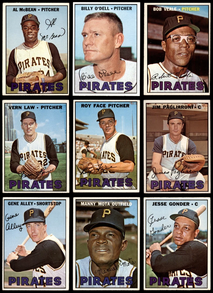 This set contains the following cards 1967 Topps #10 Matty Alou 3 - VG Front Back 1967 Topps #49 RO Roy Face 4 - VG/EX Front Back 1967 Topps #66 Manny Mota 4 - VG/EX Front Back 1967 Topps #84 Tommie Sisk 5 - EX Front Back 1967 Topps #123 - Luke Walker / Jim Price Pirates Rookies 6 - EX/MT Front Back 1967 Topps #162 Billy O'Dell 6 - EX/MT Front Back 1967 Topps #183 Jim Pagliaroni 4 - VG/EX Front Back 1967 Topps #203 Al McBean 3 - VG Front Back 1967 Topps #221 Woody Fryman 5 - EX Front Back 1967 Topps #240 - Felipe Alou / Matty Alou / Rico Carty NL Batting Leaders 6.5 - EX/MT+ Front Back 1967 Topps #283 Gene Alley 4 - VG/EX Front Back 1967 Topps #301 Jesse Gonder 4 - VG/EX Front Back 1967 Topps #322 Jose Pagan 7 - NM Front Back 1967 Topps #335 Bob Veale 4 - VG/EX Front Back 1967 Topps #351 Vern Law 3 - VG Front Back 1967 Topps #379 Jerry May 6 - EX/MT Front Back 1967 Topps #425 Pete Mikkelsen 5 - EX Front Back 1967 Topps #448 Harry Walker 4 - VG/EX Front Back This is a 1967 Topps Pittsburgh Pirates Near Team Set. Dean's Cards has designed our Near Complete Team Sets using the majority of cards for that team - leaving out the expensive super-star rookie cards, high numbers, short-prints, and multi-player rookie cards, reducing the price. the other cards can then be added, from our inventory of over a million cards, as your budget allows. For the exact cards contained in this set, as well as their front and back scans, please see the description below. Set breakdown by grade: Number of Cards in Set 18 Average Grade - Weighted by Value 5.49 - EX+ Average Grade - Unweighted 4.64 - VG/EX+ Grade Breakdown 7 - NM 1 6.5 - EX/MT+ 1 6 - EX/MT 3 5 - EX 3 4 - VG/EX 7 3 - VG 3 . This near team set contains 18 cards out of the possible 36 cards. This is not a complete set. The following cards are omitted in order to keep the cost of the set reasonable#492 Pirates Team, #602 Juan Pizarro, #592 NL Rookies - Ron Willis / Jim Shellenback, #472 Pirates Rookies - John Gelner / George Spriggs, #554 Andre Rodgers, #577 Bill Short, #242 NL RBI Leaders - Hank Aaron / Rich Allen / Roberto Clemente, #570 Maury Wills, #535 Donn Clendenon, #586 Manny Jimenez and #361 Checklist 5 - Roberto Clemente This set does not include the following cards: #527 Dennis Ribant, #400 Roberto Clemente, #266 Pitt Power - Willie Stargell / Donn Clendenon, #238 NL Strikeout Leaders - Sandy Koufax / Jim Bunning / Bob Veale, #510 Bill Mazeroski, #140 Willie Stargell, #562 Steve Blass Dean's Cards offers a 100% Money Back Satisfaction Guarantee on all purchases. Just contact us within 10 days of the purchase date and we will refund your money or, when possible, replace the cards. 1967 Topps Pittsburgh Pirates Near Team Set 5.5 - EX+ 6902189 (18 / 36 cards) If the scan in the listing says ACTUAL IMAGE, you will receive the card pictured. For cards issued after 1983, we will often use representative images and you will not receive the exact card pictured. Shipping Policy You only pay shipping on the first item. If you order multiple items on the same order, you will only be charged once for shipping. We do not combine shipping on multiple orders. To avoid multiple shipping charges we recommend using eBay's "Add to Cart" feature to check out multiple items in one transaction, or please request and allow for us to send an invoice to reflect the combined shipping charges. Canadian customers - We send all of our Canadian/International packages with tracking and cannot make any exceptions to this policy. Negotiating Prices All prices are final and we do not negotiate. This policy is to ensure that everyone knows that they are getting our best possible price. So please do not ask us to negotiate on price. Return Policy Dean's Cards has a 100% Money Back Satisfaction Guarantee on all purchases, as long as the product is returned within 30 days of receiving the product. Card Grading Each card is first reviewed by a member of our team, in order to detect any flaws that may not be visible on a scan, such as wrinkles, creases, print spots, or light stains. The vast majority of our vintage cards are professionally graded by the Dean's Cards Grading Software and include a 100% satisfaction guarantee. Our grading is on par with PSA standards when it comes to corners, centering and flaws - and tends to grade a bit tougher than PSA, on cards with a tilted image or rough edges. This grading software was developed to provide far better grading and consistency than can be achieved using the human eye. Determining the card's grade The sharpness of the corners and the degree to which a card was cut off-center determines the maximum possible grade that the card can receive. The card's grade is further reduced by any flaws or blemishes that it may have. Each card is evaluated on the following characteristics and assigned a score. Corners - Each corner of a card is individually analyzed, and then assigned a score on how square, sharp, and flawless it appears. Centering - The borders are measured, at multiple points along the edge, to determine the horizontal and vertical centering and tilt. Defects - The card is examined for imperfections, such as: size, print flaws, dings, stains, creases, or other wear which could lower its grade. Bonus for Perfect Centering - A vintage card, with near perfect centering, is given a one-half grade bonus. So when you buy one of our cards with a half-grade (e.g. 3.5 or 6.5) it will appear perfectly centered, both vertically and horizontally. Grading Criteria Worst Corner - A card can grade only as high as the worst corner will allow. Average Corner Tilt - The difference in width of a card border near the top, compared to the bottom. OCT - The sum of how far a card is Off-Center, plus its Tilt. Minimum Centering Requirements Eye Appeal - The combination of a card's centering, corners and tilt. Well-Centered - Cards that appear perfectly centered receive a bonus of one-half grade. Flaws, defects and other imperfections - can lower a c
