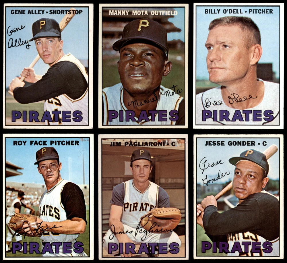 This set contains the following cards 1967 Topps #49 RO Roy Face 5 - EX Front Back 1967 Topps #66 Manny Mota 5 - EX Front Back 1967 Topps #84 Tommie Sisk 7 - NM Front Back 1967 Topps #123 - Luke Walker / Jim Price Pirates Rookies 6 - EX/MT Front Back 1967 Topps #162 Billy O'Dell 6 - EX/MT Front Back 1967 Topps #183 Jim Pagliaroni 4 - VG/EX Front Back 1967 Topps #221 Woody Fryman 6 - EX/MT Front Back 1967 Topps #240 - Felipe Alou / Matty Alou / Rico Carty NL Batting Leaders 7 - NM Front Back 1967 Topps #283 Gene Alley 4 - VG/EX Front Back 1967 Topps #301 Jesse Gonder 4 - VG/EX Front Back 1967 Topps #322 Jose Pagan 7 - NM Front Back 1967 Topps #335 Bob Veale 6 - EX/MT Front Back 1967 Topps #351 Vern Law 8 - NM/MT Front Back 1967 Topps #379 Jerry May 6 - EX/MT Front Back 1967 Topps #425 Pete Mikkelsen 6 - EX/MT Front Back This is a 1967 Topps Pittsburgh Pirates Near Team Set. Dean's Cards has designed our Near Complete Team Sets using the majority of cards for that team - leaving out the expensive super-star rookie cards, high numbers, short-prints, and multi-player rookie cards, reducing the price. the other cards can then be added, from our inventory of over a million cards, as your budget allows. For the exact cards contained in this set, as well as their front and back scans, please see the description below. Set breakdown by grade: Number of Cards in Set 15 Average Grade - Weighted by Value 6.82 - NM Average Grade - Unweighted 5.80 - EX/MT Grade Breakdown 8 - NM/MT 1 7 - NM 3 6 - EX/MT 6 5 - EX 2 4 - VG/EX 3 . This near team set contains 15 cards out of the possible 36 cards. This is not a complete set. The following cards are omitted in order to keep the cost of the set reasonable#492 Pirates Team, #602 Juan Pizarro, #592 NL Rookies - Ron Willis / Jim Shellenback, #472 Pirates Rookies - John Gelner / George Spriggs, #554 Andre Rodgers, #577 Bill Short, #242 NL RBI Leaders - Hank Aaron / Rich Allen / Roberto Clemente, #570 Maury Wills, #535 Donn Clendenon, #586 Manny Jimenez and #361 Checklist 5 - Roberto Clemente Dean's Cards offers a 100% Money Back Satisfaction Guarantee on all purchases. Just contact us within 10 days of the purchase date and we will refund your money or, when possible, replace the cards. 1967 Topps Pittsburgh Pirates Near Team Set 7 - NM 6902186 (15 / 36 cards) If the scan in the listing says ACTUAL IMAGE, you will receive the card pictured. For cards issued after 1983, we will often use representative images and you will not receive the exact card pictured. Shipping Policy You only pay shipping on the first item. If you order multiple items on the same order, you will only be charged once for shipping. We do not combine shipping on multiple orders. To avoid multiple shipping charges we recommend using eBay's "Add to Cart" feature to check out multiple items in one transaction, or please request and allow for us to send an invoice to reflect the combined shipping charges. Canadian customers - We send all of our Canadian/International packages with tracking and cannot make any exceptions to this policy. Negotiating Prices All prices are final and we do not negotiate. This policy is to ensure that everyone knows that they are getting our best possible price. So please do not ask us to negotiate on price. Return Policy Dean's Cards has a 100% Money Back Satisfaction Guarantee on all purchases, as long as the product is returned within 30 days of receiving the product. Card Grading Each card is first reviewed by a member of our team, in order to detect any flaws that may not be visible on a scan, such as wrinkles, creases, print spots, or light stains. The vast majority of our vintage cards are professionally graded by the Dean's Cards Grading Software and include a 100% satisfaction guarantee. Our grading is on par with PSA standards when it comes to corners, centering and flaws - and tends to grade a bit tougher than PSA, on cards with a tilted image or rough edges. This grading software was developed to provide far better grading and consistency than can be achieved using the human eye. Determining the card's grade The sharpness of the corners and the degree to which a card was cut off-center determines the maximum possible grade that the card can receive. The card's grade is further reduced by any flaws or blemishes that it may have. Each card is evaluated on the following characteristics and assigned a score. Corners - Each corner of a card is individually analyzed, and then assigned a score on how square, sharp, and flawless it appears. Centering - The borders are measured, at multiple points along the edge, to determine the horizontal and vertical centering and tilt. Defects - The card is examined for imperfections, such as: size, print flaws, dings, stains, creases, or other wear which could lower its grade. Bonus for Perfect Centering - A vintage card, with near perfect centering, is given a one-half grade bonus. So when you buy one of our cards with a half-grade (e.g. 3.5 or 6.5) it will appear perfectly centered, both vertically and horizontally. Grading Criteria Worst Corner - A card can grade only as high as the worst corner will allow. Average Corner Tilt - The difference in width of a card border near the top, compared to the bottom. OCT - The sum of how far a card is Off-Center, plus its Tilt. Minimum Centering Requirements Eye Appeal - The combination of a card's centering, corners and tilt. Well-Centered - Cards that appear perfectly centered receive a bonus of one-half grade. Flaws, defects and other imperfections - can lower a card's grade. Card Backs - the above criteria is also considered, for the back of the cards, but does not inflict as severe of a penalty to its grade. Packaging Once scanned, the cards are placed in "soft" sleeves, which have an open top for easy removal. The Dean's Cards label is placed on the top back of the card sleeve. Every card you buy features a QR Code that you can scan to see your ACTUAL CARD and its grading statisti