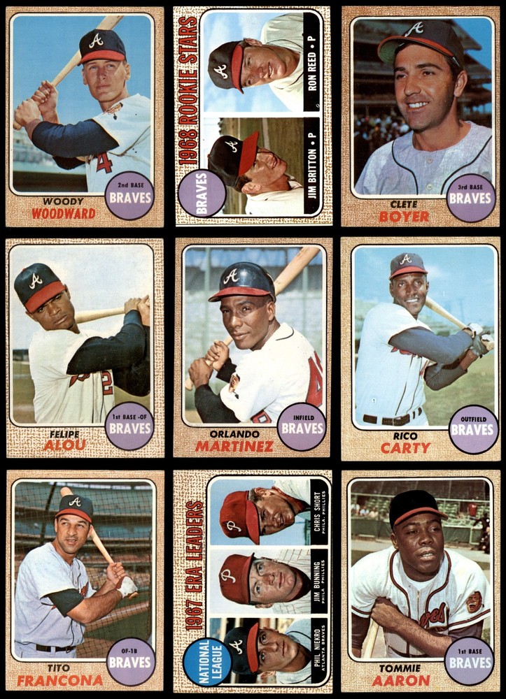 This 1968 Topps Braves team set is a fantastic piece of baseball history! Loved the mix of legends like Hank Aaron and Joe Torre alongside rising stars. The cards are in solid VG/EX condition with great vintage appeal. The NL leader cards featuring Aaron, Clemente, and others are especially cool. Perfect for any Braves fan or vintage collector—definitely worth adding to your collection!