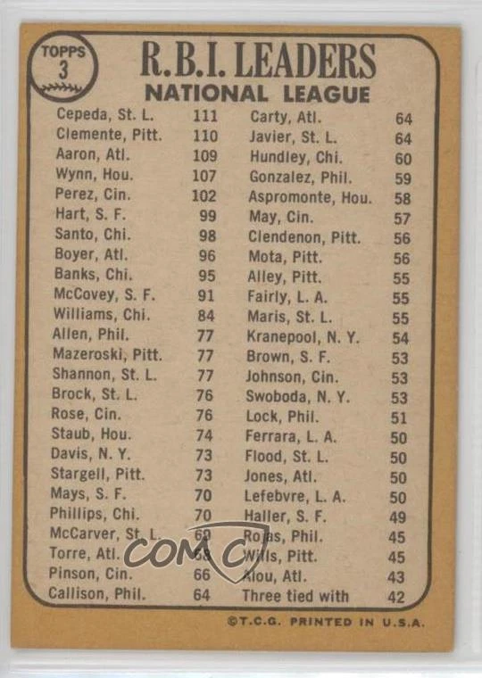 1968 Topps League Leaders Orlando Cepeda Roberto Clemente Hank Aaron #3 HOF