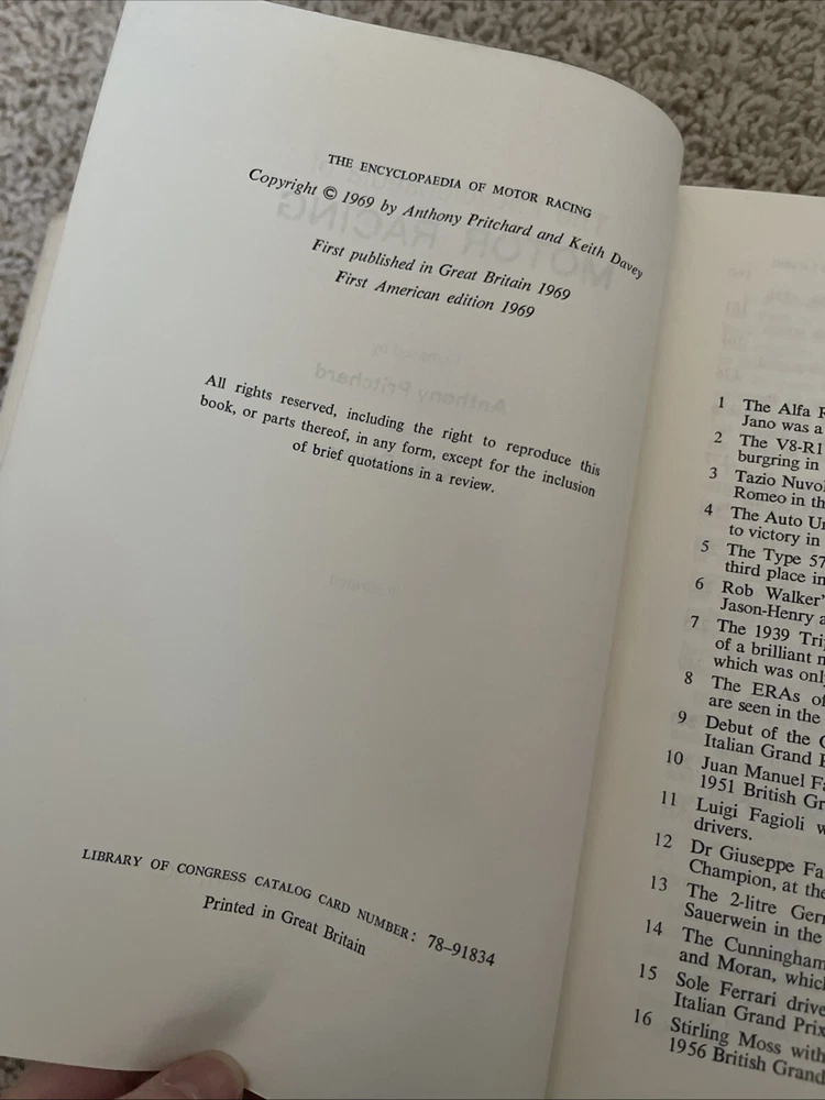 Dive into the thrilling world of motor racing with "The Encyclopedia of Motor Racing" by Anthony Pritchard and Keith Davey. A treasure for enthusiasts and historians alike, this 1969 first edition is an authoritative guide to the exhilarating realm of auto racing. With its comprehensive content and captivating illustrations, it's a must-have for any serious collector or fan of the genre. This hardcover gem, published by David McKay, boasts a dust jacket that adds to its charm and historical value. The book is replete with enthralling accounts and insightful information, making it an exceptional find for those passionate about motor sports. Its place in the annals of literature is secured by its originality, and it's sure to be a standout addition to any library.