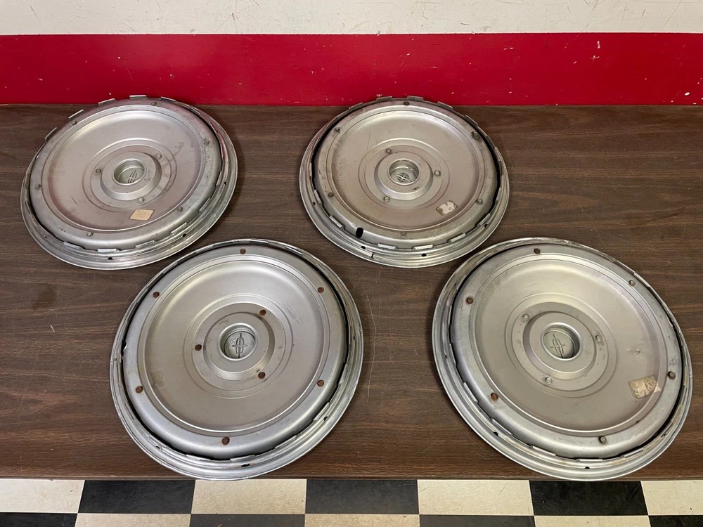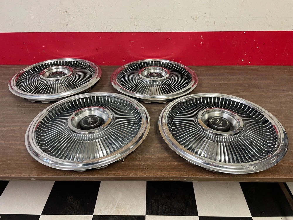 1970 1971 1972 1973 LINCOLN CONTINENTAL MARK DELUXE HUBCAPS SET OF 4 15" ALL HAVE NICE SHINE NICE CENTER EMBLEMS, SOME IMPERFECTIONS HAVE SCRAPES, SCRATCHES, BLISTERS, PITTING,TARNISH SPOTS, DINGS, SMALL DENTS THERE IS A SMALL RIP BETWEEN FINS...SEE PICS SEE ALL PICS SEE OUR OTHER ITEMS MAKE SURE THIS IS CORRECT FOR YOUR RIDE BEFORE YOU BID EMAIL WITH QUESTIONS......SOLD AS IS.....NO RESERVE