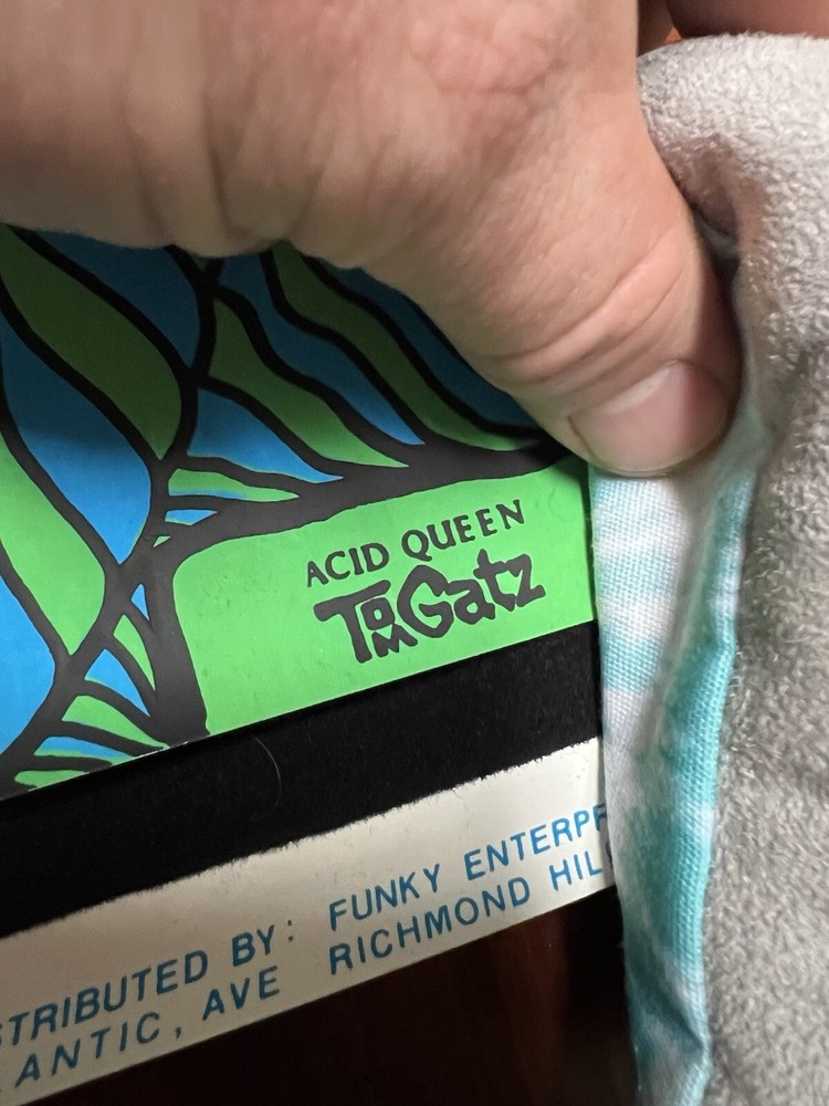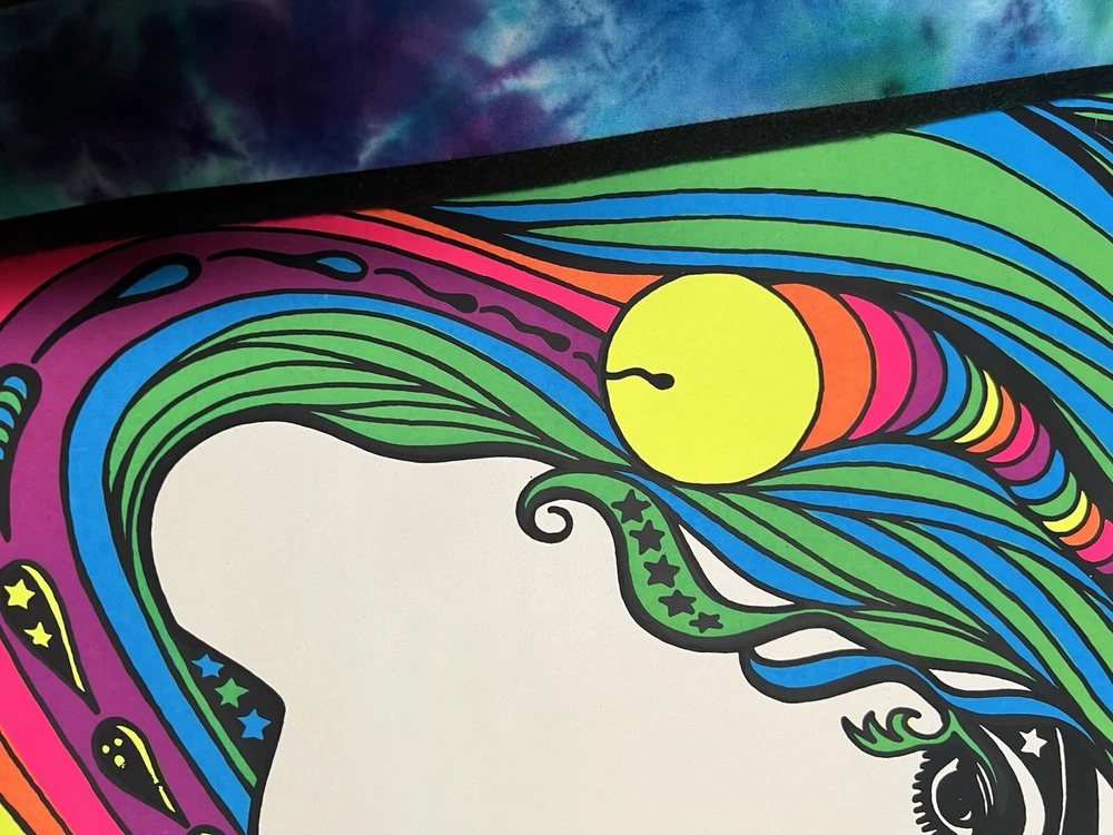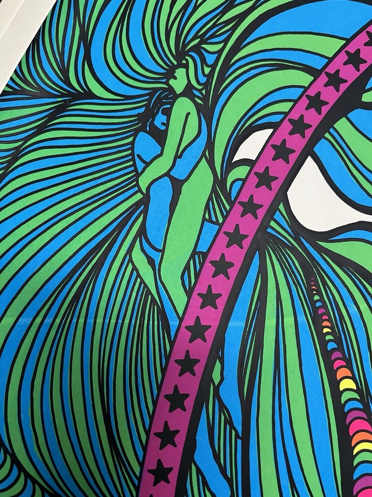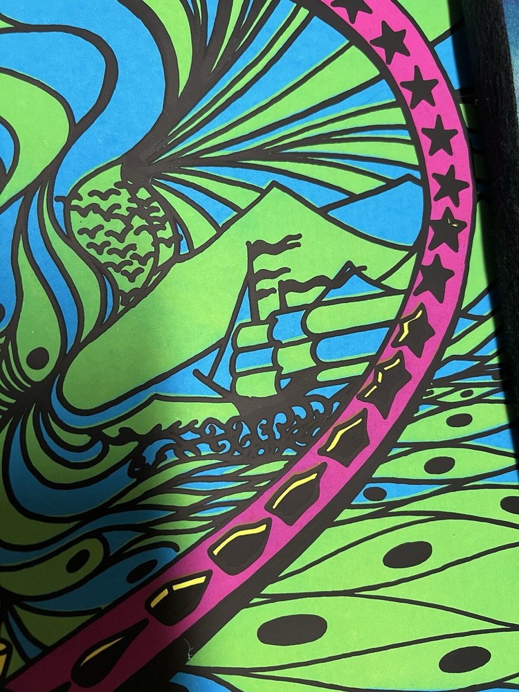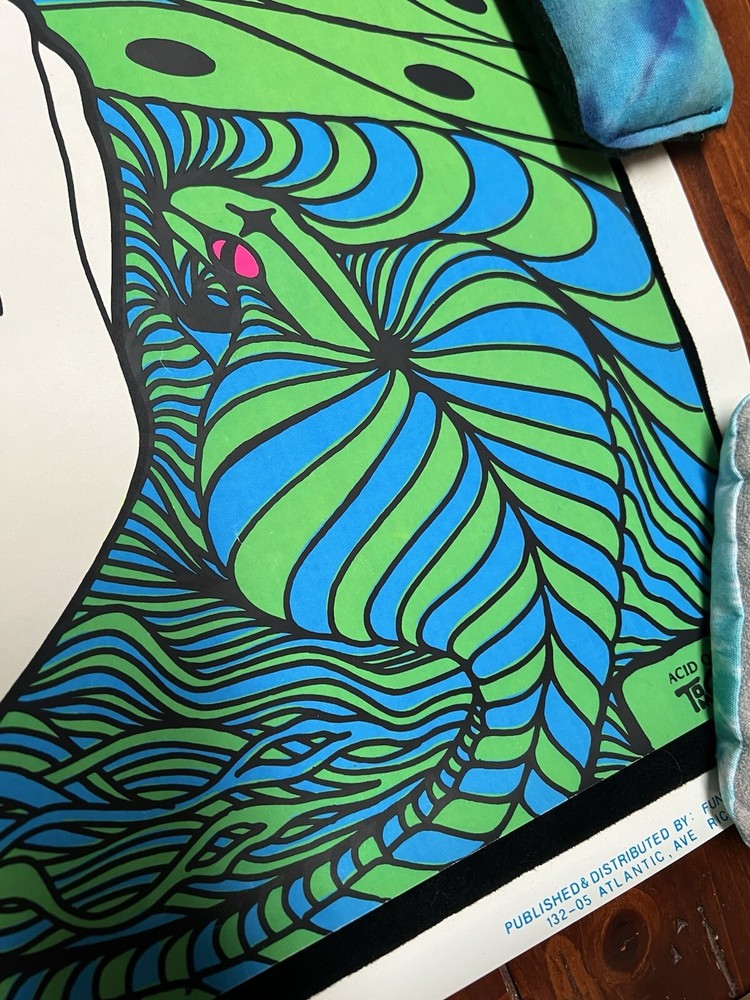 This silkscreen “headshop poster” was made by Pro Arts Inc. in Medina Ohio and is dated 1970. The silkscreen process lets the artist really pour on the paint for a vibrant rich color effect but with silkscreens this old there is also some cracking of the paint. There is little scholarship about headshop posters and they were frequently printed in small batches as demand required and so these is not way to tell what printing this poster is. Given that few of these posters lasted even a decade, it’s a wonder than ANY are left at all. The central image of the "queen" was taken from a 1969 photo of Grace Slick by Joe Sia. Did Pro Arts actually license the image from Sia? Not sure will be ablr to find out because he passed away in 2003 and the poster artist, Tom Gatz died a year before that. Artist Tom Gatz was born in Detroit in 1943. He served in the Air Force Vietnam and came back and settled in Kent Ohio where for a few years in the early 1970s produced psychedelic posters for Pro Arts Inc. in Media Ohio. He moved to St. Petersburg Florida in 1972 where, as an airbrush artist, he ran his on firm, Airbrush by Atom at John’s Pass in Madeira Beach FL. He was a musician and drummer and was a member of the Musicians Union in Tampa. This image – which has been reprinted on cardboard and in smaller sizes – has plenty of hidden treasures including a couple making love, a ship to new lands, peacock feathers, an eyeball and maybe more. The Acid Queen herself, from the song on the Who’s Tommy, is smoking a classic chamber pipe, small for concealment and often with a screw-on top. [we know this from hearsay, of course…]