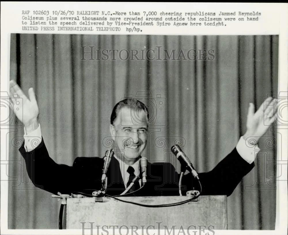 ebay template Note: Please study the images carefully to determine the condition of this vintage photograph, as it may not be in perfect condition. It may contain wrinkles, cracks, and possibly even tears due to its age and how it was handled before it got to us. A scanner may interpret colors and contrast differently than human eyes will, so it is possible that the actual photograph may be slightly darker or lighter in person. This vintage photograph is offered for sale as a collectible item and conveys no transfer of copyright. 1970 Press Photo Spiro Agnew waves to supporters at rally in North Carolina This is an original press photo. Raleigh, North Carolina. More than 7,000 cheering Republican jammed Reynolds Coliseum plus several thousand more crowded around outside the coliseum were on hand to listen to the speech delivered by Vice President Spiro Agnew here tonight.Photo measures 10 x 8.25inches. Photo is dated 10-26-1970. PHOTO FRONT PHOTO BACK Historic Images Part Number: kfa27913 FAQs Q: Can I just download a digital version instead? A: No, we sell only vintage originals and do not make or distribute any copies, including digital ones. Q: Do you combine shipping and invoices? A: Multiple photos won on the same seller ID combine automatically through the eBay checkout process. If you encounter problems with this, send us a message via eBay messaging and we will send you an invoice. Due to eBay limitations, we cannot combine items won on our different seller IDs for a single shipping charge. Q: How quickly do you ship the items once paid? A: We ship within one business day after your payment clears. If you do not receive an "order shipped" email from us by the close of the second business day from submitting payment, please e-mail us via eBay messaging. Q: How do you make sure my photograph arrives safely? A: We package each order between two cross-corrugated pieces of cardboard to ensure that the package is as difficult to bend as possible. We then wrap each order in a plastic sheet to help protect against moisture. We want you to rest assured that we take every precaution to ensure that the photograph you receive will be in the same condition in your care as it was in ours. Q: Will the "Historic Images" watermark be on my photo when I receive it? A: No. This is a digital watermark we use to protect our images. It is not printed on the photo. Q: What are your office hours? A: eBay for us is a business, and a very fun one to be in! We are open M-F 9 to 5 (CST). Therefore, we do not return e-mails and phone calls over the weekend. We observe the following holidays: New Years Day, Memorial Day, Fourth of July, Labor Day, Thanksgiving and the day after Thanksgiving, Christmas Eve and Christmas Day. Q: Where did all these vintage photos come from? A: These original vintage photographs are from various news service and newspaper photo archives from locations around the country including: Boston, Detroit, Tampa, Chicago, Denver, Seattle, New Orleans, Milwaukee, Portland, Spokane, and more. We do not copy or reproduce any photographs -- every item is a unique vintage piece that was housed in a news archive. Q: Can I use this photograph in my book/blog/website? A: The short answer is no. There is no transfer of copyright for republication or reproduction with these photographs when you purchase them, and only photographs taken before 1923 are currently automatically in the public domain. Permission from the copyright holder, which usually can be identified from the back of each photo, must be sought to republish or reproduce the image for any purpose. Q: Do you relist items (in case I miss an auction ending)? A: Auction items that receive no bids are relisted in our store (historicimages-store on eBay) as a fixed-price item and at a higher price than the starting auction price. Q: Do you leave feedback? A: Yes, we always leave feedback for buyers. Our software monitors when our buyers leave us feedback, then notifies us that we can leave feedback for the buyer. Rest assured, if you leave feedback, we will do the same! Check out our family of eBay IDs: historicimages01 Sports Photos historicimages02 Entertainment Photos historicimages03 Americana Photos historicimages04 International & War Photos historicimages05 Transportation Photos historicimages06 Photos of All Subjects historicimages07 Entertainment Photos historicimages08 Newsworthy Photos historicimages09 Entertainment Photos historicimages10 Sports Photos historicimages-store Our largest fixed-price selection historicimages-gallery Hand-picked photos Saturday night auctions About Us Historic Images was formed in September 2009, with a handful of scanners working out of a basement to digitize newspaper photo archives. We have since moved out of the basement, and we can now archive thousands of photos per day. Our company has worked with magazines and newspapers from Detroit, Boston, Denver, Seattle, Tampa, Chicago, and New Orleans, just to name a few. We are constantly adding to our inventory, and have assembled an archive of millions of photos to date. As our company evolved, we began our eBay business, which brings thousands of fresh auctions per week to the world's largest online auction marketplace. Our custom software systems and team of great employees allow us to efficiently scan and sell large photo archives online. At the very core of our company's DNA is a strong commitment to customer satisfaction and strict integrity for our product. Our promise to you is that we will do everything in our power to provide you a great buying experience. Copyright 2009 - Present, Historic Images, Inc. Sell Smarter with Kyozou. Inventory and Ecommerce Management