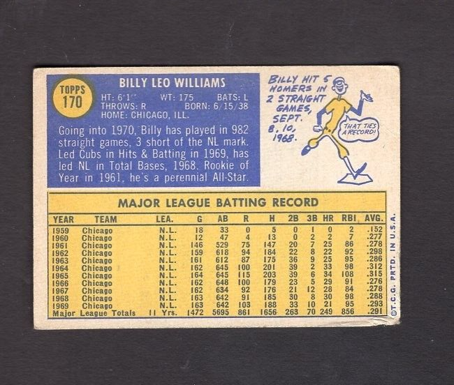 1970 Topps # 170 Billy Williams in fair condition with bottom right corner wear and top left corner crease. SHIPPING IS FREE. Please check out the many other Topps Baseball Stars & High # cards I have available in my e-bay store. If you think you might buy multiple items from any seller that offers combined shipping, use the "Add To Cart" option under the "Buy It Now" button instead of the buy-it-now, and this will combine your purchases into one shipping charge as you add more items to your cart and purchase. Only make your payment after you have added all the items you want into your cart - you should then see that there is one charge for shipping when you go to make your payment. . (H&S, 02-14, #202 /3)