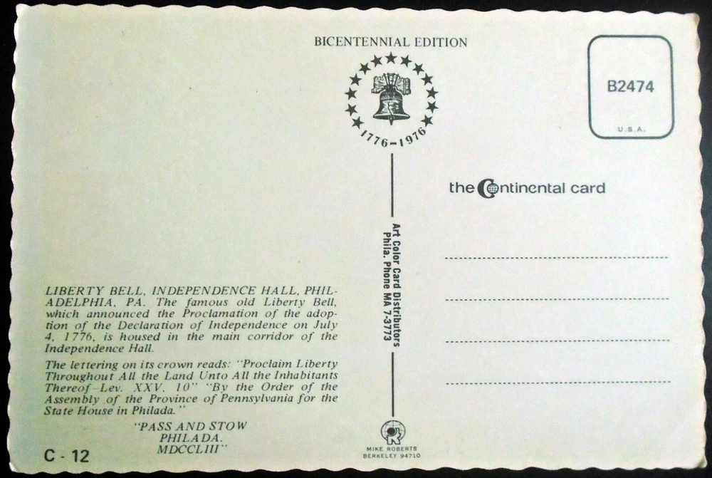 C10503. CATEGORY: Pennsylvania TYPE: Color Postcard – Continental (Chrome) DESCRIPTION: Back: “Liberty Bell, Independence Hall, Philadelphia, PA. The famous old Liberty Bell which announced the Proclamation of the adoption of the Declaration of Independence on July 4, 1776, is housed in the main corridor of the Independence Hall. The lettering on its crown reads, “Proclaim Liberty Throughout All the Land unto All the Inhabitants Thereof – Lev. XXV, 10” – “By the Order of the Assembly of the Province of Pennsylvania for the State House of Philada.” – “Pass and Stow, Philade. MDCCLIII”. CONDITION: Not Used or mailed . Minor corner and edge wear. Light soiling and age tanning. Very Good condition. … Sold AS IS. Look carefully at the pictures to Judge Condition for Yourself. Please pay for your order after Combining ALL ITEMS on one invoice! This saves both of us money! You save on S/H charges and I save on fees! If you plan to purchase multiple items, just put all the items you want into your Ebay cart, then press “REQUEST TOTAL” and I will be able to invoice you with combined shipping. Make sure you’re purchasing via computer, as this option is not available when buying with your phone. Once you have purchased an item and we have wrapped it for shipping, additional items CANNOT be added, and must be shipped separately. All postcards, vintage paper items and historical memorabilia are packaged with cardboard.