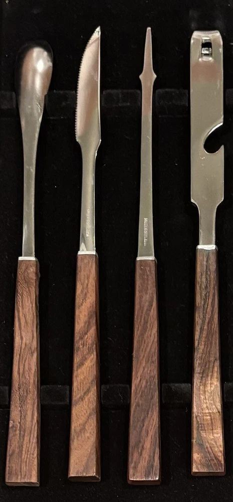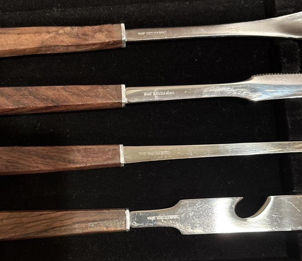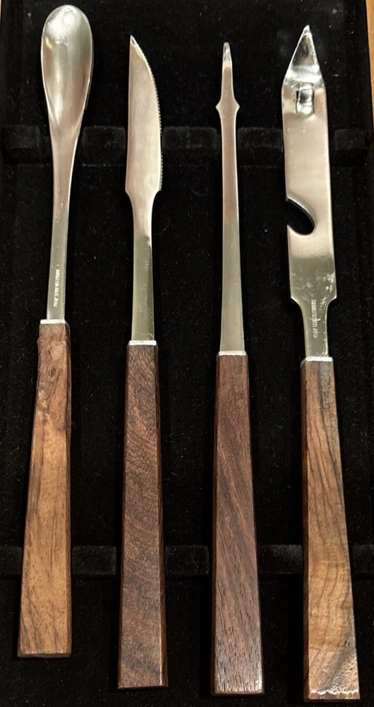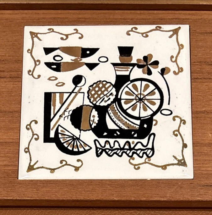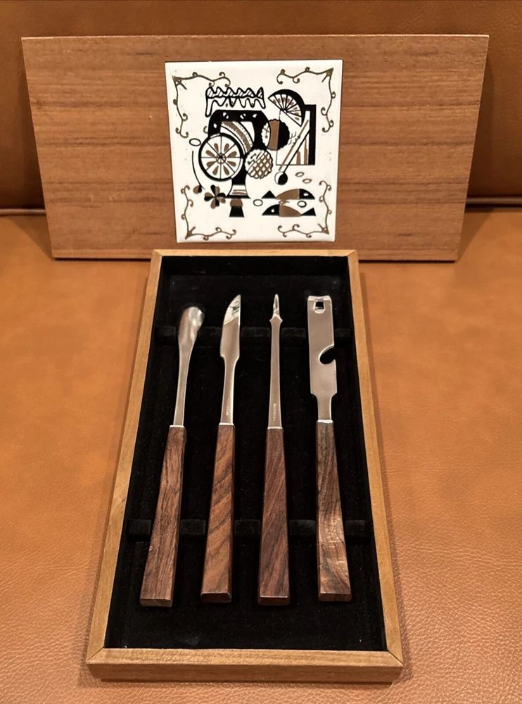 1970’s VTG Bar Tool Set W/Tile Black & Gold Design & Cutting Board 4 Piece Set. Condition is Used. Shipped with USPS Ground Advantage.