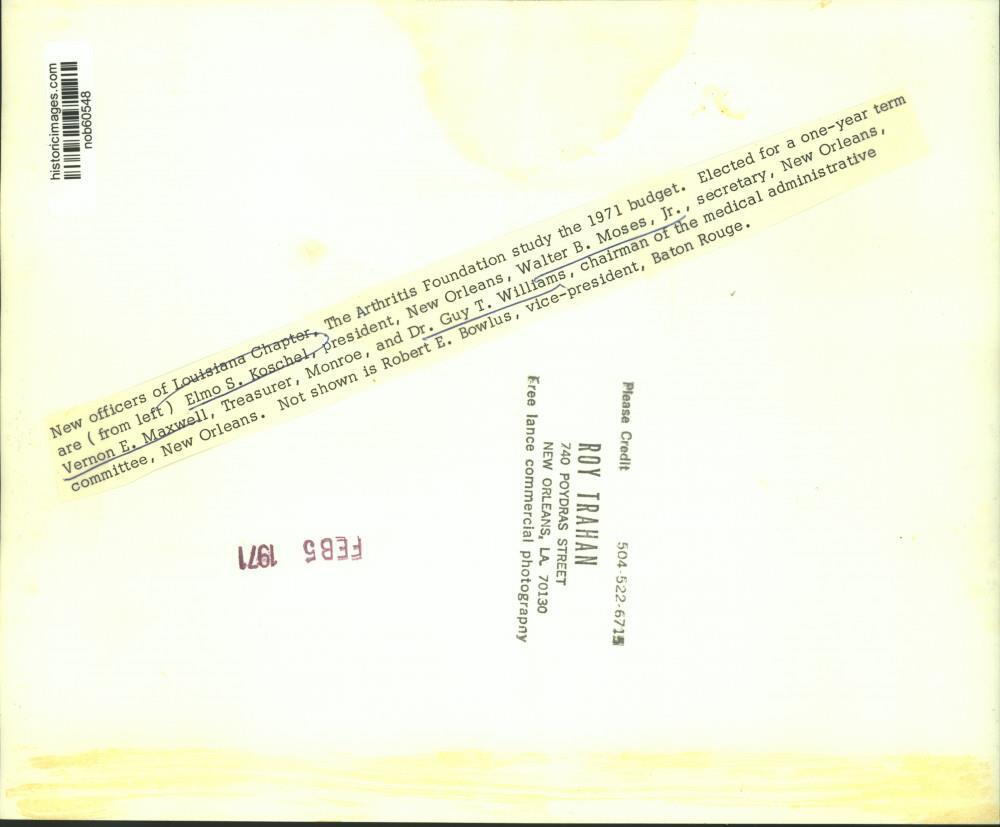 ebay template Note: Please study the images carefully to determine the condition of this vintage photograph, as it may not be in perfect condition. It may contain wrinkles, cracks, and possibly even tears due to its age and how it was handled before it got to us. A scanner may interpret colors and contrast differently than human eyes will, so it is possible that the actual photograph may be slightly darker or lighter in person. This vintage photograph is offered for sale as a collectible item and conveys no transfer of copyright. 1971 Press Photo New officers of the Louisiana Arthritis Foundation for 1971. This is an original press photo. New officers of Louisiana Chapter, The Arthritis Foundation study the 1971 budget. Elected for a one-year term are Elmo S. Koschel, president, New Orleans; Walter B. Moses, Jr., secretary, New Orleans; Vernon E. Maxwell, Treasurer, Monroe, and Dr. Guy T. Williams, chairman of the medical administrative committee, New Orleans. Not shown is Robert E. Bowlus, vice-president, Baton Rouge. Photo measures 10 x 8.25 inches. Photo is dated 02-05-1971. PHOTO FRONT PHOTO BACK Historic Images Part Number: nob60548 Sell Smarter with Kyozou. Inventory and Ecommerce Management