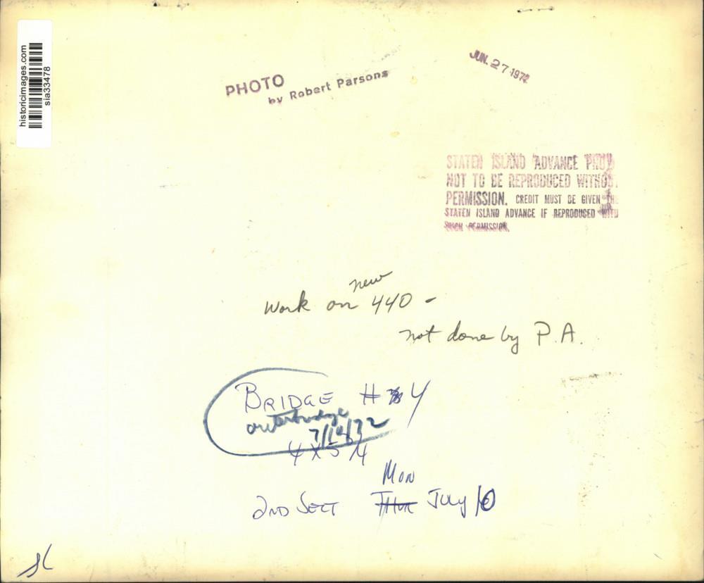 ebay template Note: Please study the images carefully to determine the condition of this vintage photograph, as it may not be in perfect condition. It may contain wrinkles, cracks, and possibly even tears due to its age and how it was handled before it got to us. A scanner may interpret colors and contrast differently than human eyes will, so it is possible that the actual photograph may be slightly darker or lighter in person. This vintage photograph is offered for sale as a collectible item and conveys no transfer of copyright. 1972 Press Photo Construction work on new 440 showing outerbridge approach This is an original press photo. Construction work continues on new 440, not done by P.A., showing outerbridge approachPhoto measures 10 x 8.25inches. Photo is dated 06-27-1972. PHOTO FRONT PHOTO BACK Historic Images Part Number: sia33478 Sell Smarter with Kyozou. Inventory and Ecommerce Management
