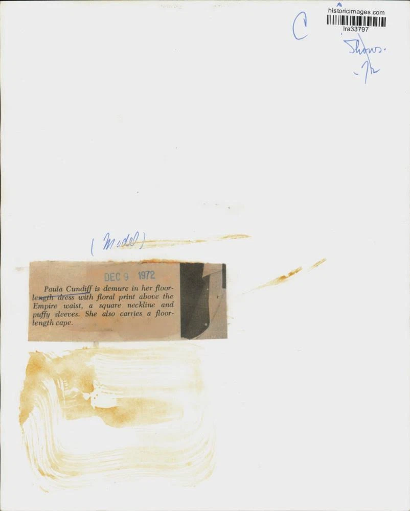 ebay template Note: Please study the images carefully to determine the condition of this vintage photograph, as it may not be in perfect condition. It may contain wrinkles, cracks, and possibly even tears due to its age and how it was handled before it got to us. A scanner may interpret colors and contrast differently than human eyes will, so it is possible that the actual photograph may be slightly darker or lighter in person. This vintage photograph is offered for sale as a collectible item and conveys no transfer of copyright. 1972 Press Photo Paula Cundiff models floor-length dress with floral print top This is an original press photo. Model - Paula Cundiff is demure in her floor-length dress with floral print above the Empire waist, a square neckline and puffy sleeves. She also carries a floor-length capePhoto measures 8.25 x 10inches. Photo is dated 12-09-1972. PHOTO FRONT PHOTO BACK Historic Images Part Number: lra33797 Sell Smarter with Kyozou. Inventory and Ecommerce Management