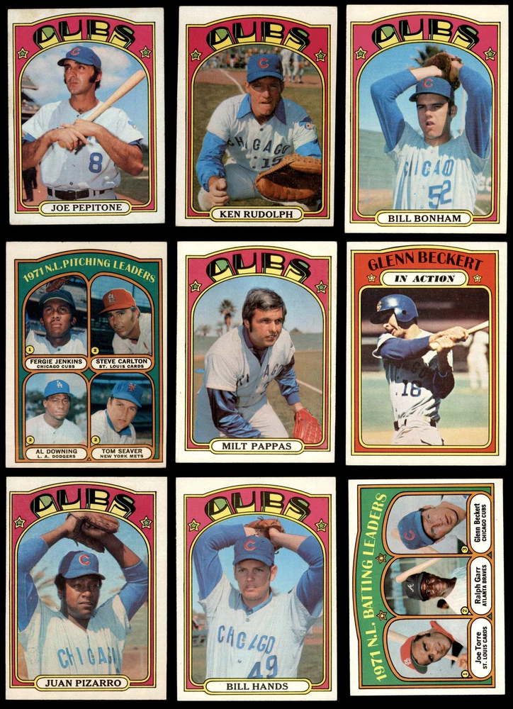 This set contains the following cards 1972 Topps #18 YLW Juan Pizarro 4 - VG/EX Front Back 1972 Topps #29 YLW Bill Bonham 7 - NM Front Back 1972 Topps #45 YLW Glenn Beckert 3 - VG Front Back 1972 Topps #46 - Glenn Beckert In Action 4 - VG/EX Front Back 1972 Topps #61 - Burt Hooton / Gene Hiser / Earl Stephenson Cubs Rookies 8 - NM/MT Front Back 1972 Topps #85 - Glenn Beckert / Ralph Garr / Joe Torre NL Batting Leaders 6 - EX/MT Front Back 1972 Topps #93 - Steve Carlton / Fergie Jenkins / Tom Seaver / Al Downing NL Pitching Leaders 4 - VG/EX Front Back 1972 Topps #95 - Fergie Jenkins / Tom Seaver / Bil Stoneman NL Strikeout Leaders 5 - EX Front Back 1972 Topps #145 Don Kessinger 7 - NM Front Back 1972 Topps #192 Cubs Team 7 - NM Front Back 1972 Topps #208 Milt Pappas 5 - EX Front Back 1972 Topps #258 Randy Hundley 7 - NM Front Back 1972 Topps #271 Ken Rudolph 4 - VG/EX Front Back 1972 Topps #303 Joe Pepitone 4 - VG/EX Front Back 1972 Topps #304 - Joe Pepitone In Action 6 - EX/MT Front Back 1972 Topps #335 Bill Hands 7 - NM Front Back 1972 Topps #364 Johnny Callison 7 - NM Front Back 1972 Topps #485 Phil Regan 4 - VG/EX Front Back 1972 Topps #512 Paul Popovich 8 - NM/MT Front Back This is a 1972 Topps Chicago Cubs Near Team Set. Dean's Cards has designed our Near Complete Team Sets using the majority of cards for that team - leaving out the expensive super-star rookie cards, high numbers, short-prints, and multi-player rookie cards, reducing the price. the other cards can then be added, from our inventory of over a million cards, as your budget allows. For the exact cards contained in this set, as well as their front and back scans, please see the description below. Set breakdown by grade: Number of Cards in Set 19 Average Grade - Weighted by Value 6.47 - EX/MT+ Average Grade - Unweighted 5.63 - EX+ Grade Breakdown 8 - NM/MT 2 7 - NM 6 6 - EX/MT 2 5 - EX 2 4 - VG/EX 6 3 - VG 1 . This near team set contains 19 cards out of the possible 35 cards. This is not a complete set. This set does not include the following cards: #684 Hal Breeden, #439 Billy Williams, #667 Ray Newman, #757 Traded - Jose Cardenal, #666 Hector Torres, #410 Fergie Jenkins, #612 Joe Decker, #576 Leo Durocher, #730 Rick Monday, #534 Jim Hickman GRN, #766 Steve Hamilton, #639 J.C. Martin, #555 Ron Santo, #117 Cleo James YLW, #556 In Action - Ron Santo, #440 In Action - Billy Williams Dean's Cards offers a 100% Money Back Satisfaction Guarantee on all purchases. Just contact us within 10 days of the purchase date and we will refund your money or, when possible, replace the cards. 1972 Topps Chicago Cubs Near Team Set 6.5 - EX/MT+ 6908771 (19 / 35 cards) If the scan in the listing says ACTUAL IMAGE, you will receive the card pictured. For cards issued after 1983, we will often use representative images and you will not receive the exact card pictured. Shipping Policy You only pay shipping on the first item. If you order multiple items on the same order, you will only be charged once for shipping. We do not combine shipping on multiple orders. To avoid multiple shipping charges we recommend using eBay's "Add to Cart" feature to check out multiple items in one transaction, or please request and allow for us to send an invoice to reflect the combined shipping charges. Canadian customers - We send all of our Canadian/International packages with tracking and cannot make any exceptions to this policy. Negotiating Prices All prices are final and we do not negotiate. This policy is to ensure that everyone knows that they are getting our best possible price. So please do not ask us to negotiate on price. Return Policy Dean's Cards has a 100% Money Back Satisfaction Guarantee on all purchases, as long as the product is returned within 30 days of receiving the product. Card Grading Each card is first reviewed by a member of our team, in order to detect any flaws that may not be visible on a scan, such as wrinkles, creases, print spots, or light stains. The vast majority of our vintage cards are professionally graded by the Dean's Cards Grading Software and include a 100% satisfaction guarantee. Our grading is on par with PSA standards when it comes to corners, centering and flaws - and tends to grade a bit tougher than PSA, on cards with a tilted image or rough edges. This grading software was developed to provide far better grading and consistency than can be achieved using the human eye. Determining the card's grade The sharpness of the corners and the degree to which a card was cut off-center determines the maximum possible grade that the card can receive. The card's grade is further reduced by any flaws or blemishes that it may have. Each card is evaluated on the following characteristics and assigned a score. Corners - Each corner of a card is individually analyzed, and then assigned a score on how square, sharp, and flawless it appears. Centering - The borders are measured, at multiple points along the edge, to determine the horizontal and vertical centering and tilt. Defects - The card is examined for imperfections, such as: size, print flaws, dings, stains, creases, or other wear which could lower its grade. Bonus for Perfect Centering - A vintage card, with near perfect centering, is given a one-half grade bonus. So when you buy one of our cards with a half-grade (e.g. 3.5 or 6.5) it will appear perfectly centered, both vertically and horizontally. Grading Criteria Worst Corner - A card can grade only as high as the worst corner will allow. Average Corner Tilt - The difference in width of a card border near the top, compared to the bottom. OCT - The sum of how far a card is Off-Center, plus its Tilt. Minimum Centering Requirements Eye Appeal - The combination of a card's centering, corners and tilt. Well-Centered - Cards that appear perfectly centered receive a bonus of one-half grade. Flaws, defects and other imperfections - can lower a card's grade. Card Backs - the above criteria is also considered, for the back of the cards